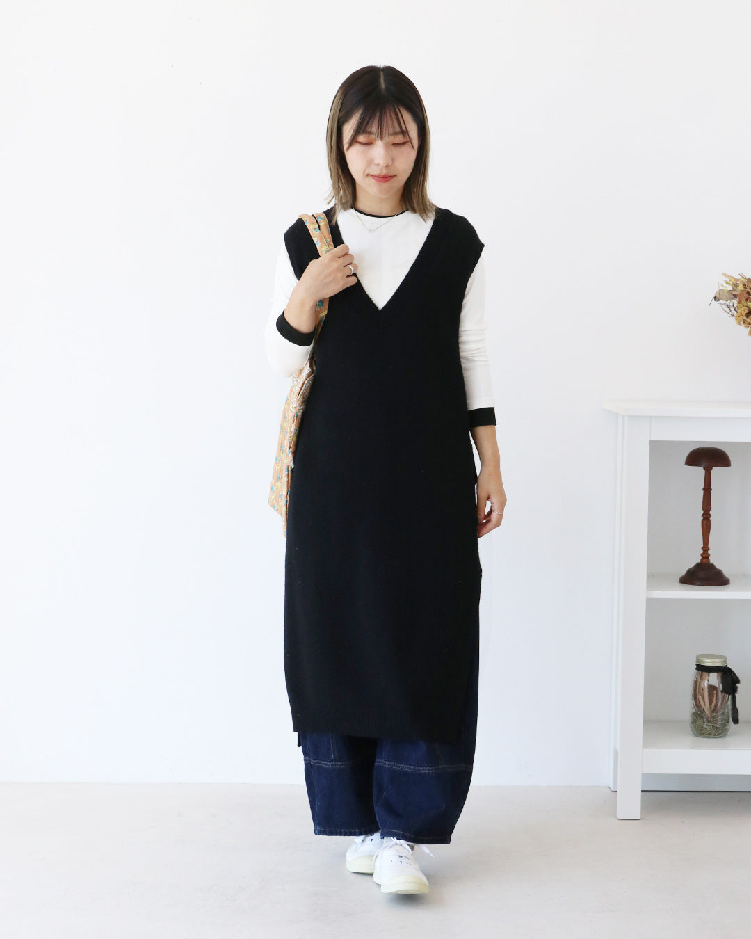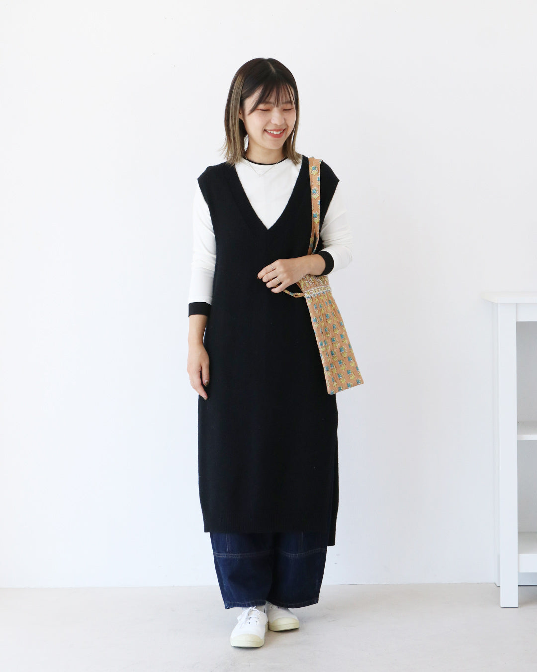ロングニットベストにデニムを重ねたリラックスコーデ。