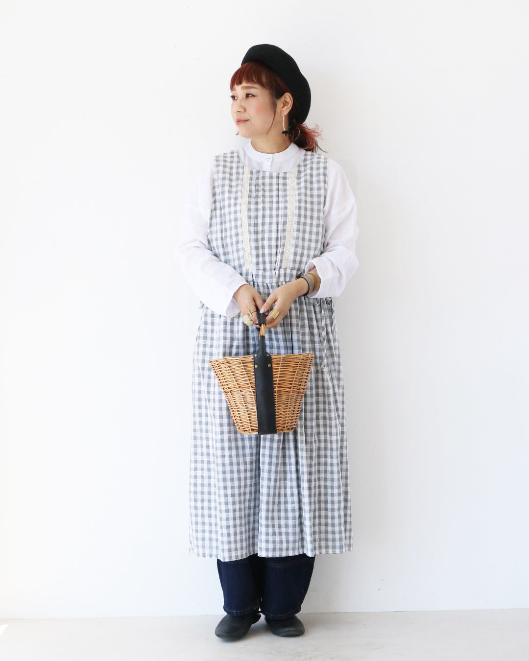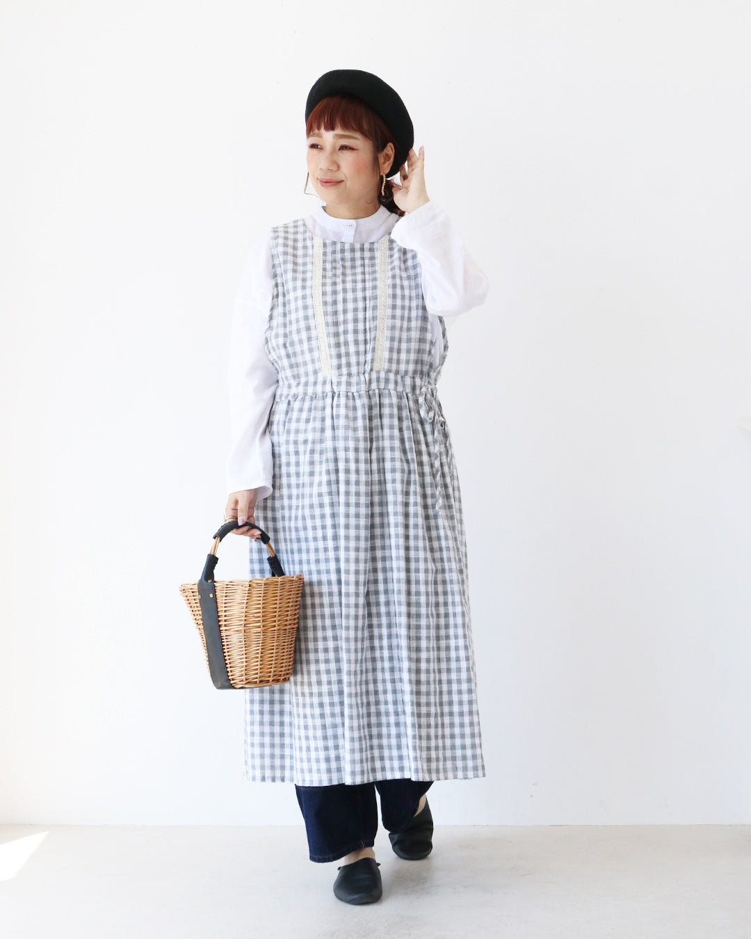 淡いチェック柄が優しい印象のワンピースコーデ。