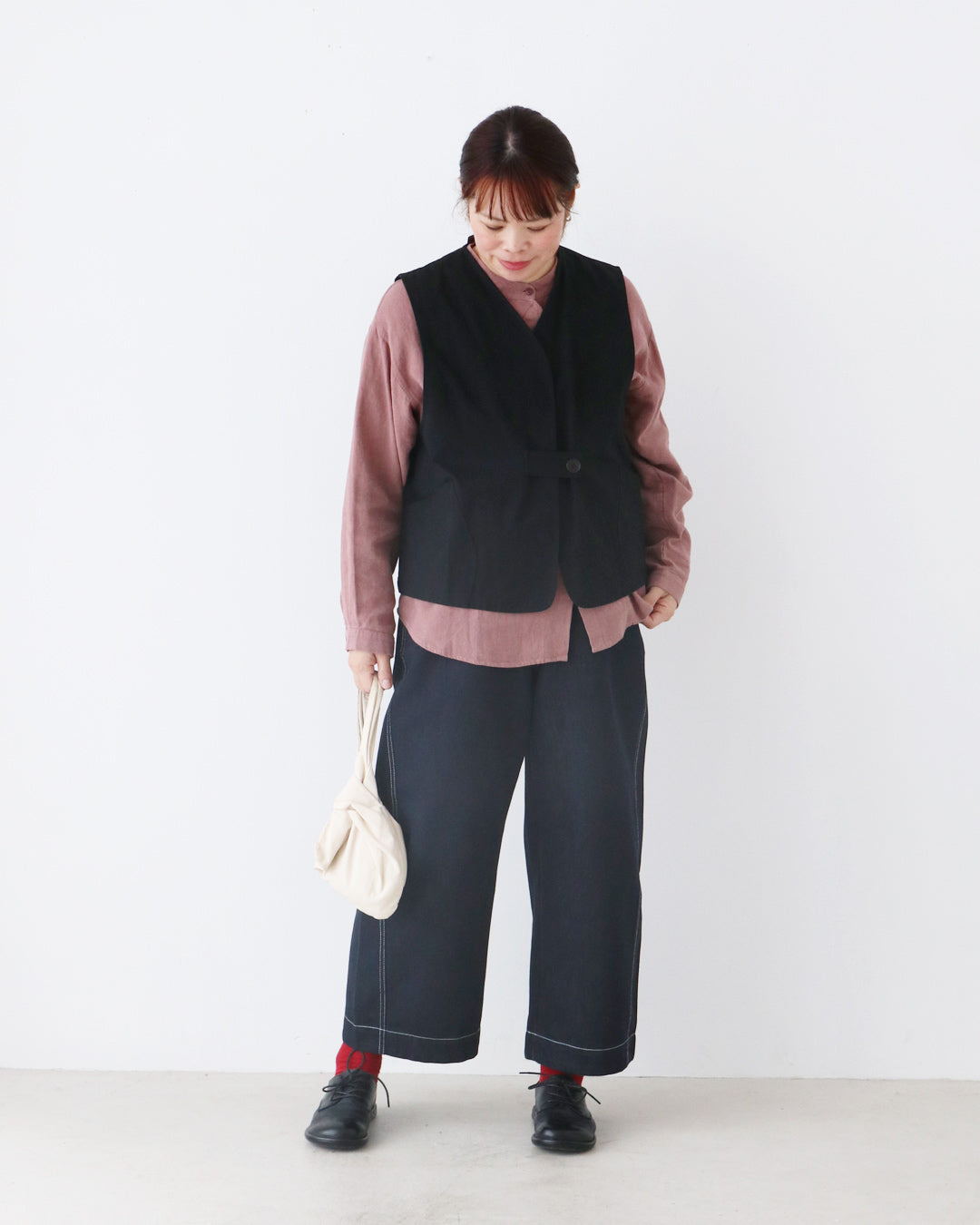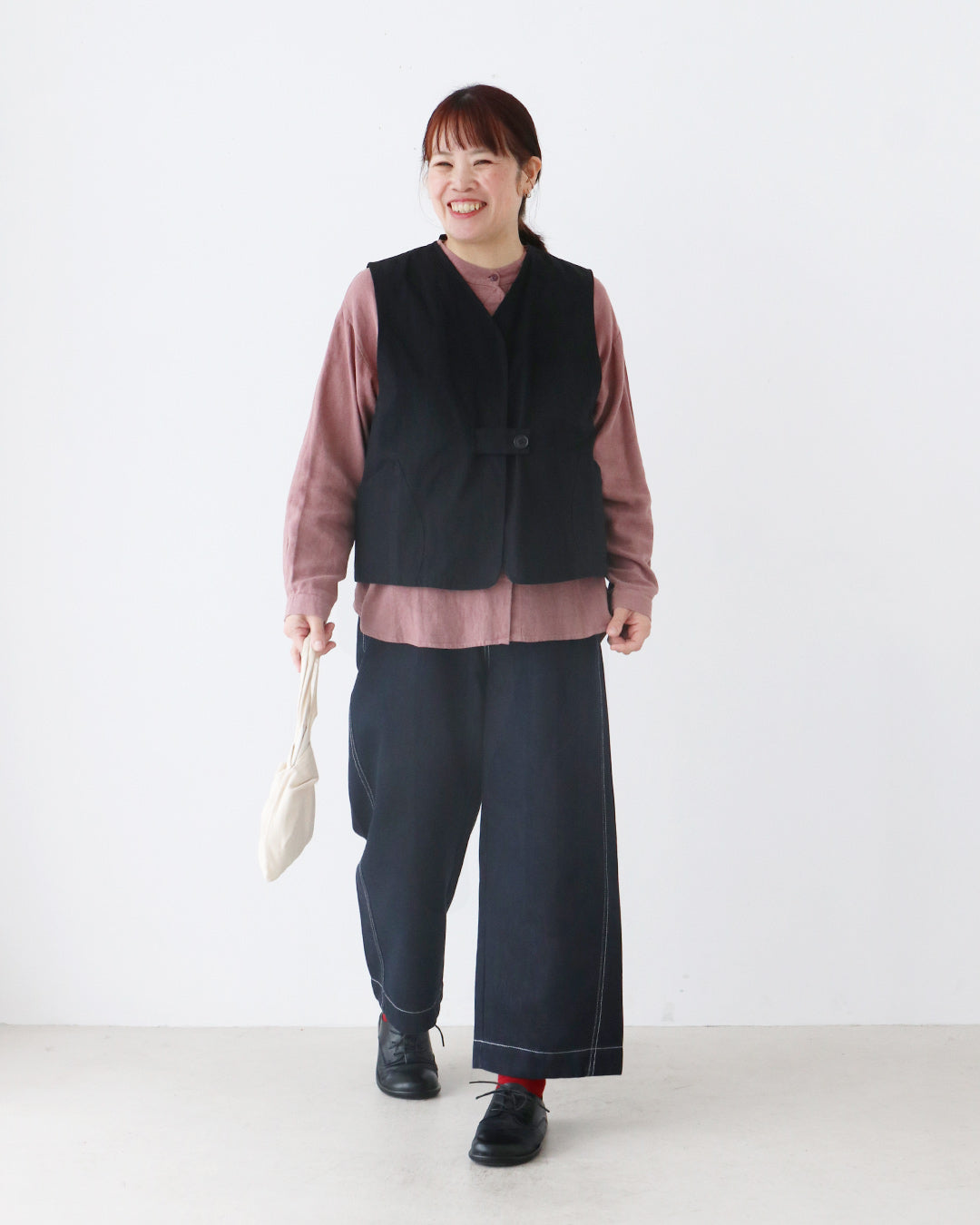 軽いベストを重ねることで体型カバーもしつつ、コーデに奥行きをプラス。