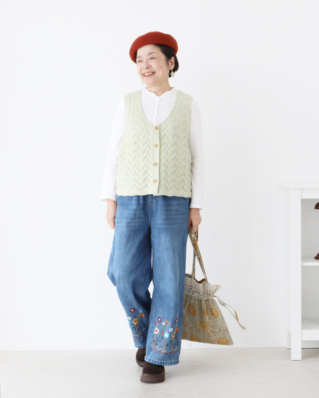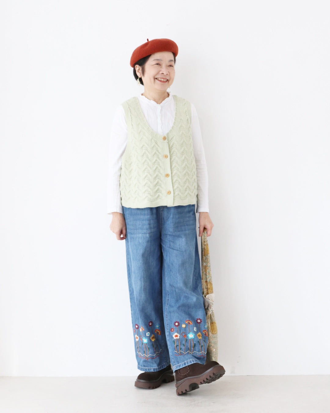 お花刺繍がポイントのデニムパンツを主役に