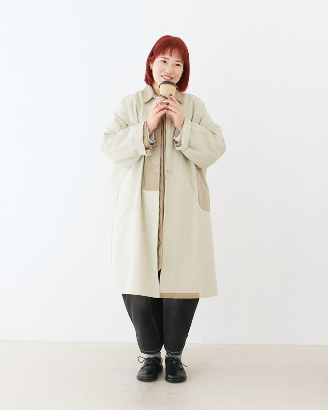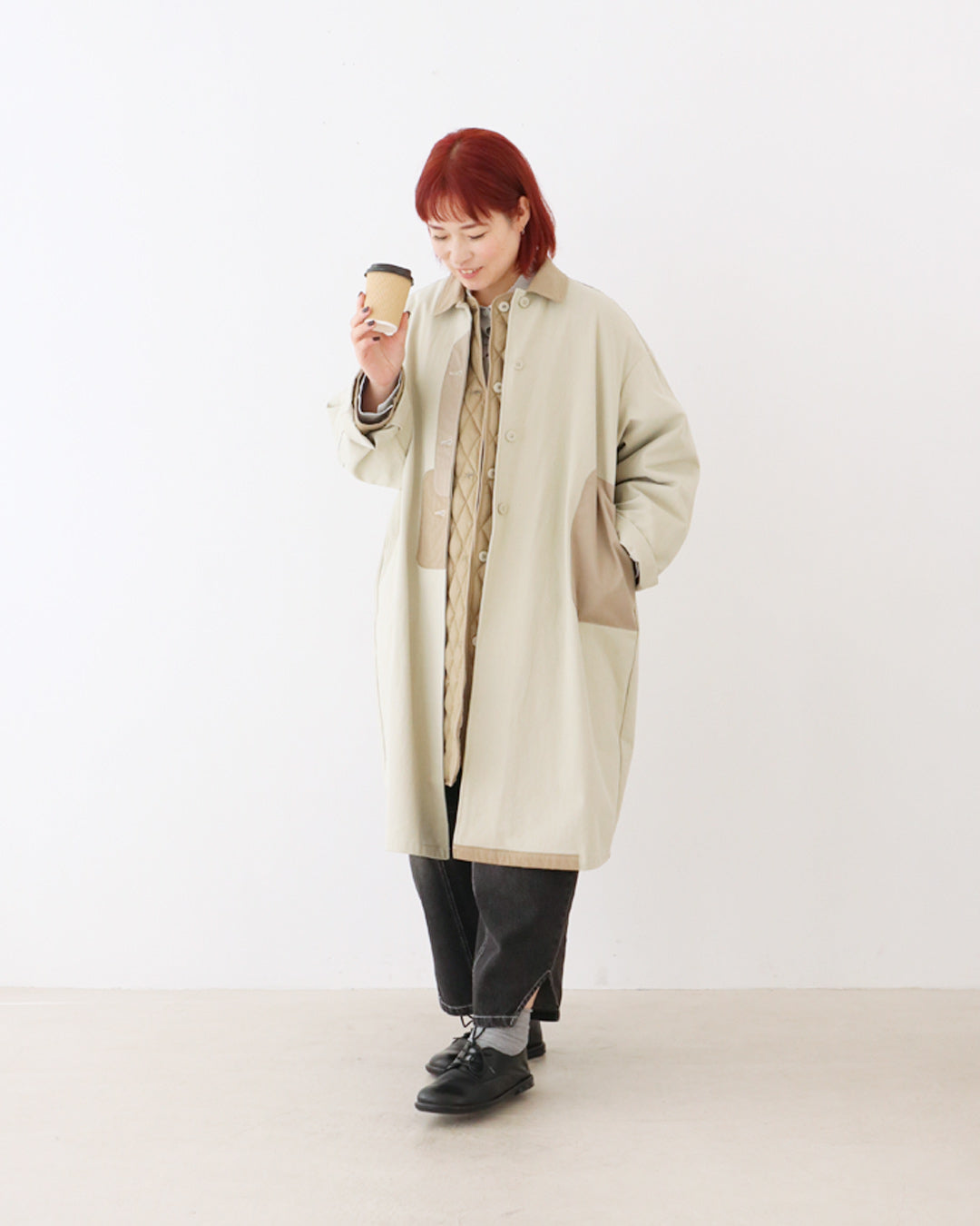 柔らかなアイボリーをベースに、ポケットや襟元の配色がアクセントになった主役級コート。インナーのキルティングコートはセット商品。