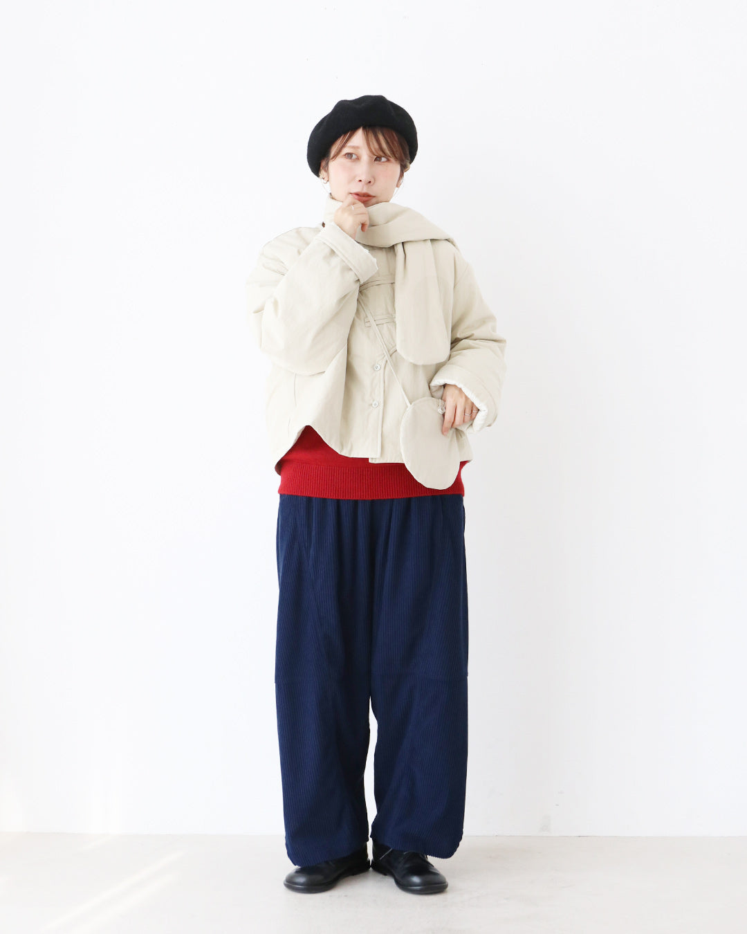首元にはセットのマフラーとポシェットを添えて、あたたかさとやさしい表情をプラスしました。