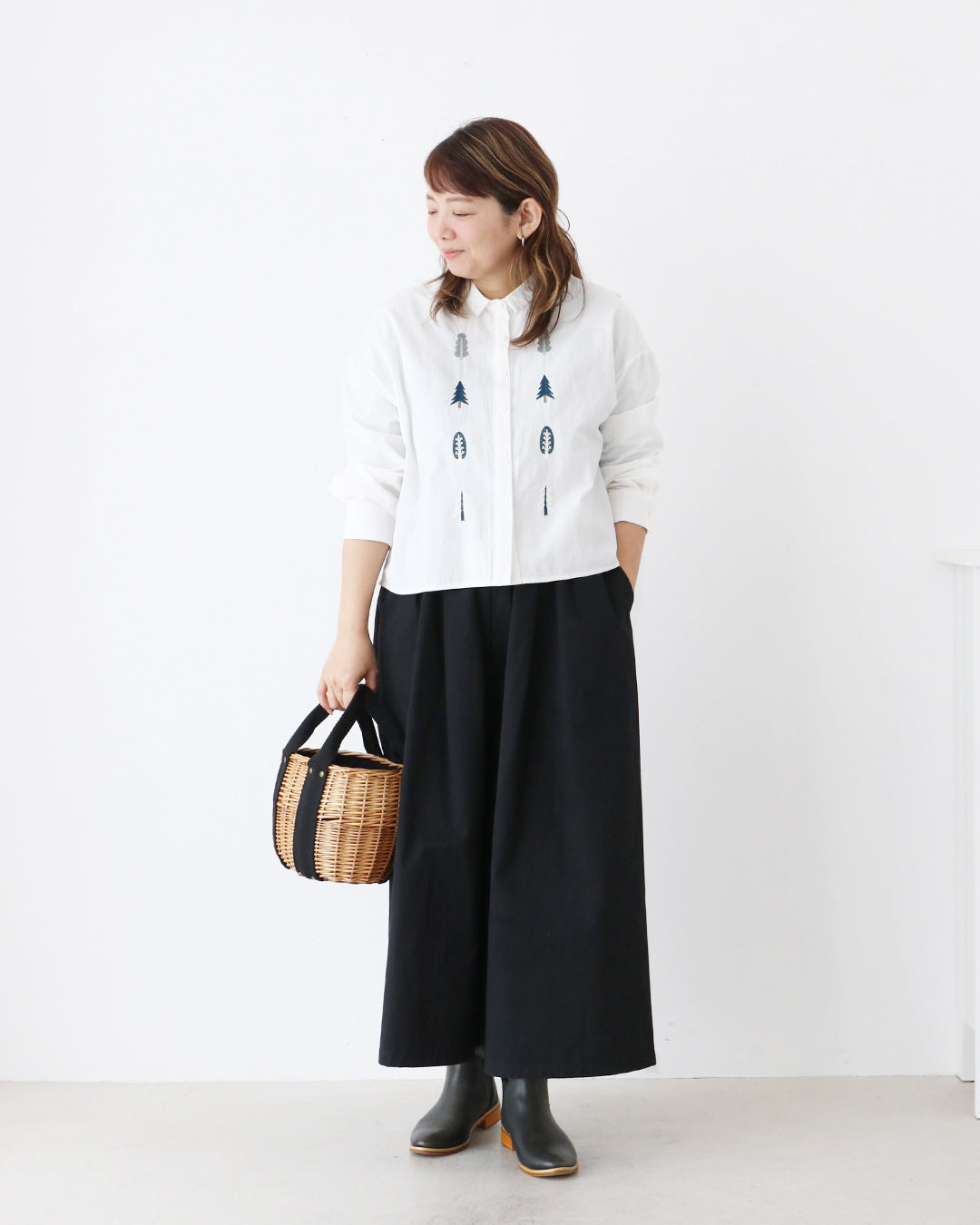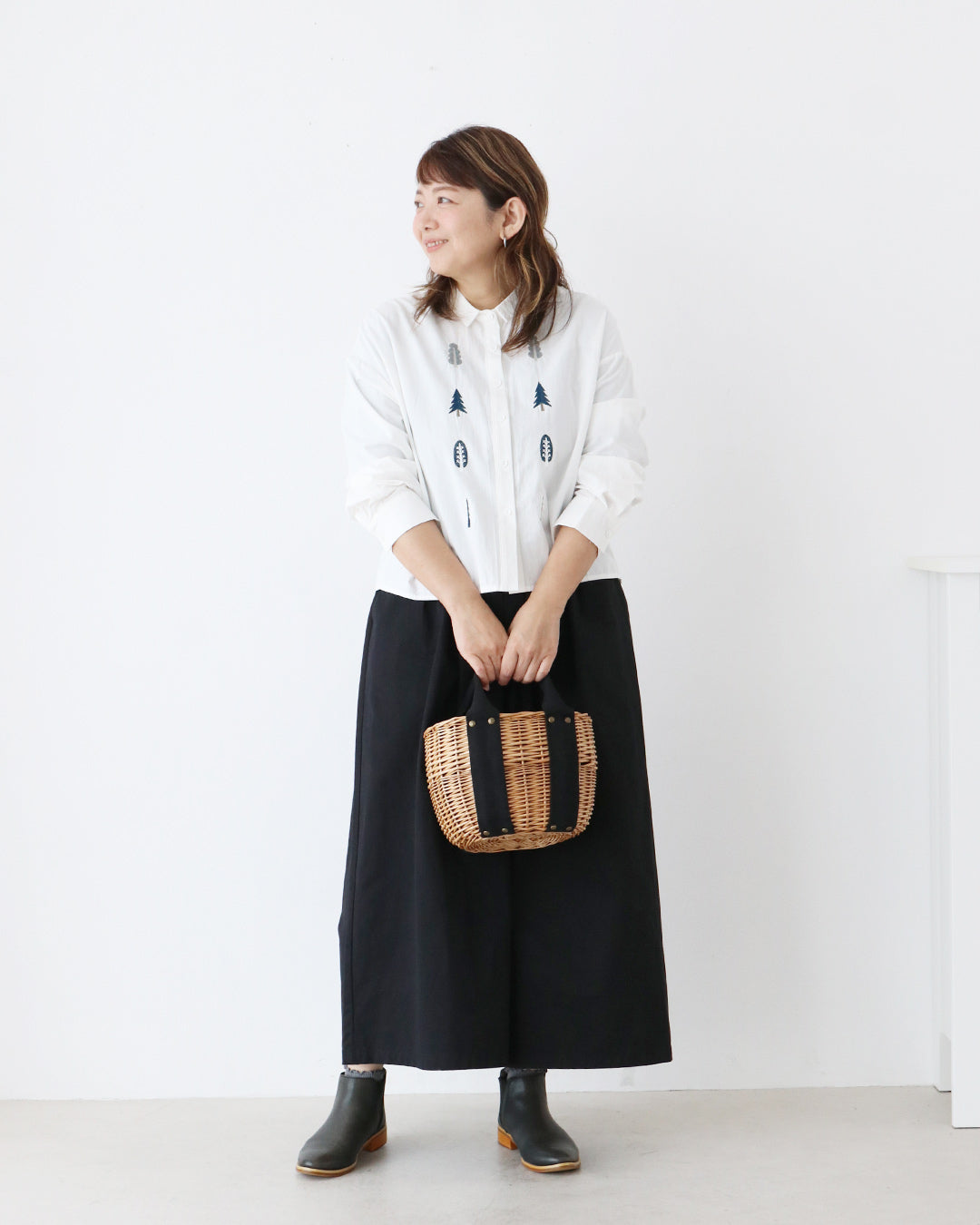 黒のロングスカートと合わせたシンプルなスタイルだからこそ、シャツのデザイン性が際立ちます。