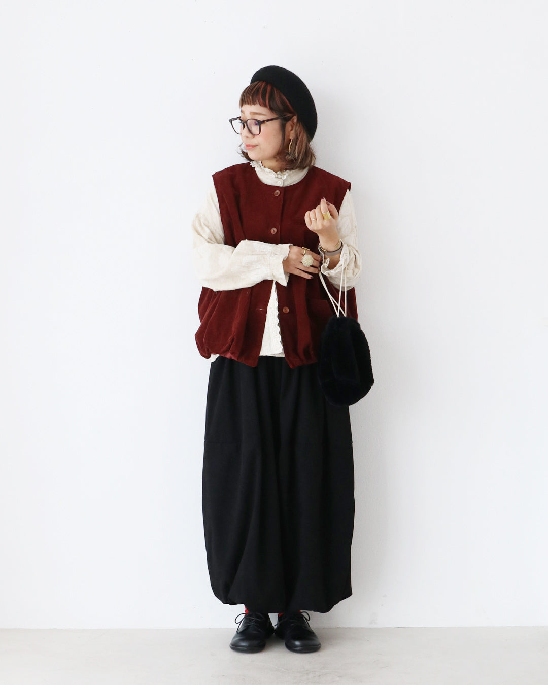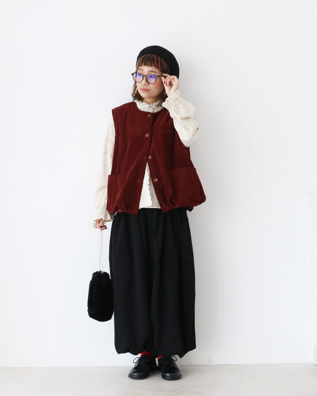 インナーはフリル付きブラウスで、首元と袖口からクラシカルなディテールを覗かせ、ボトムスは黒のバルーンパンツで、まるくて可愛いシルエットに。