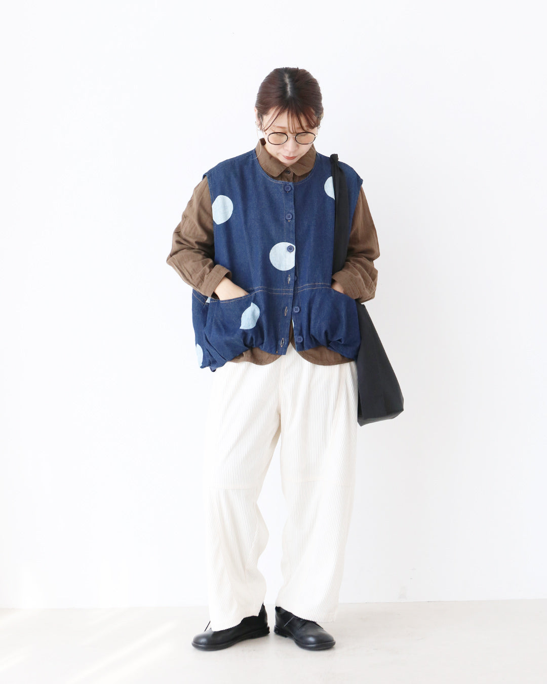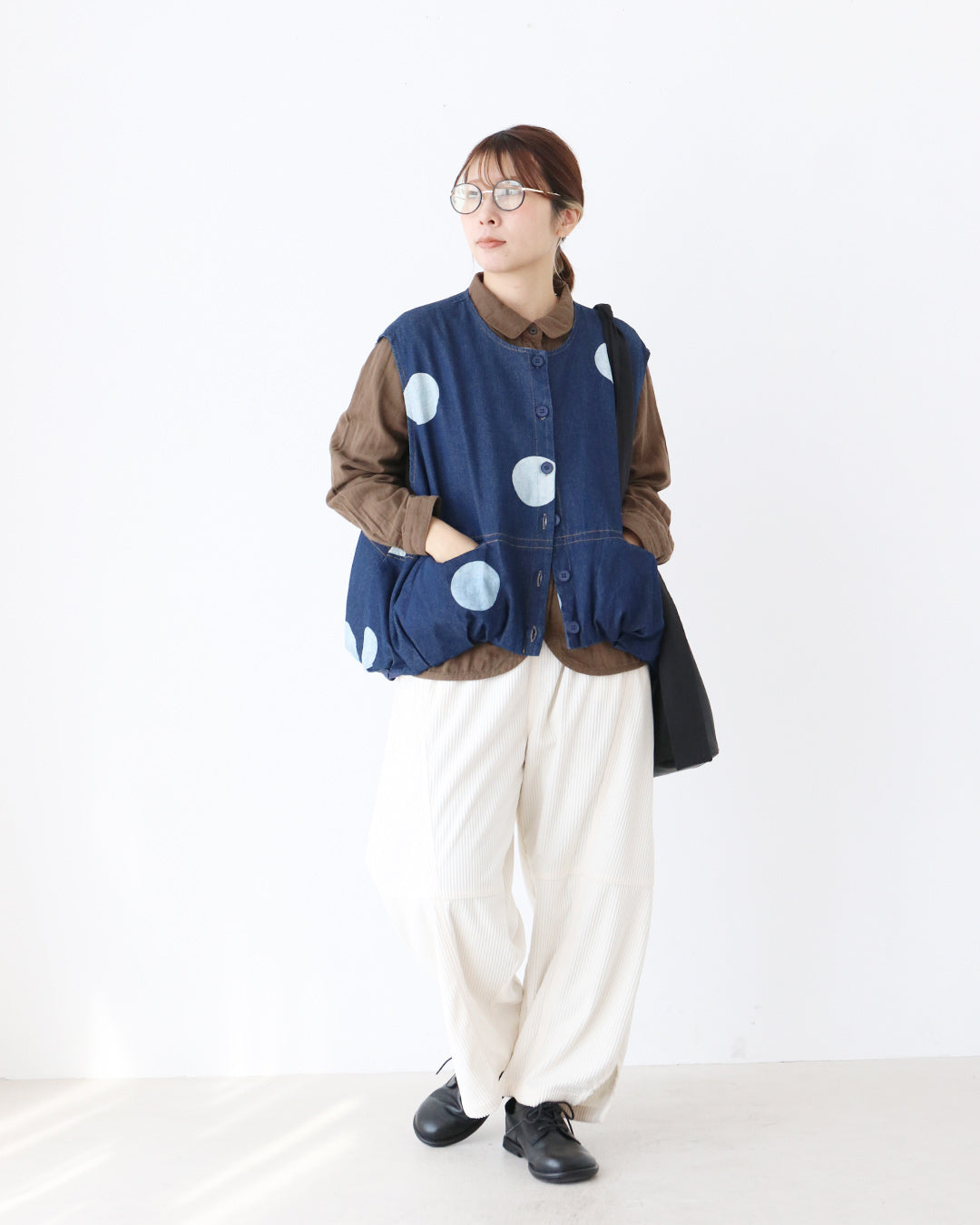 大きなドット柄が目を惹くデニムベストを主役にした、遊び心と落ち着きをあわせ持つ大人カジュアルコーデ。