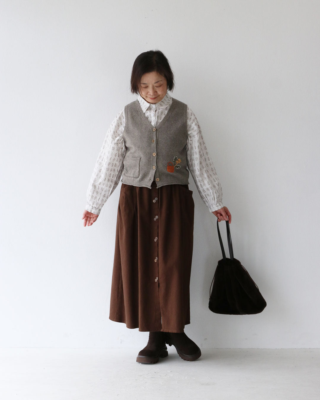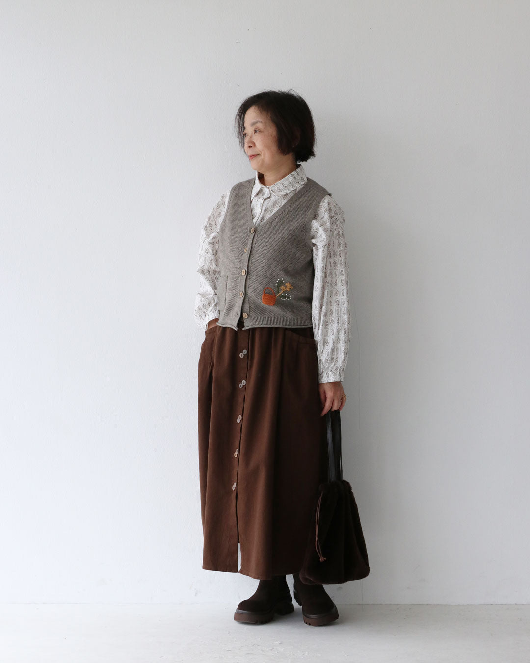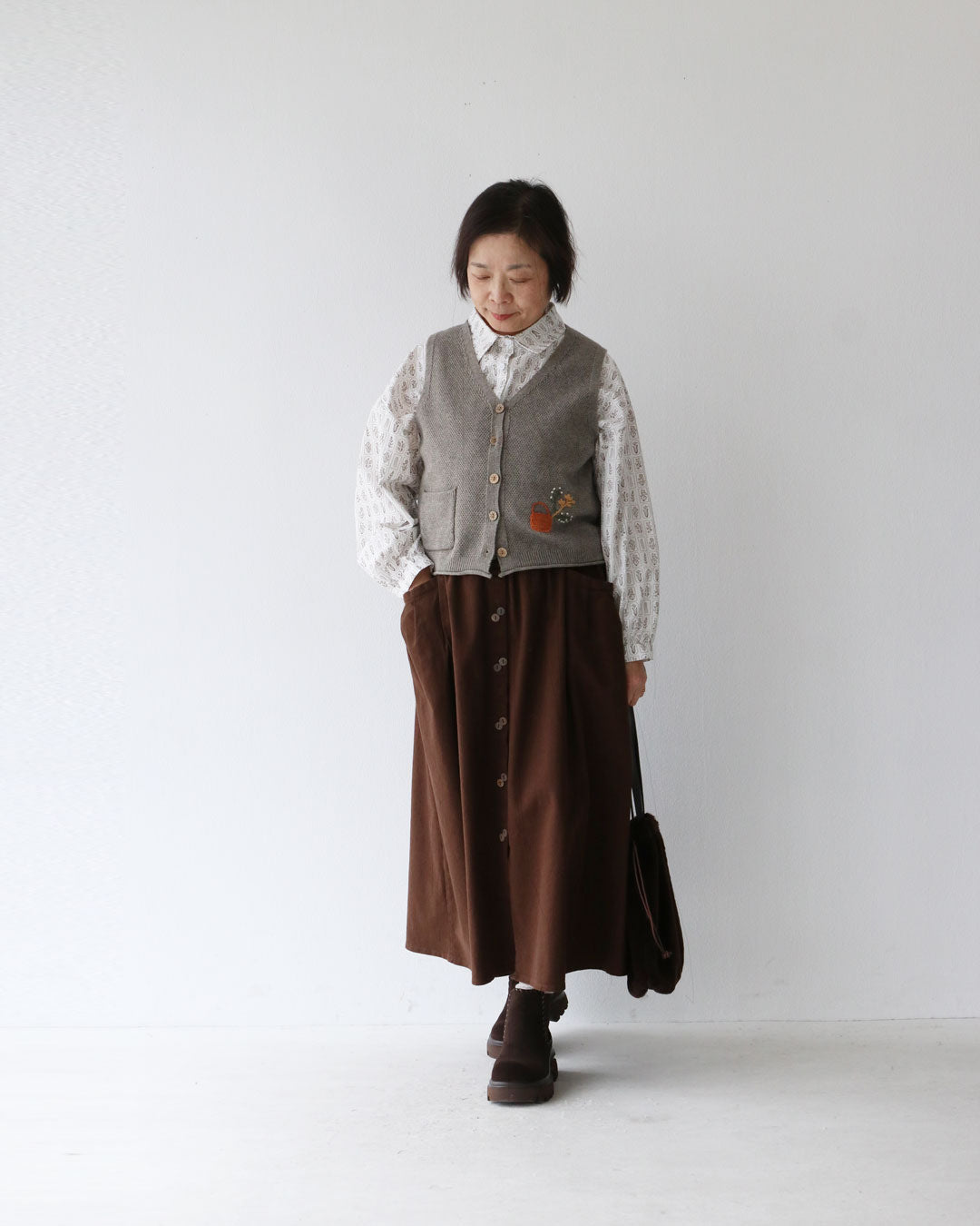 ベストに施された刺繍が、シンプルな中にさりげない表情を添え、落ち着いたブラウンのスカートと合わせることで、全体をやさしく上品な印象に整えてくれます。