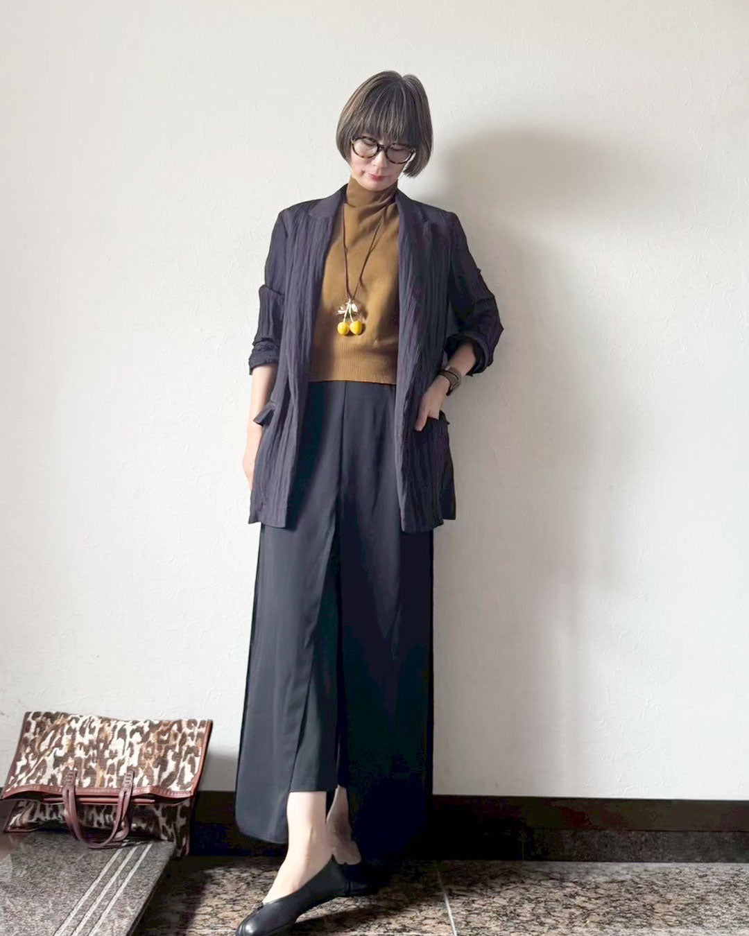 黒のシアーパンツがつくる、軽やかパンツコーデ