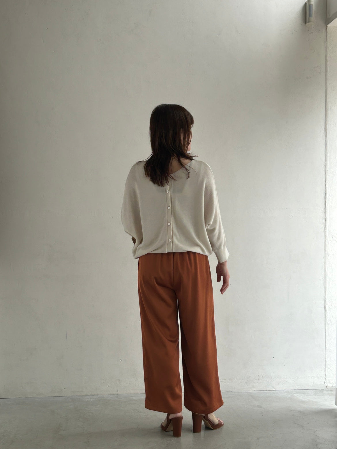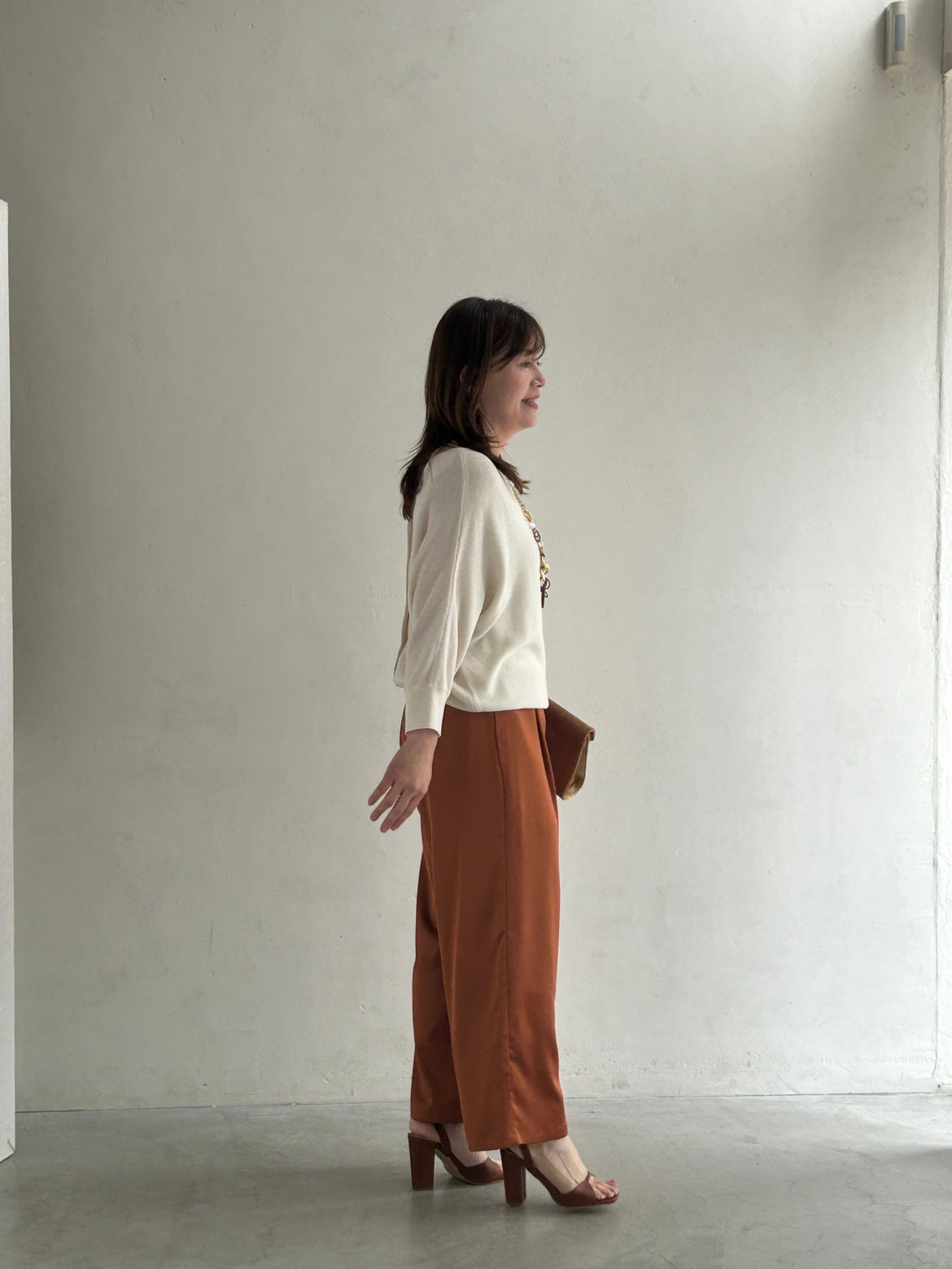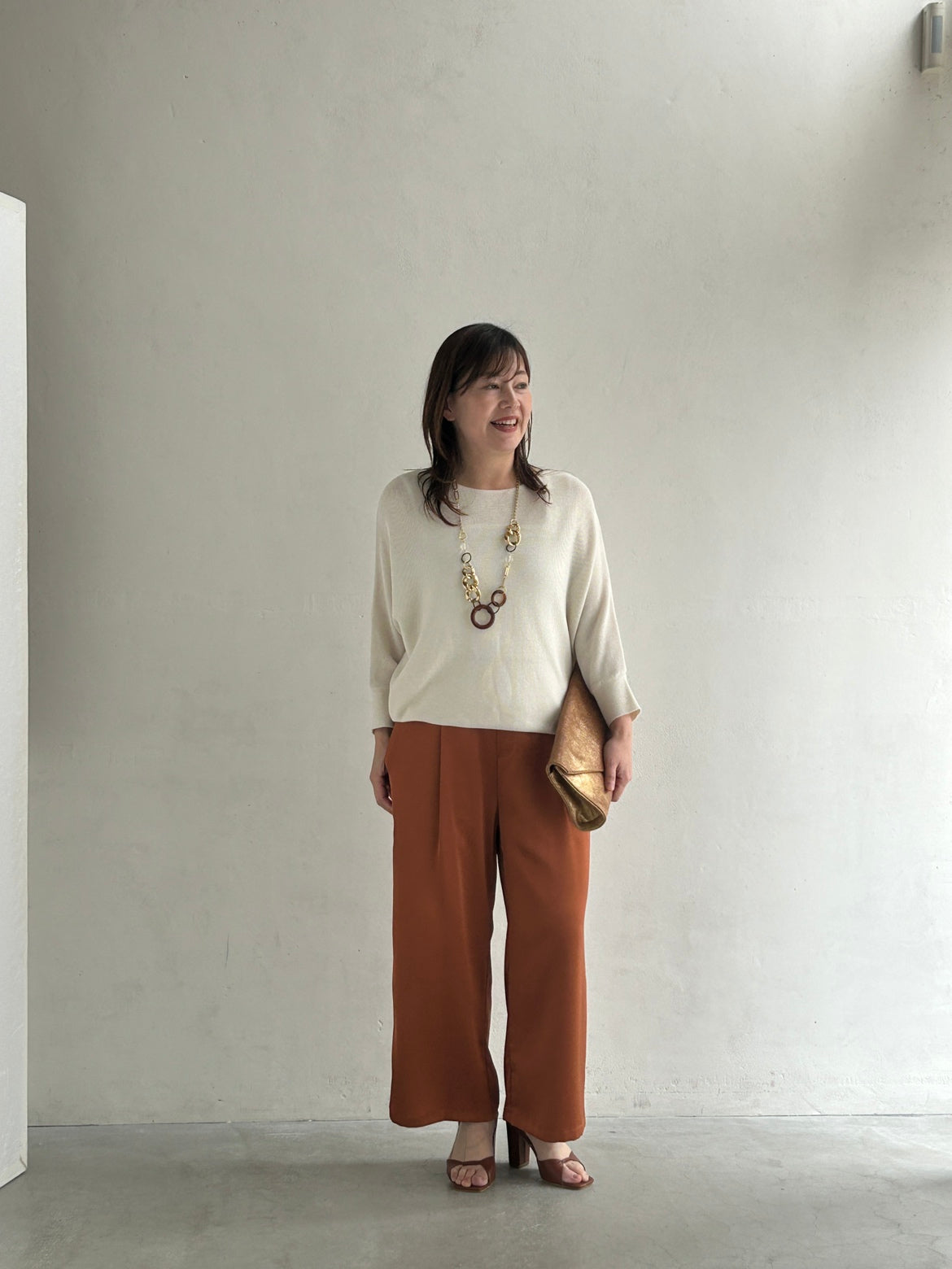 やわらかなアイボリートップスにテラコッタカラーのワイドパンツと、