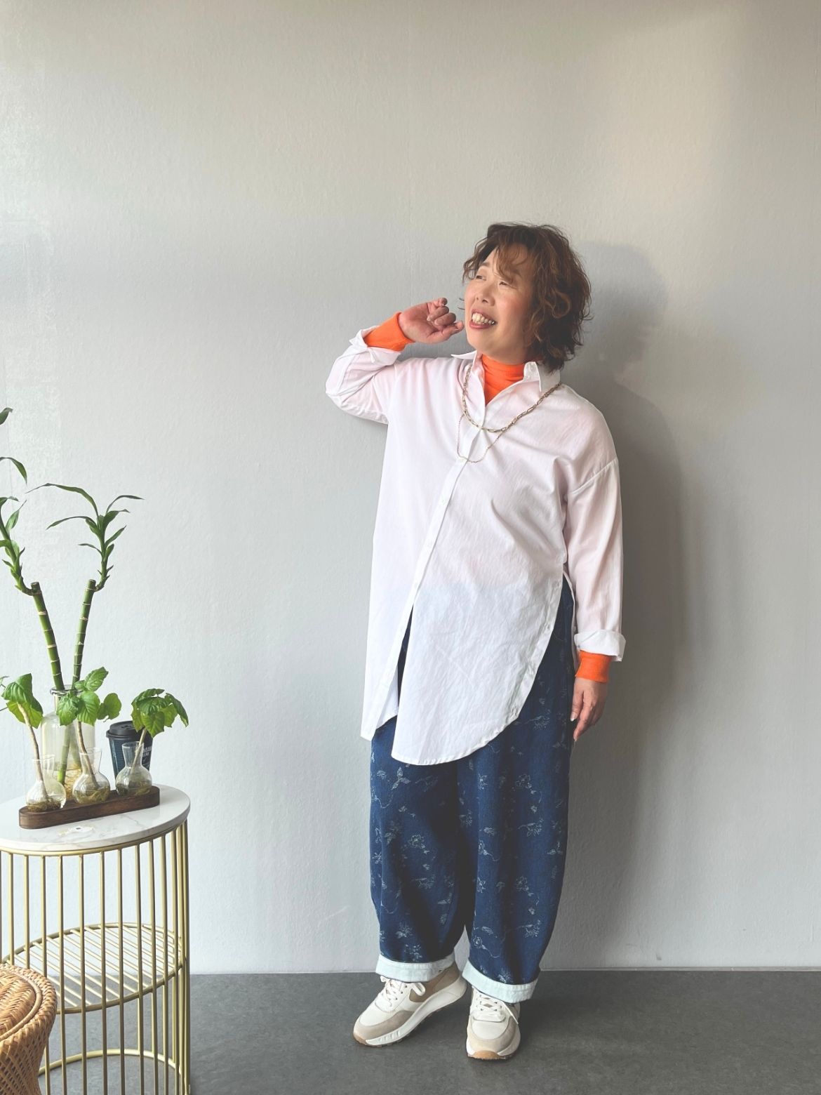顔周りをパッと明るくしてくれるオレンジのインナーを利かせたシャツと、リーフ柄のパンツが春爛漫でとっても爽やか!