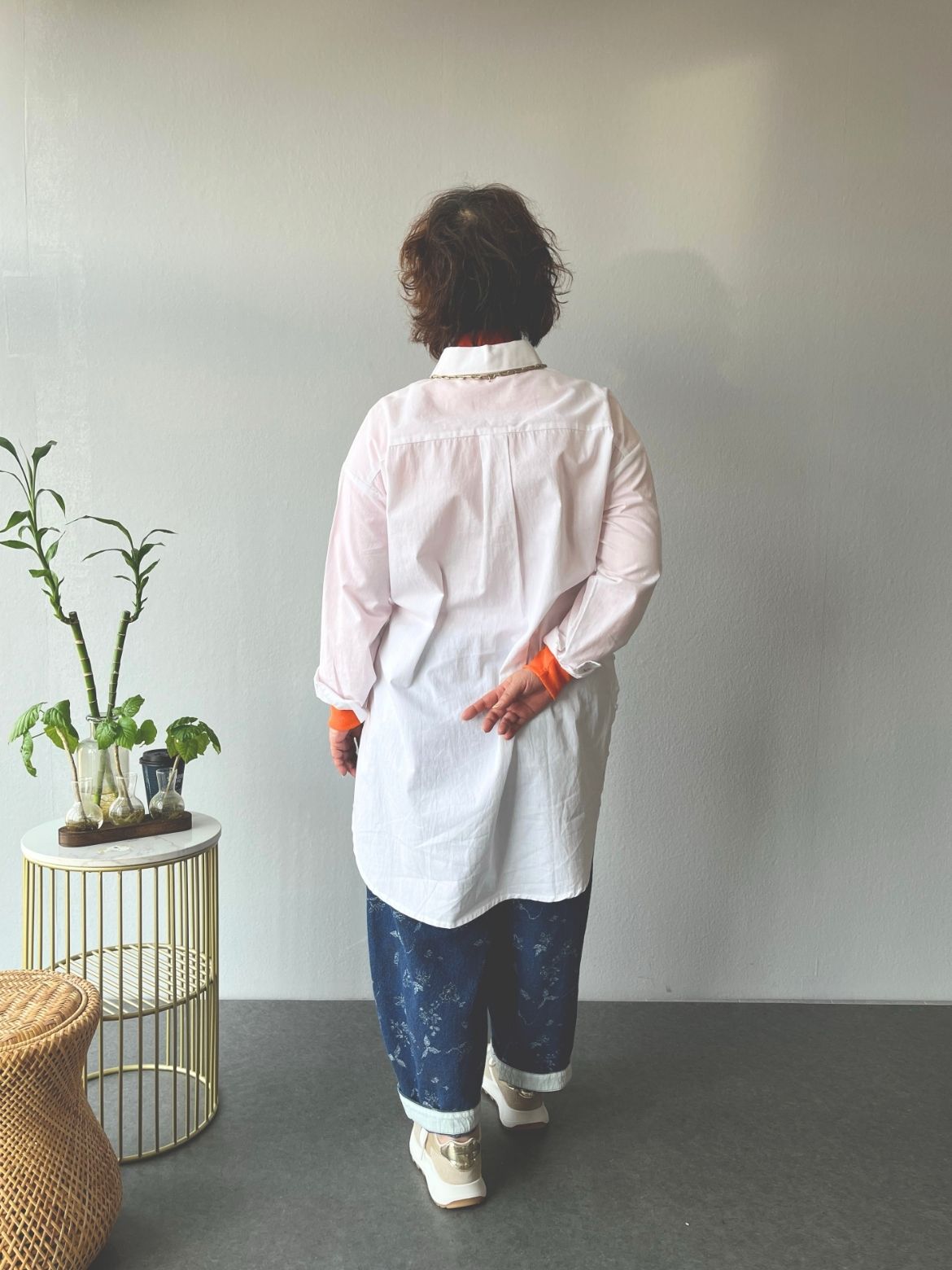 首元・袖口からチラリと覗かせたオレンジのレイヤードが、スッキリ見えとこなれ感を両立させる秘訣です。