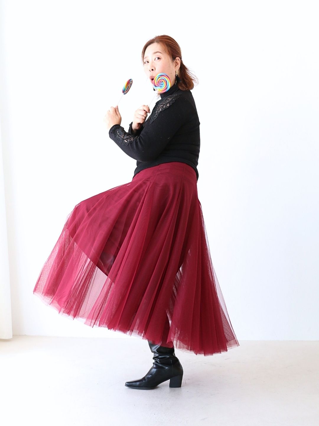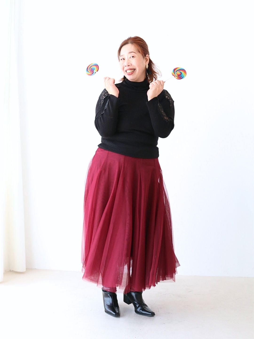 レースインナーやりんごバッグの遊び心が、知的な装いに個性をプラス。