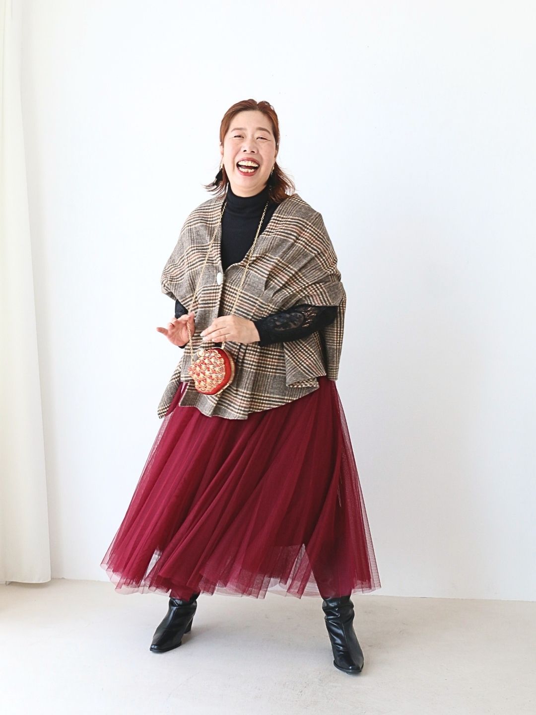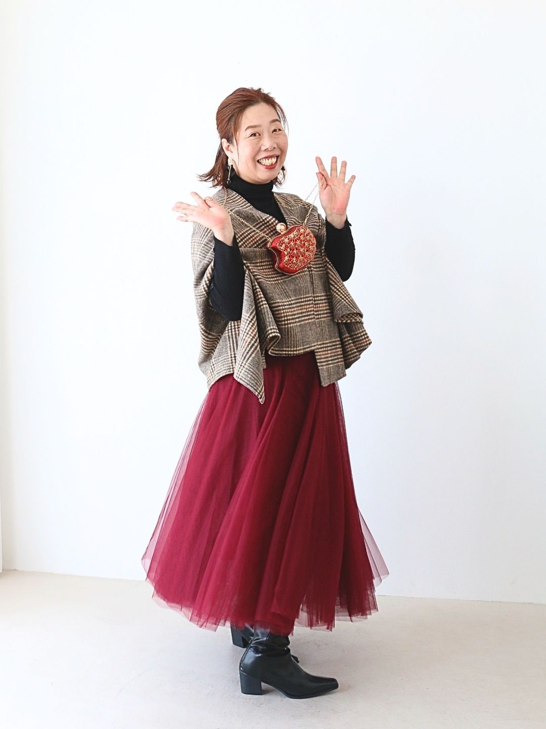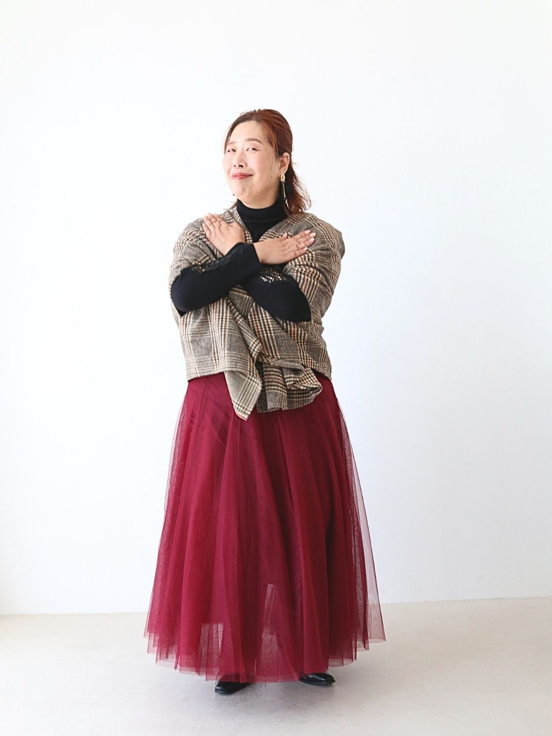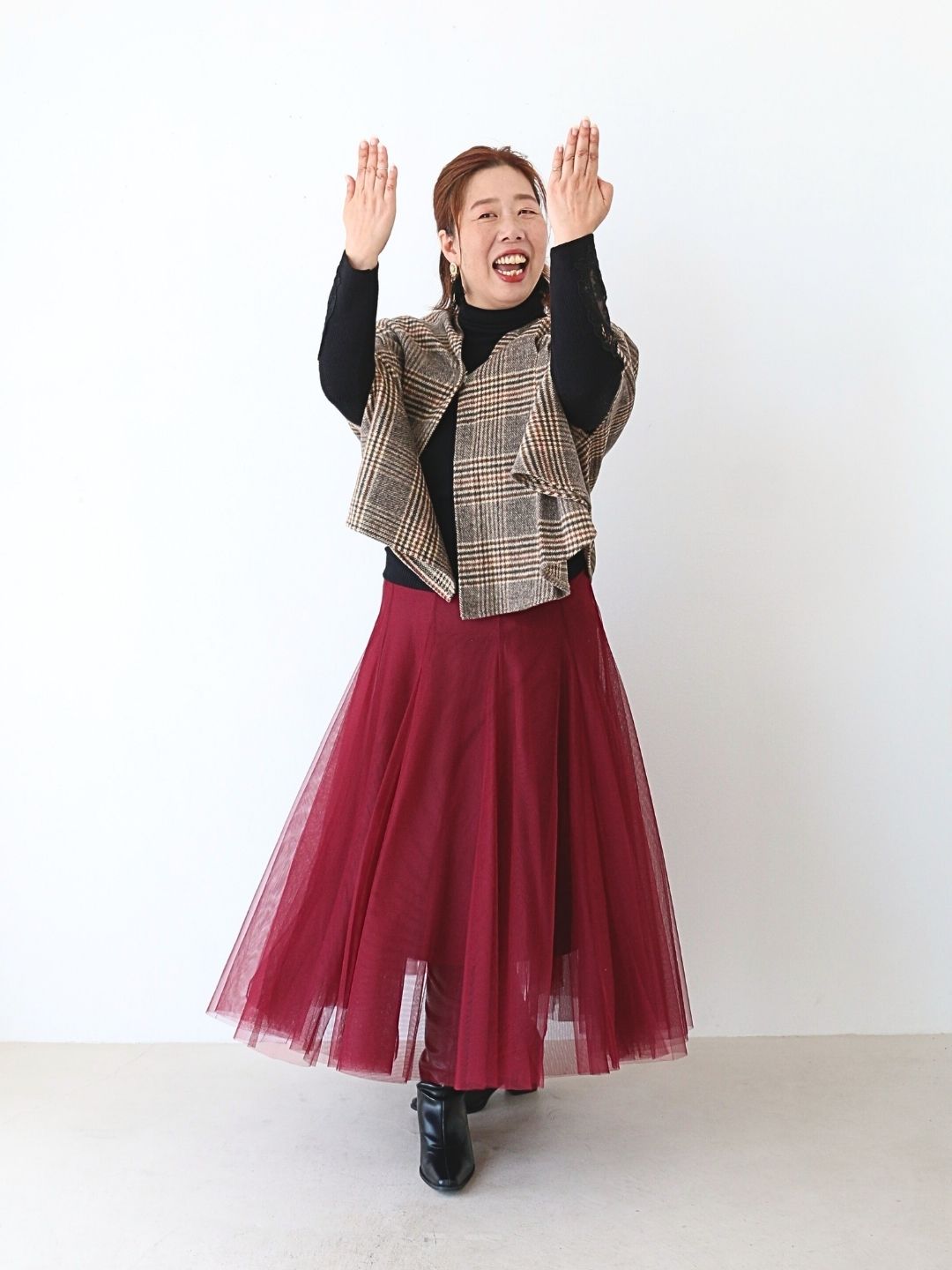 グレンチェックのトップスとチュールスカートを重ねた、上品で軽やかな美術館コーデ。