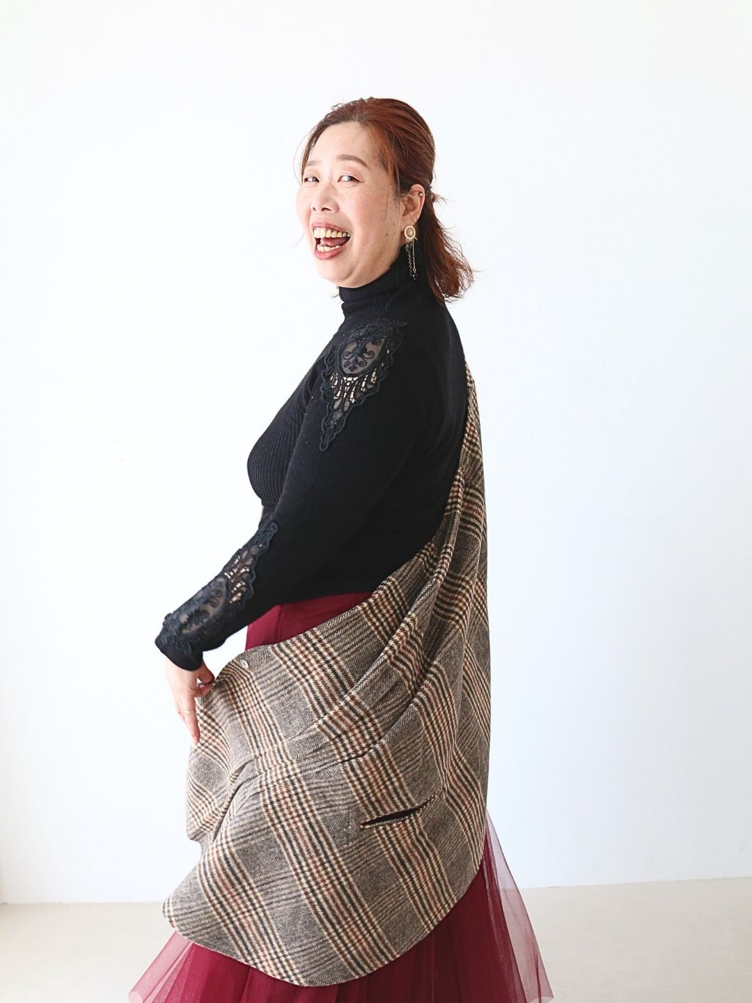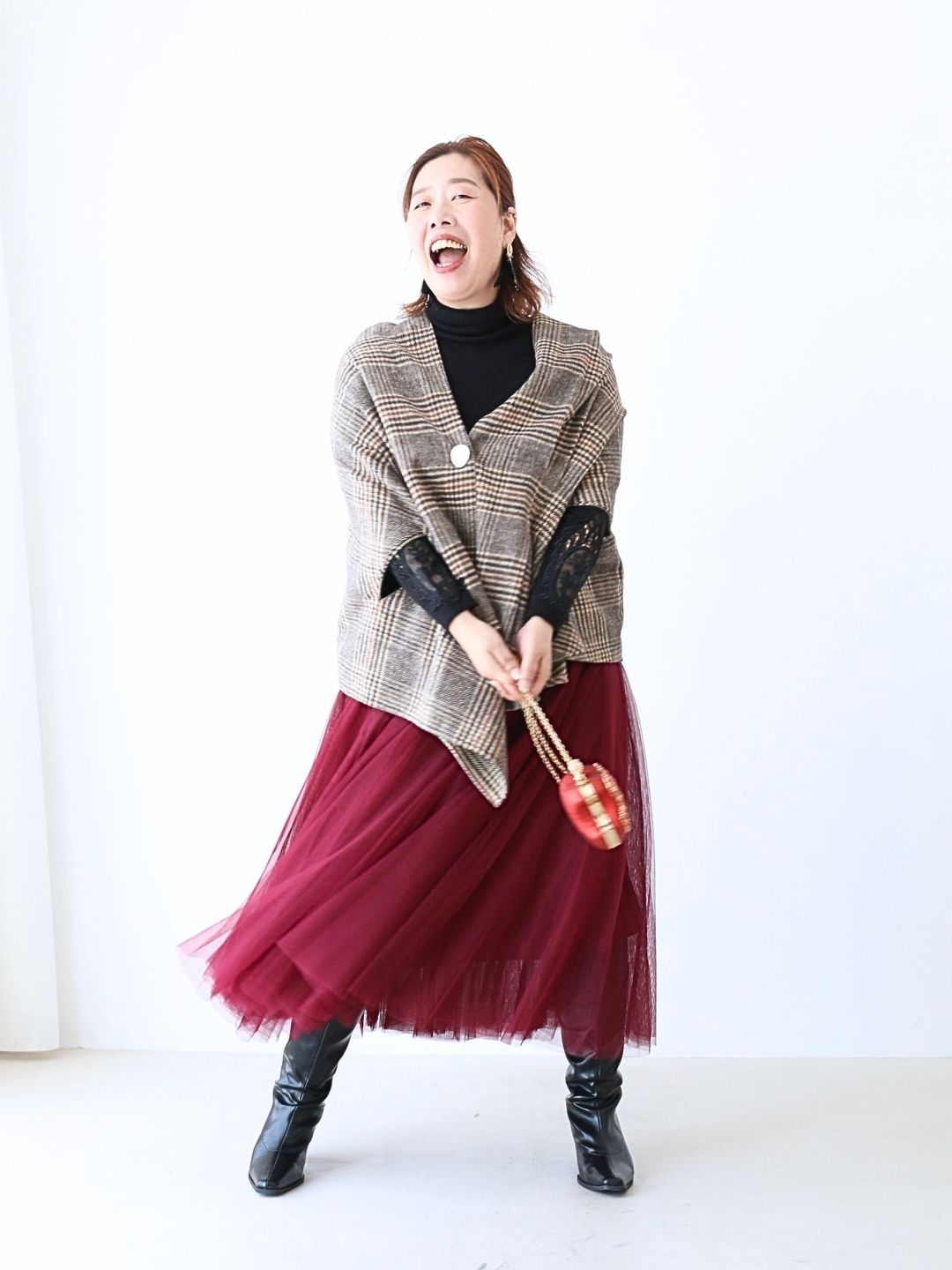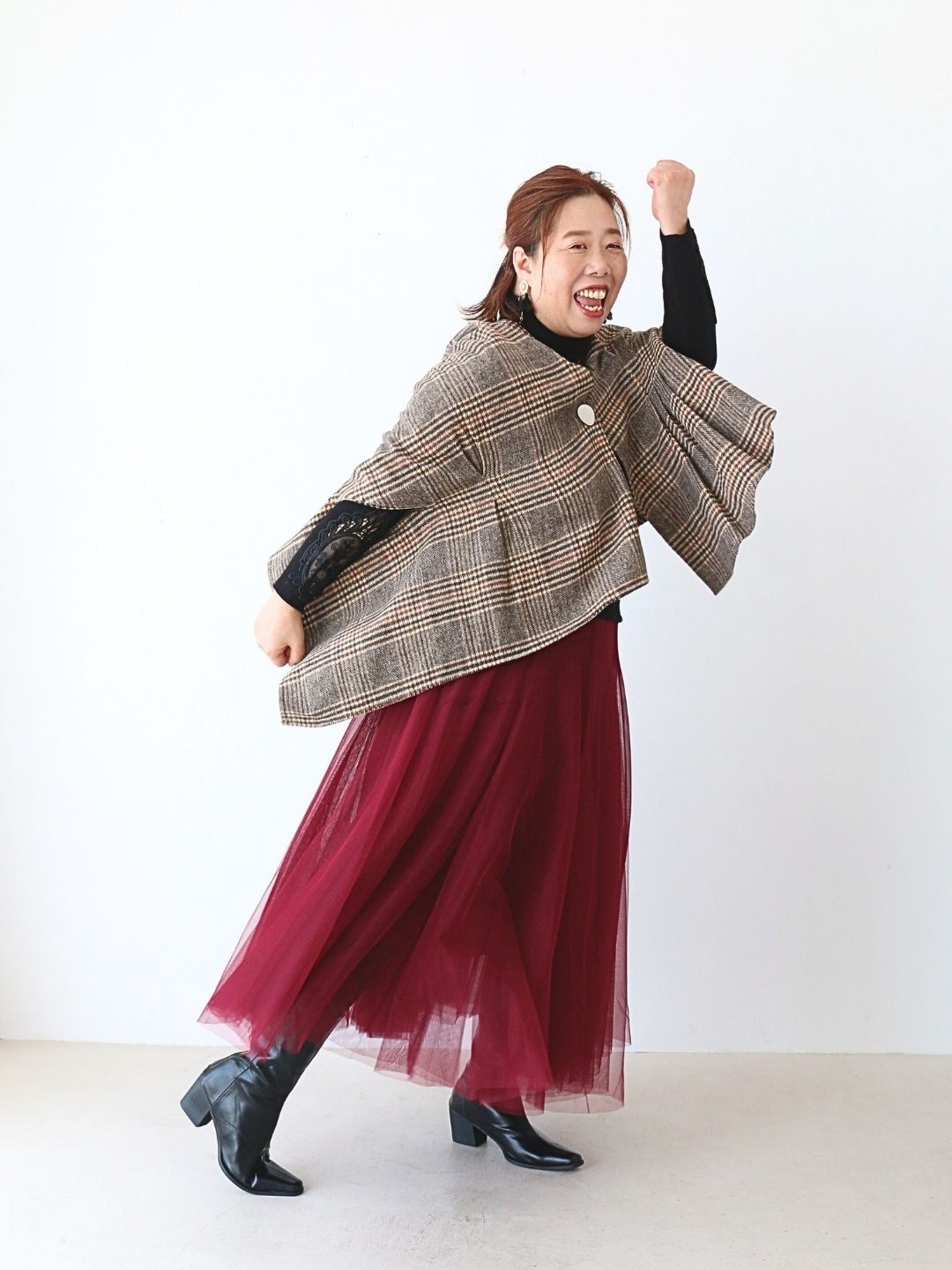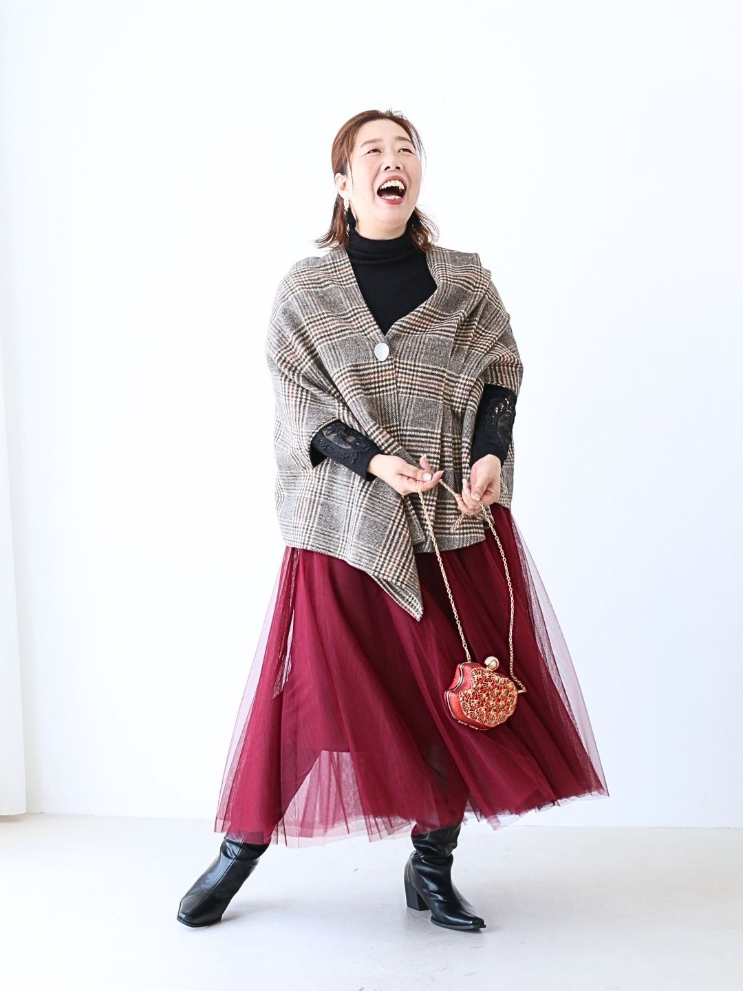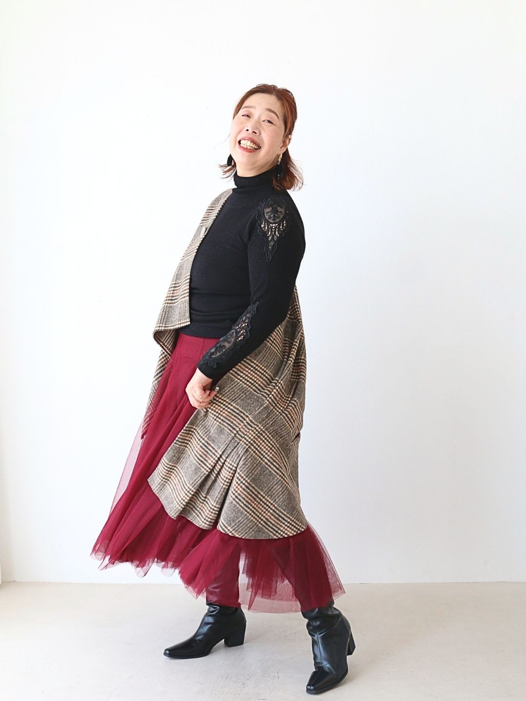 グレンチェックのトップスとチュールスカートを重ねた、上品で軽やかな美術館コーデ。