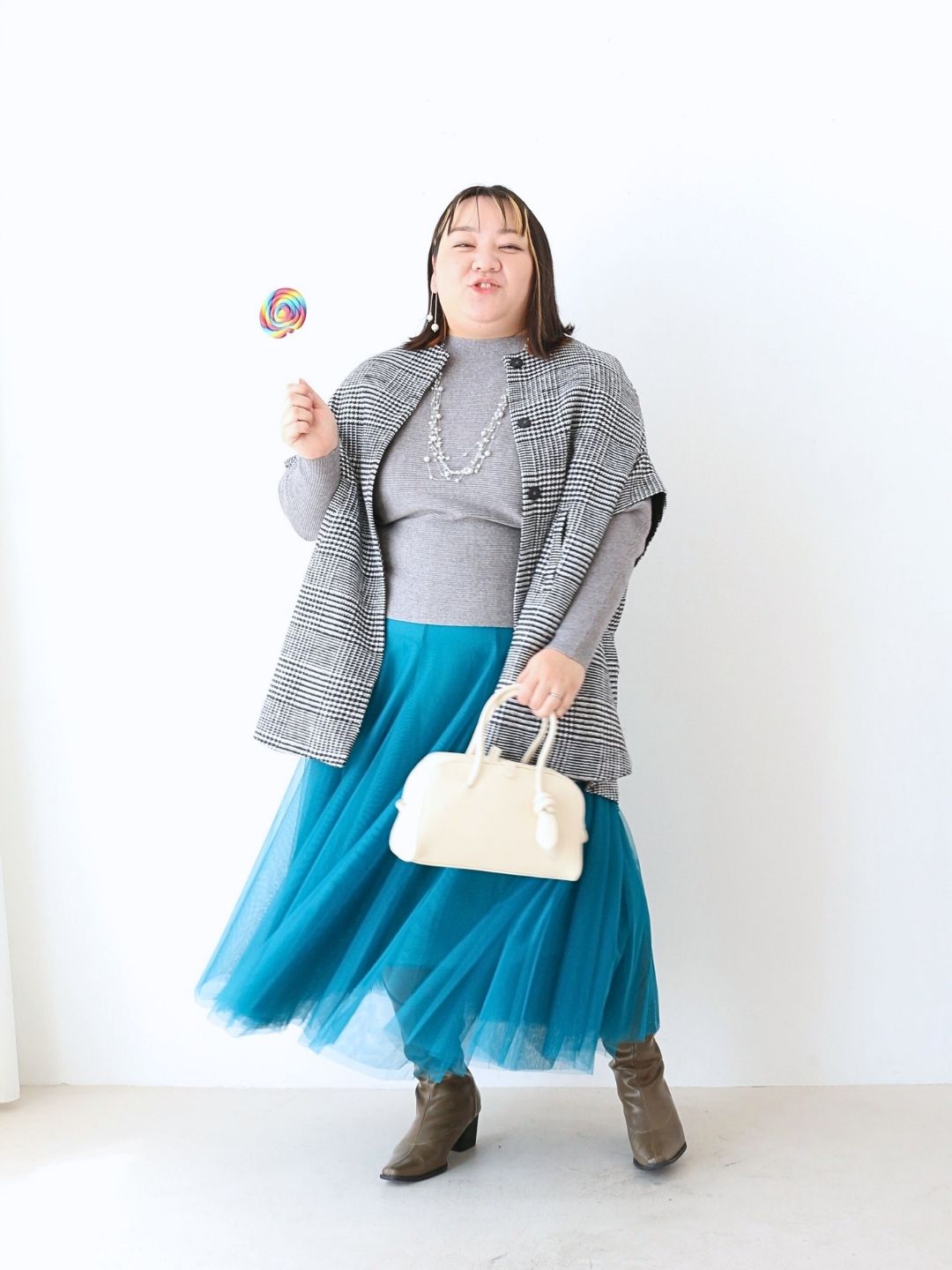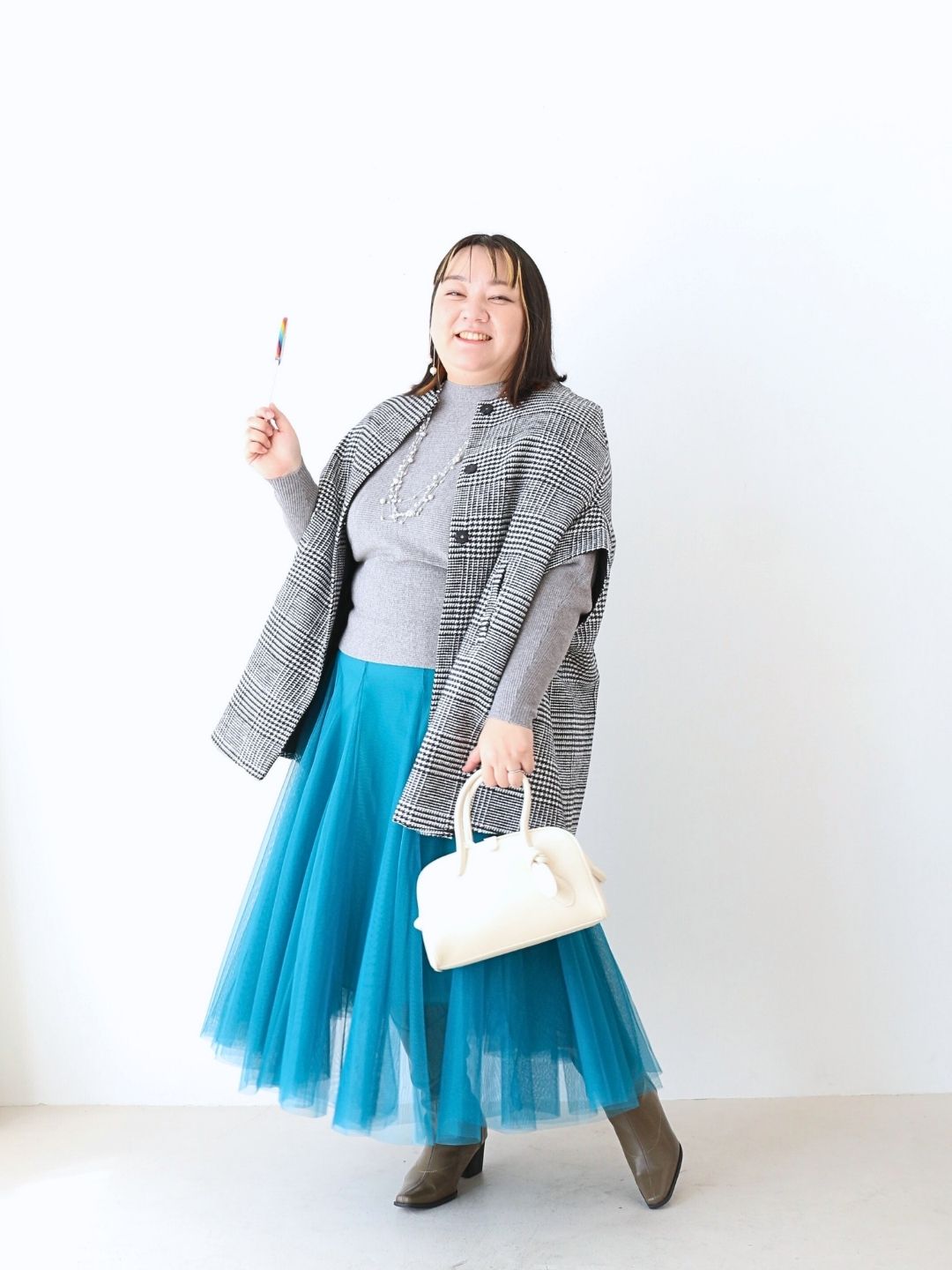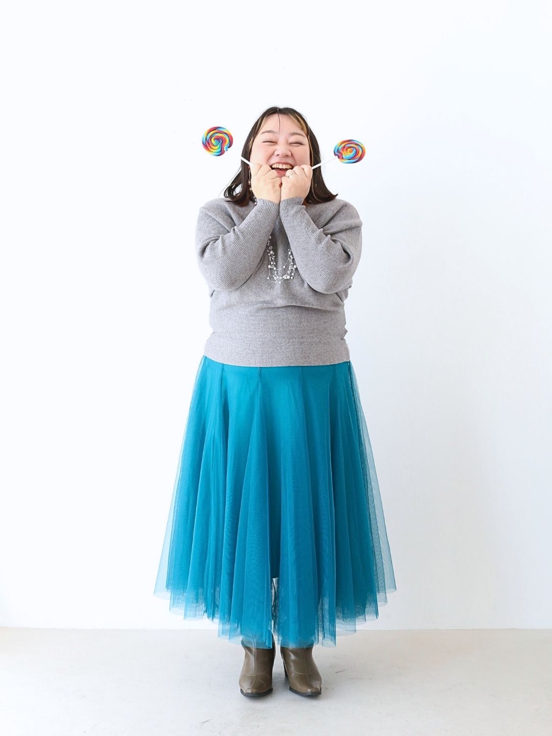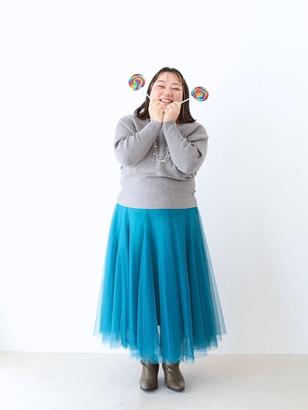 ターコイズブルーのスカートがグレーのニットと好相性で、上品さと華やかさを演出。
