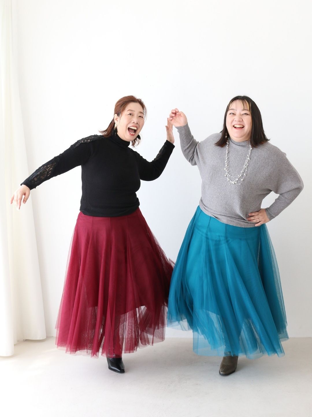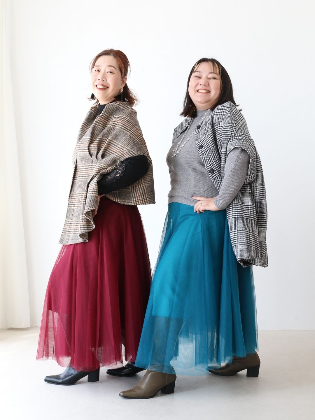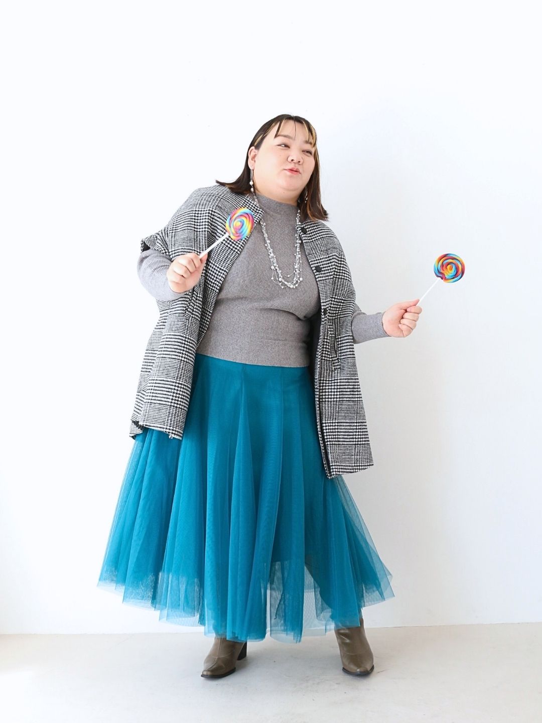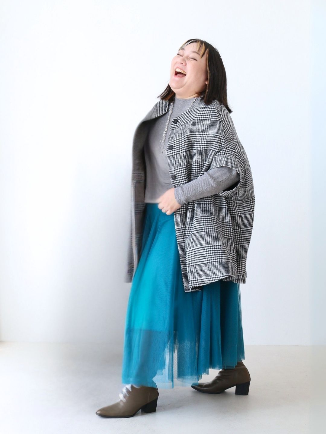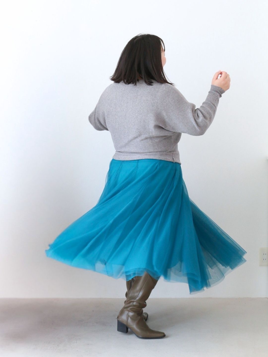 ターコイズブルーのスカートがグレーのニットと好相性で、上品さと華やかさを演出。