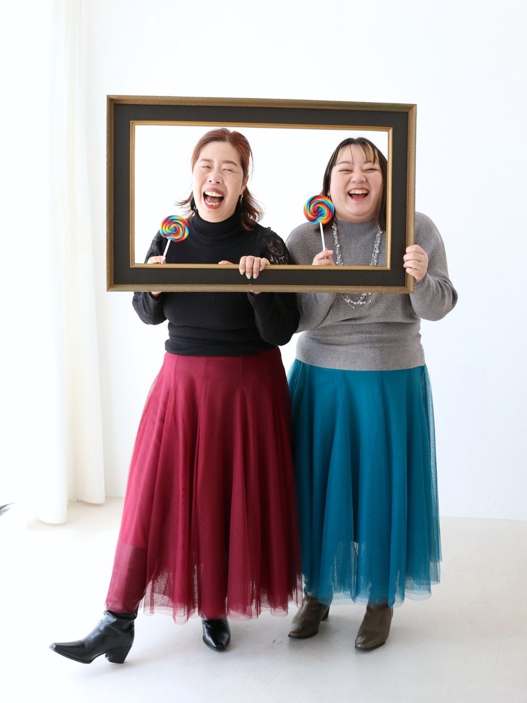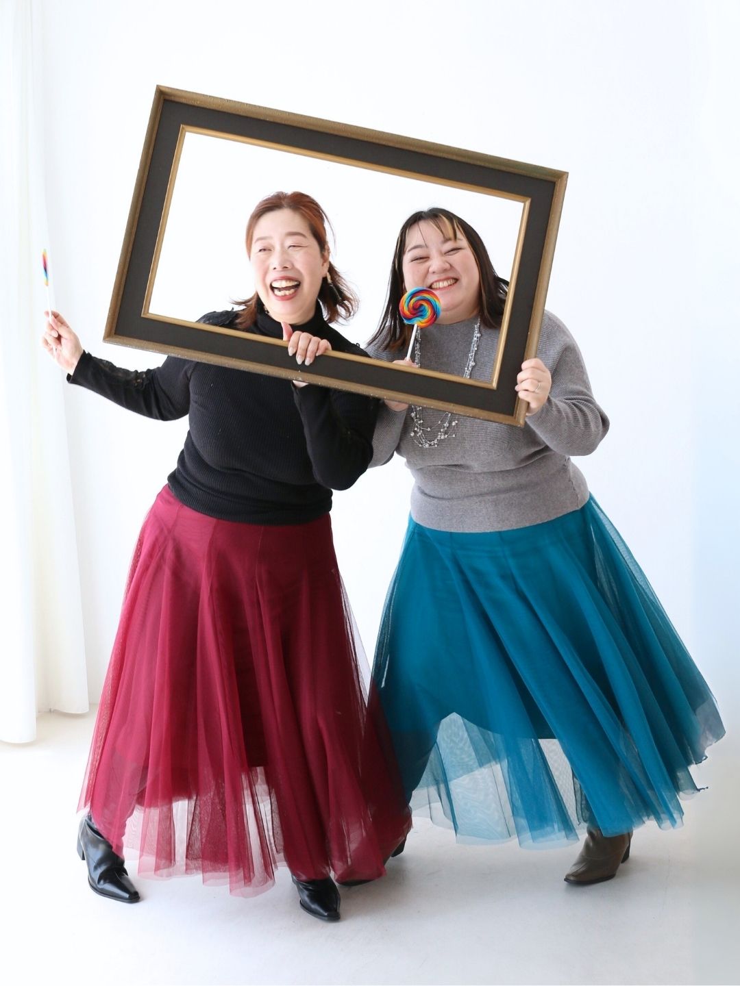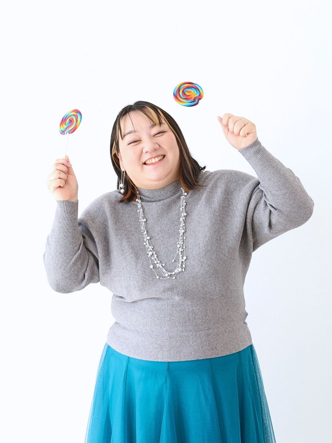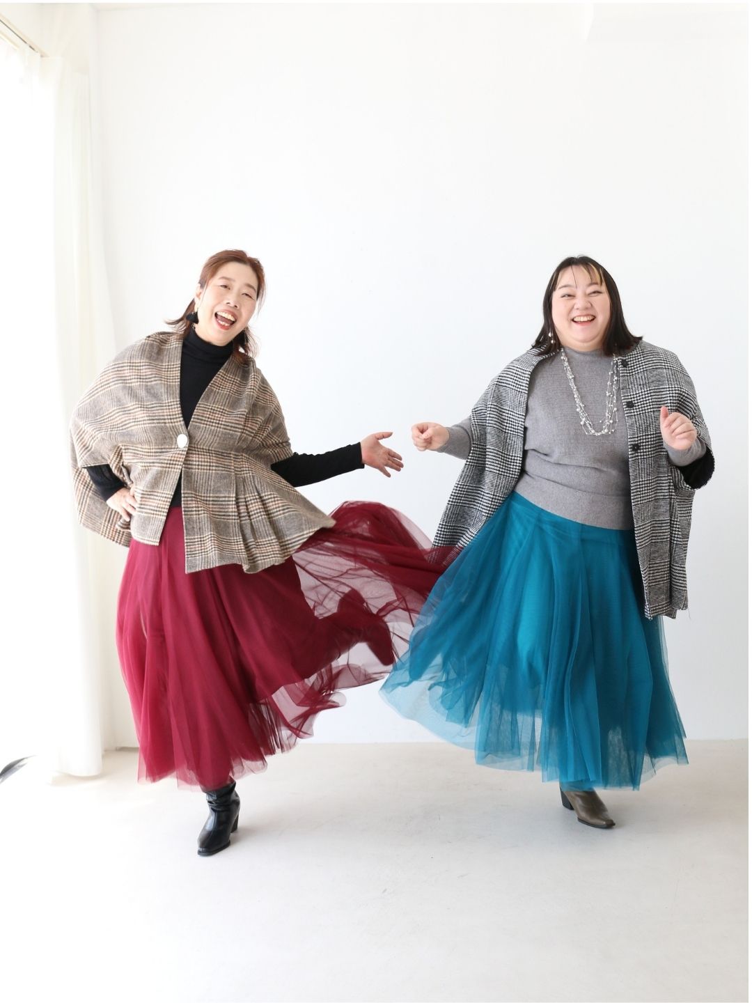 ターコイズブルーのスカートがグレーのニットと好相性で、上品さと華やかさを演出。