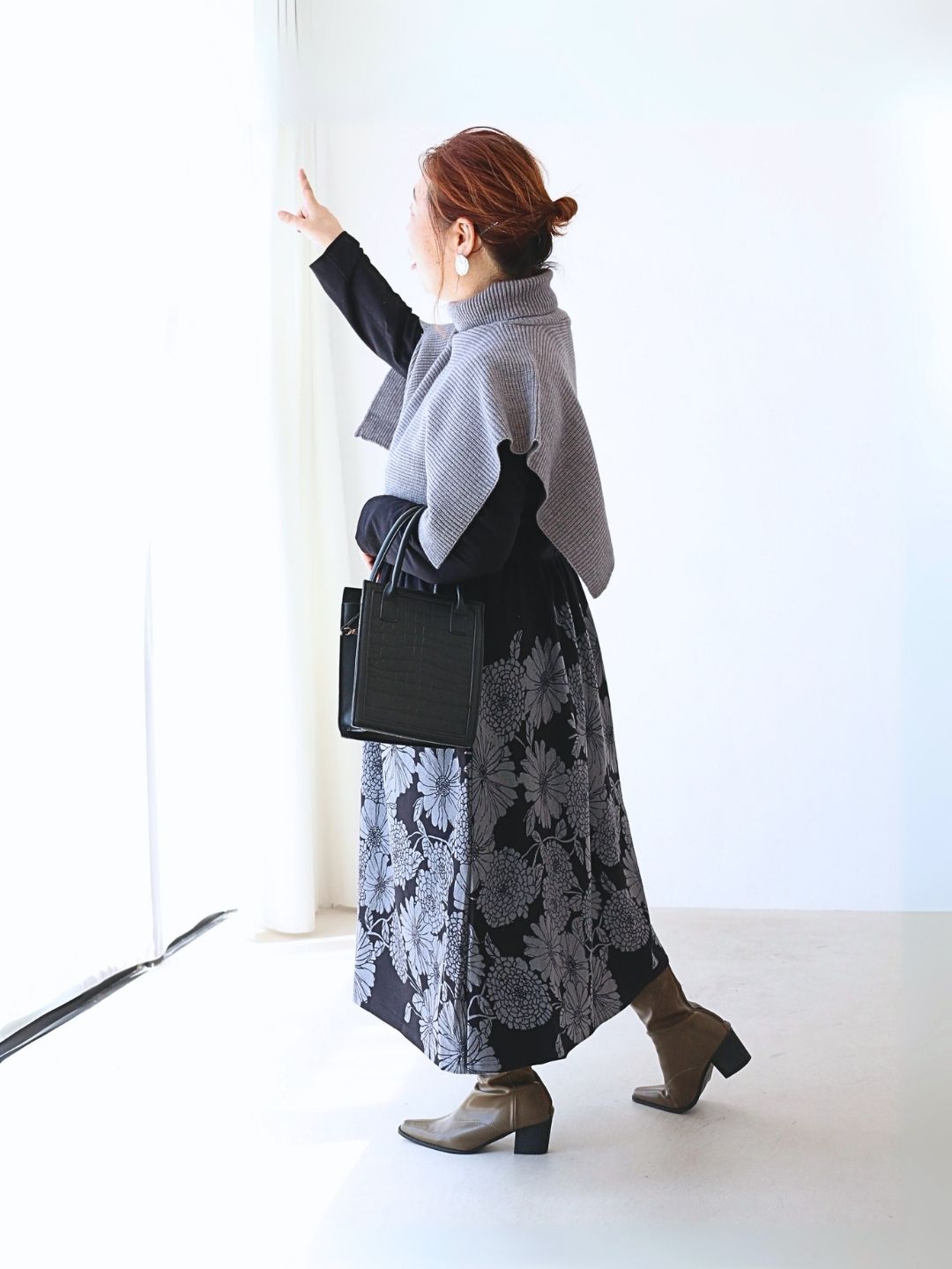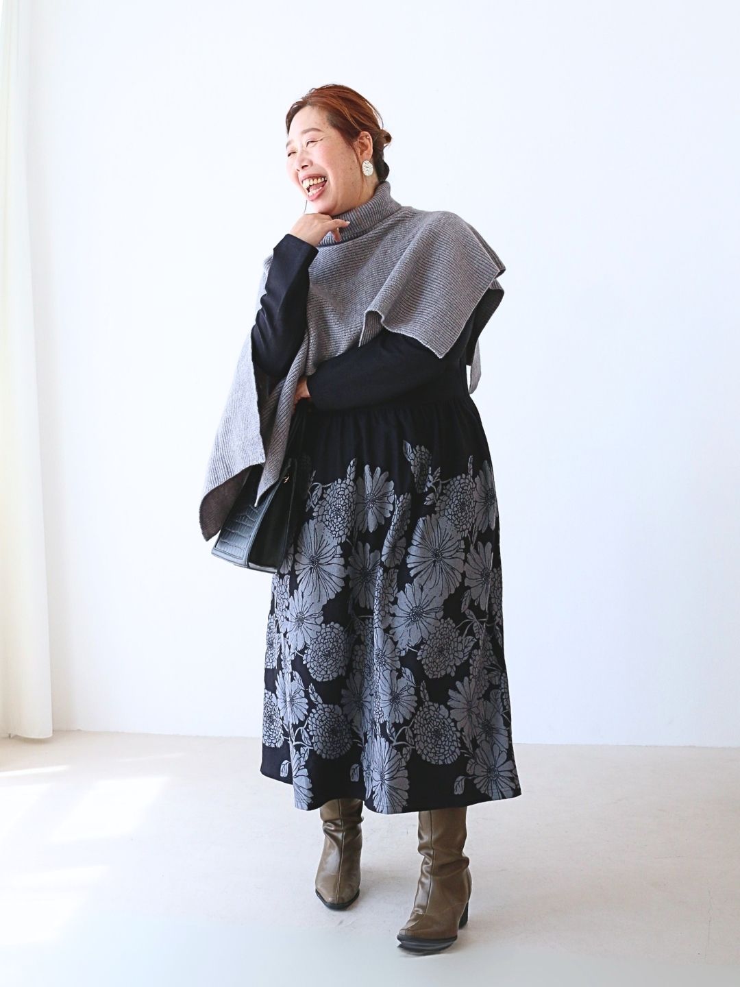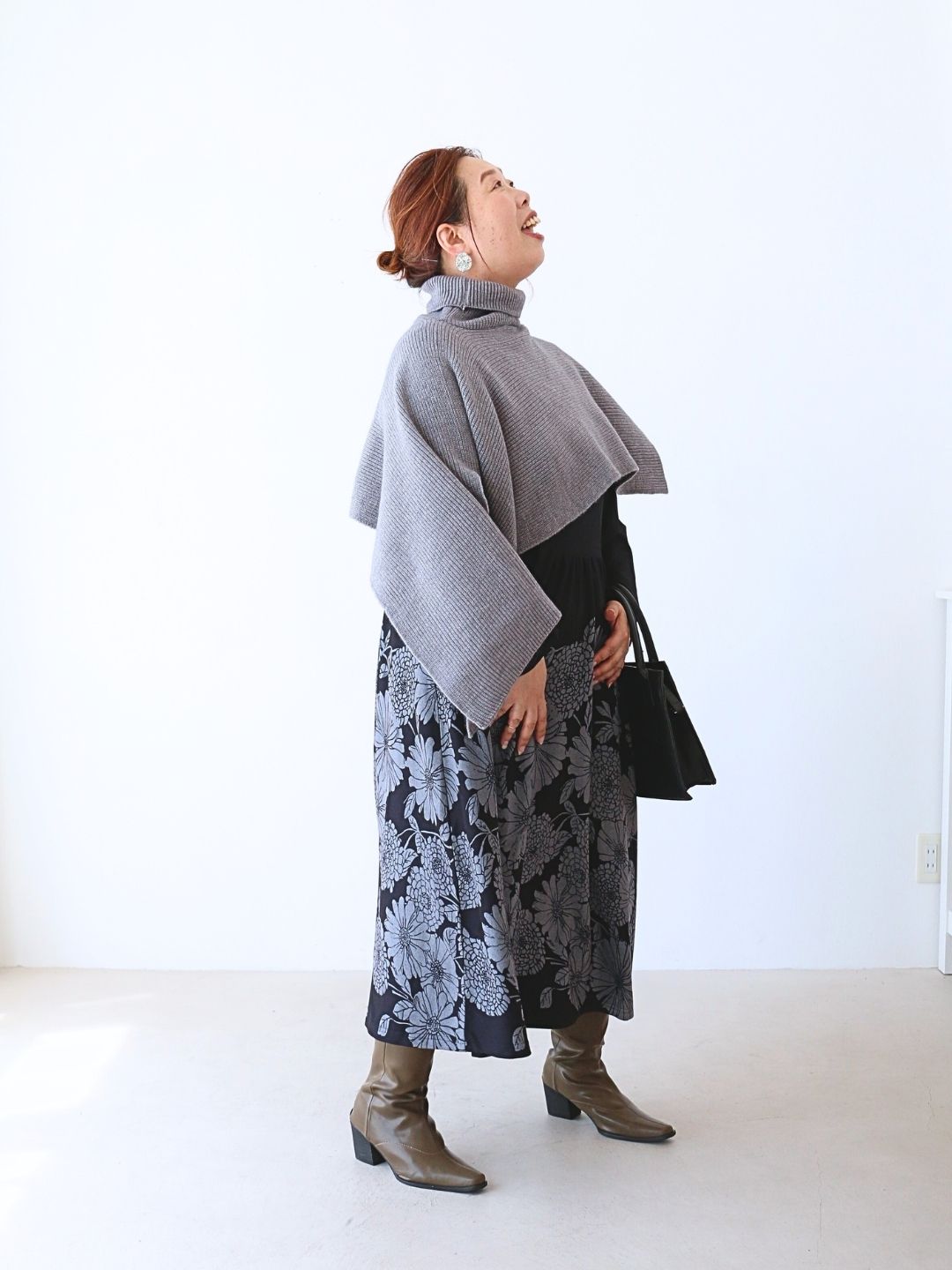 大ぶりの花柄ワンピにグレーニットのケープを重ねた、華やかで知的な美術館コーデ。