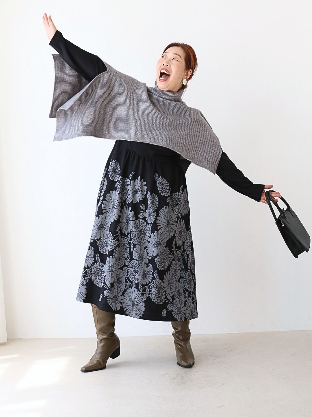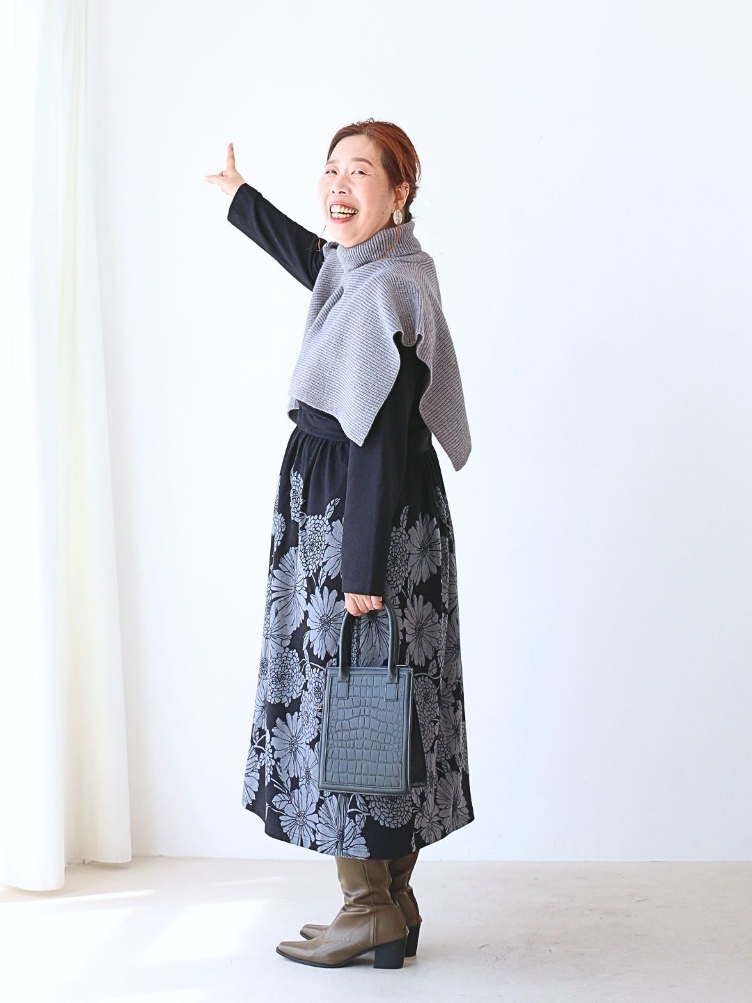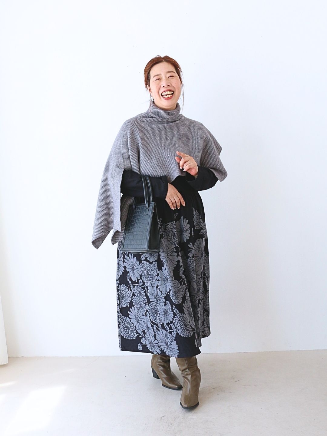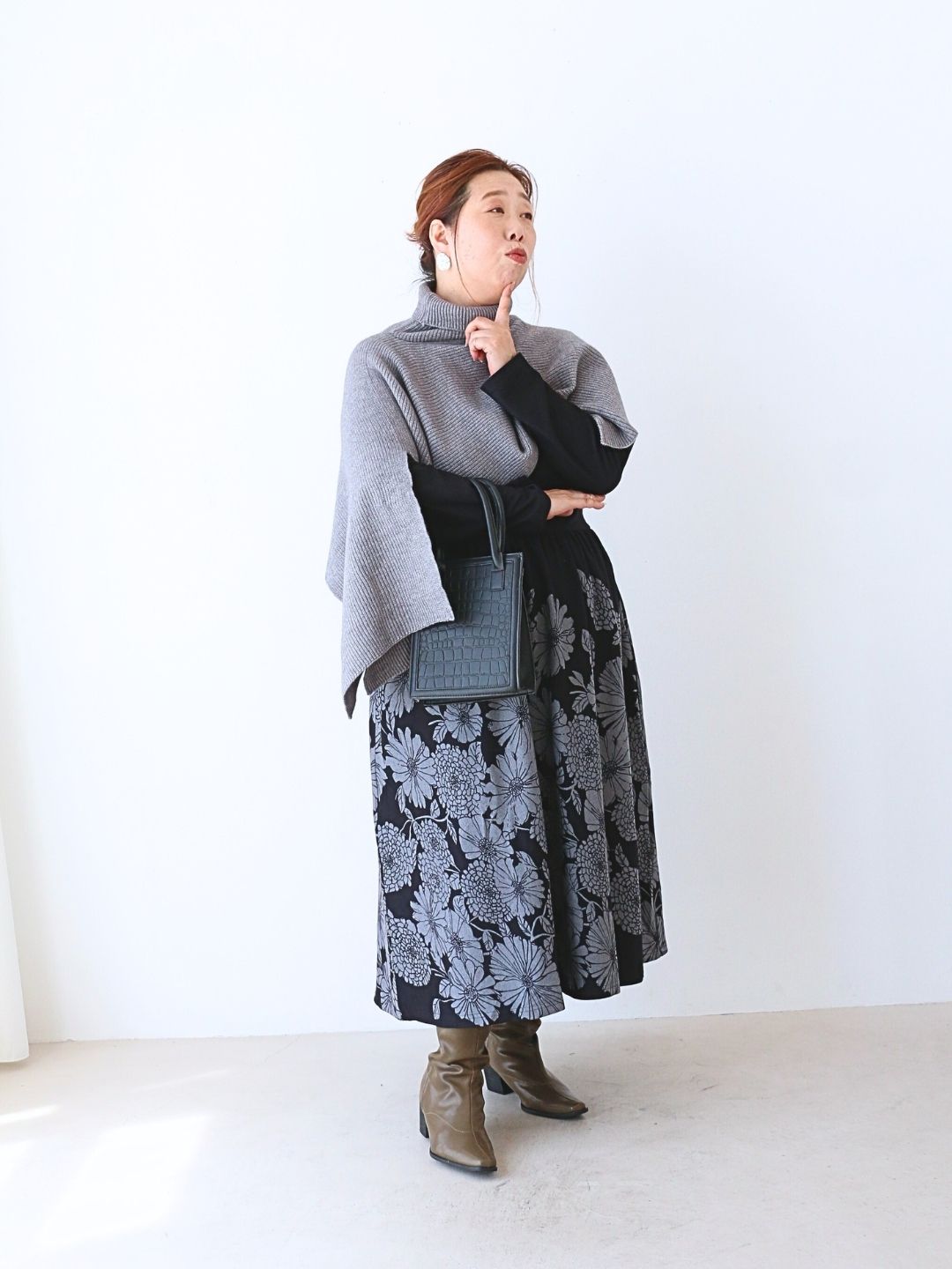 大ぶりの花柄ワンピにグレーニットのケープを重ねた、華やかで知的な美術館コーデ。