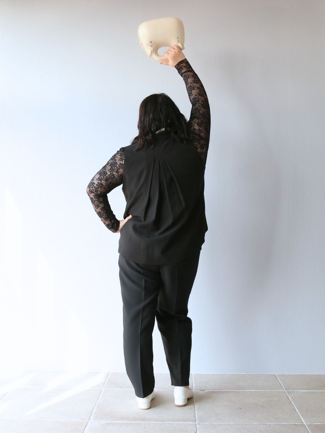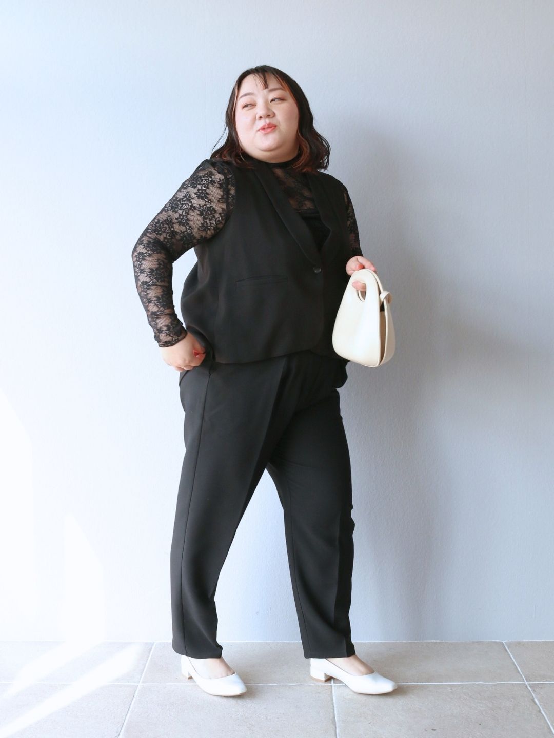 ふんわりレースのインナー×タキシード風ベスト&テーパードパンツのモノトーンセットが、“ぽっちゃりでもシルエット美”を叶え、きちんと感と自分らしさを両立させたフォーマルスタイルです。
