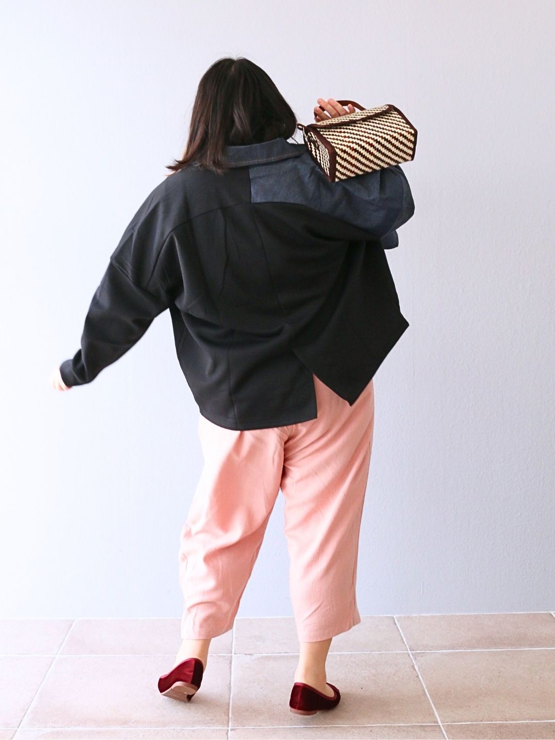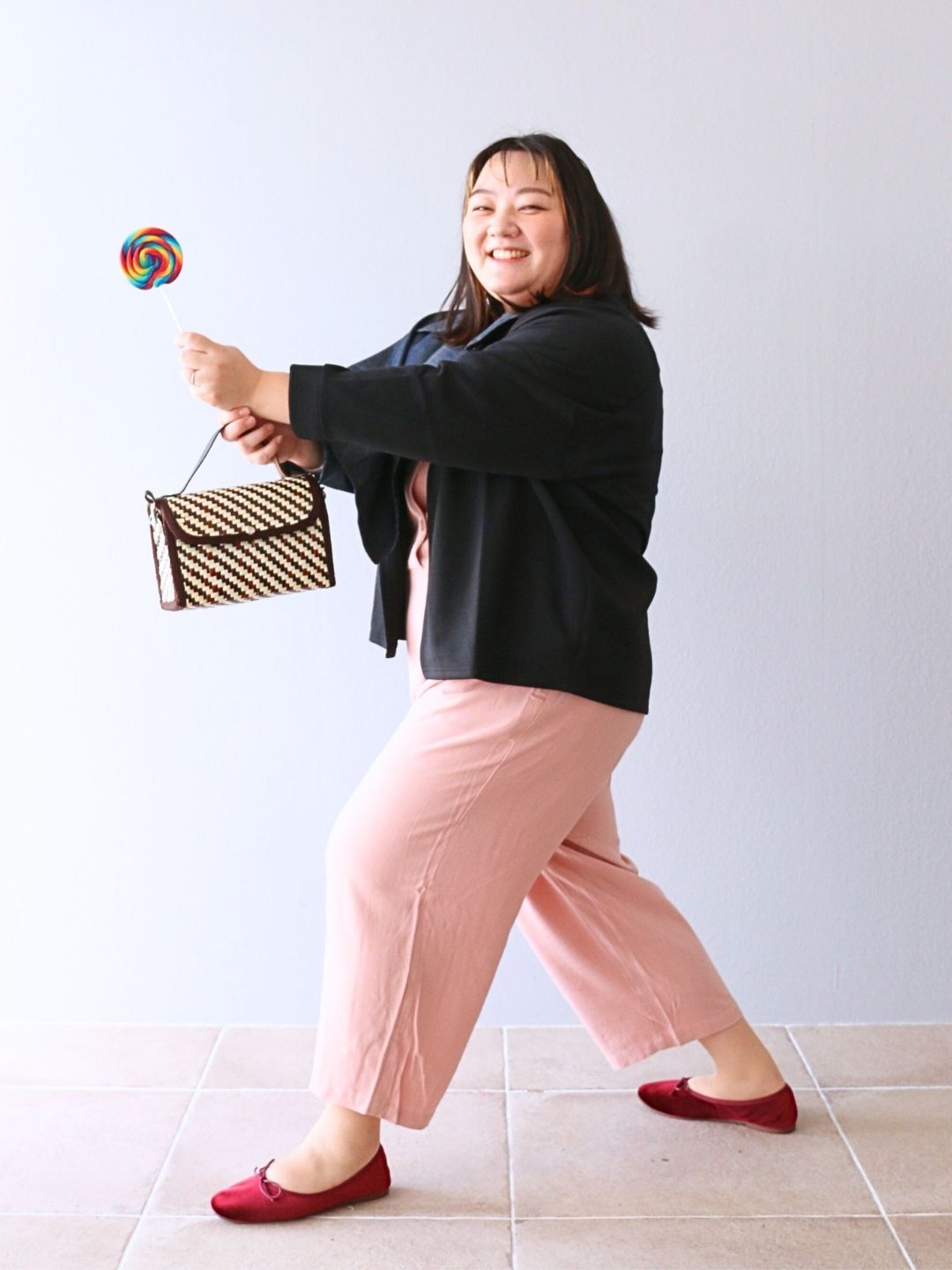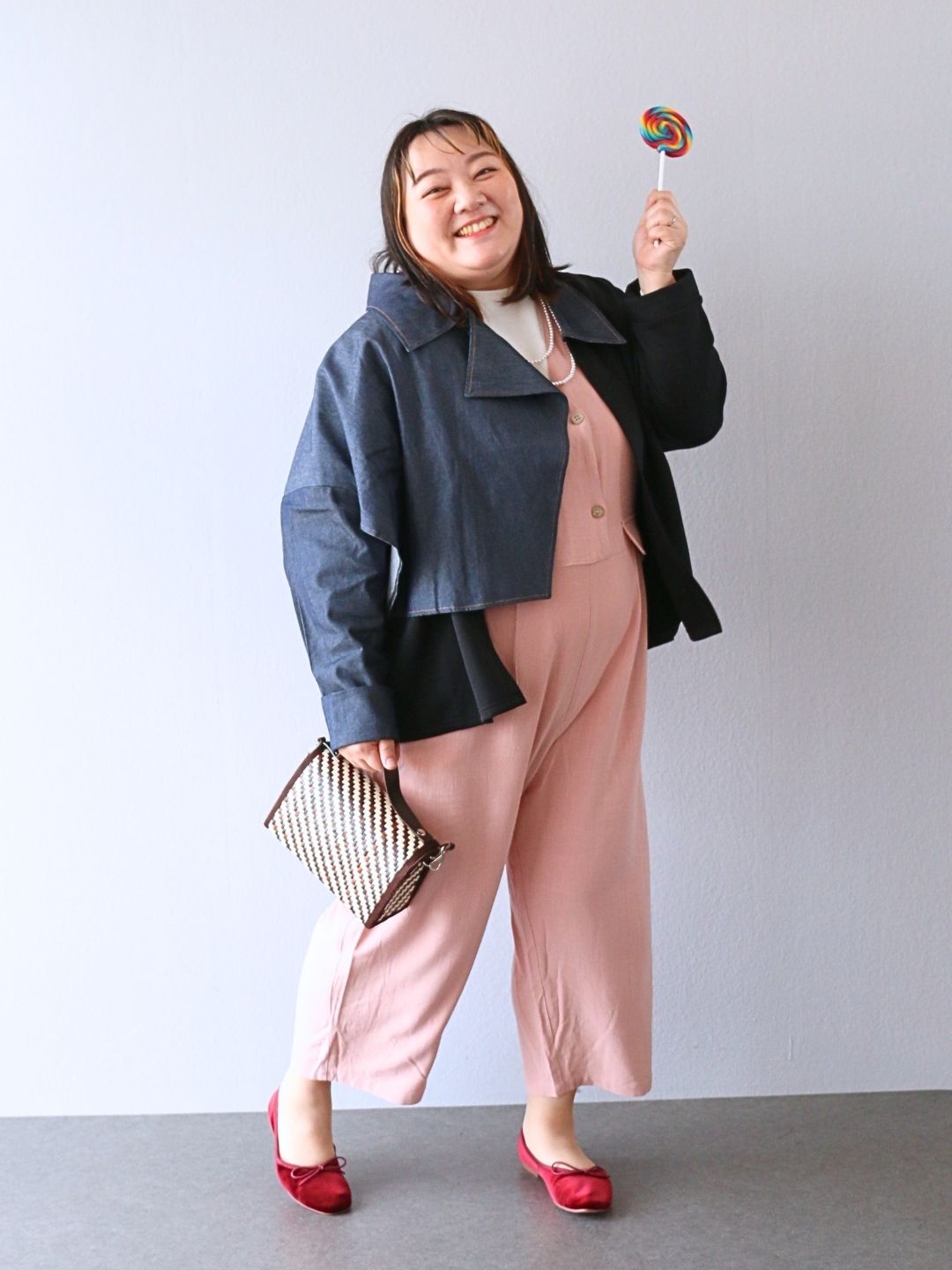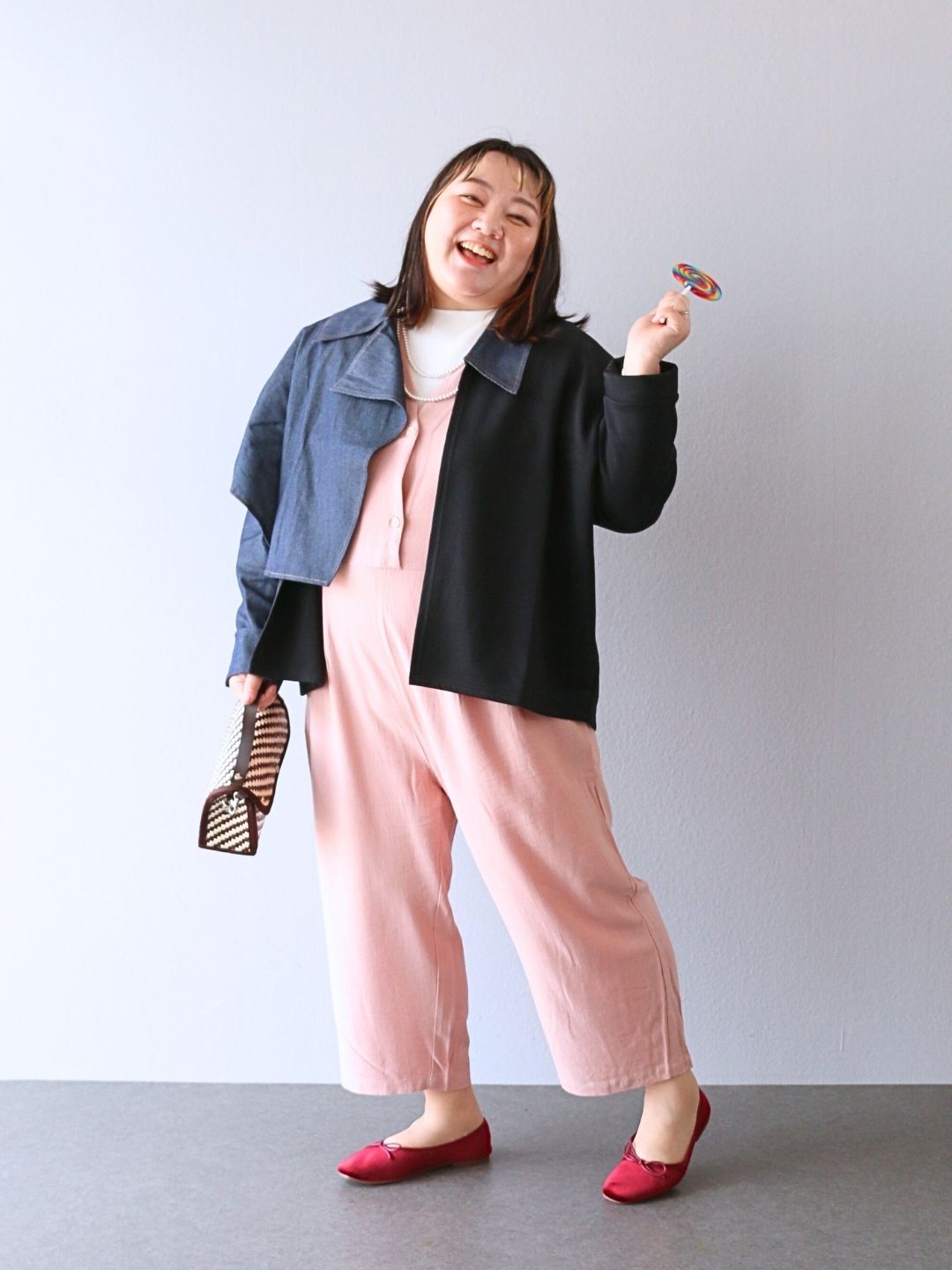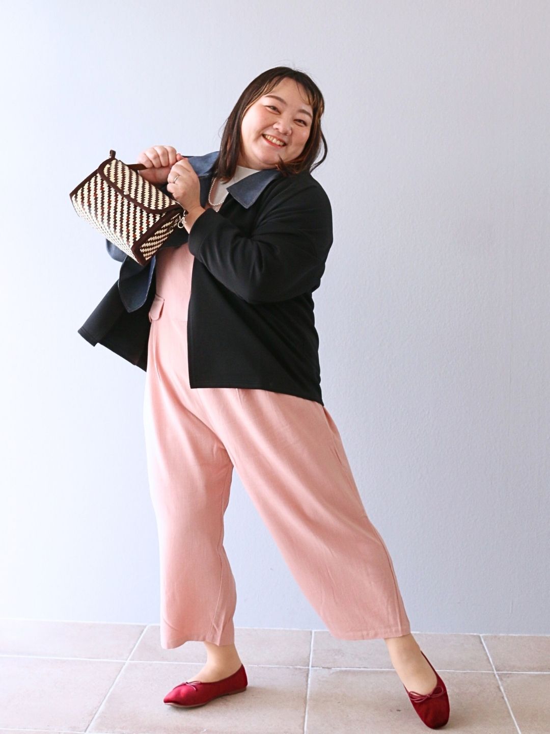ピンクのサロペットが縦のラインを作り、リラックス感が
