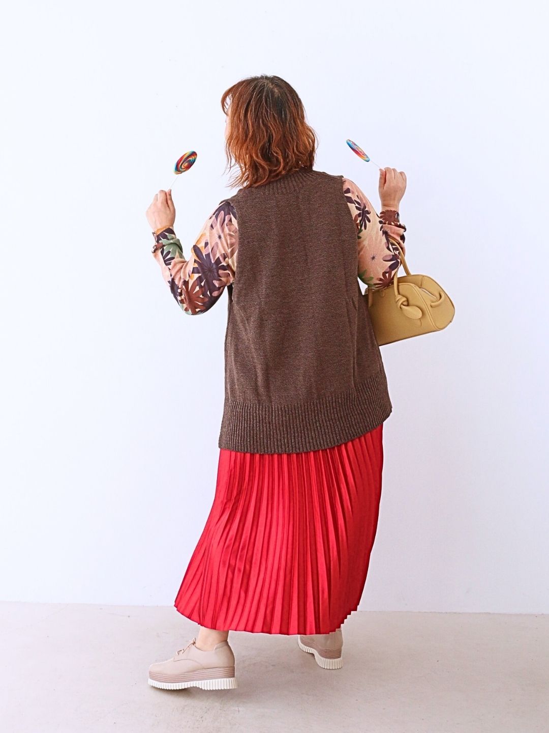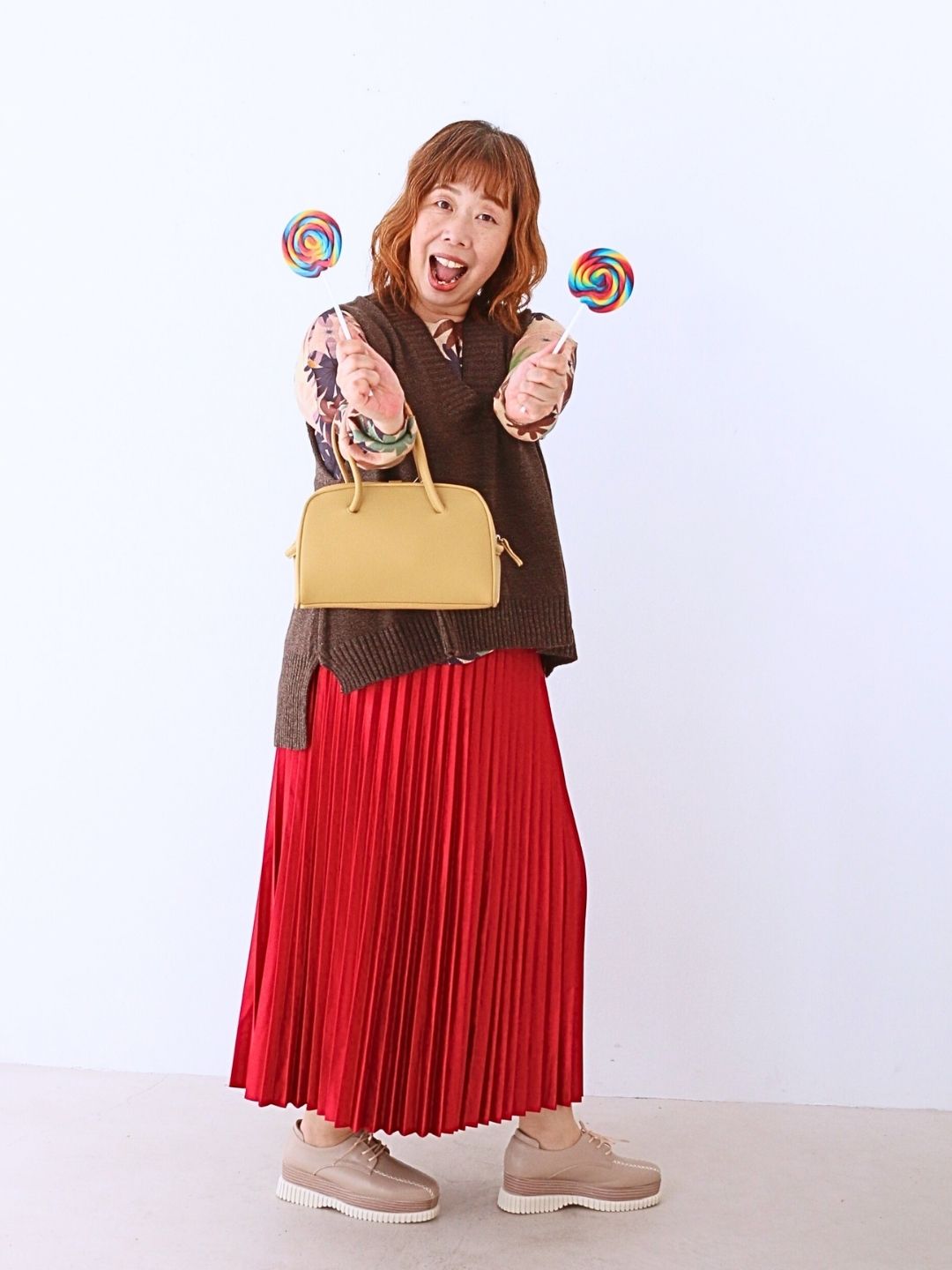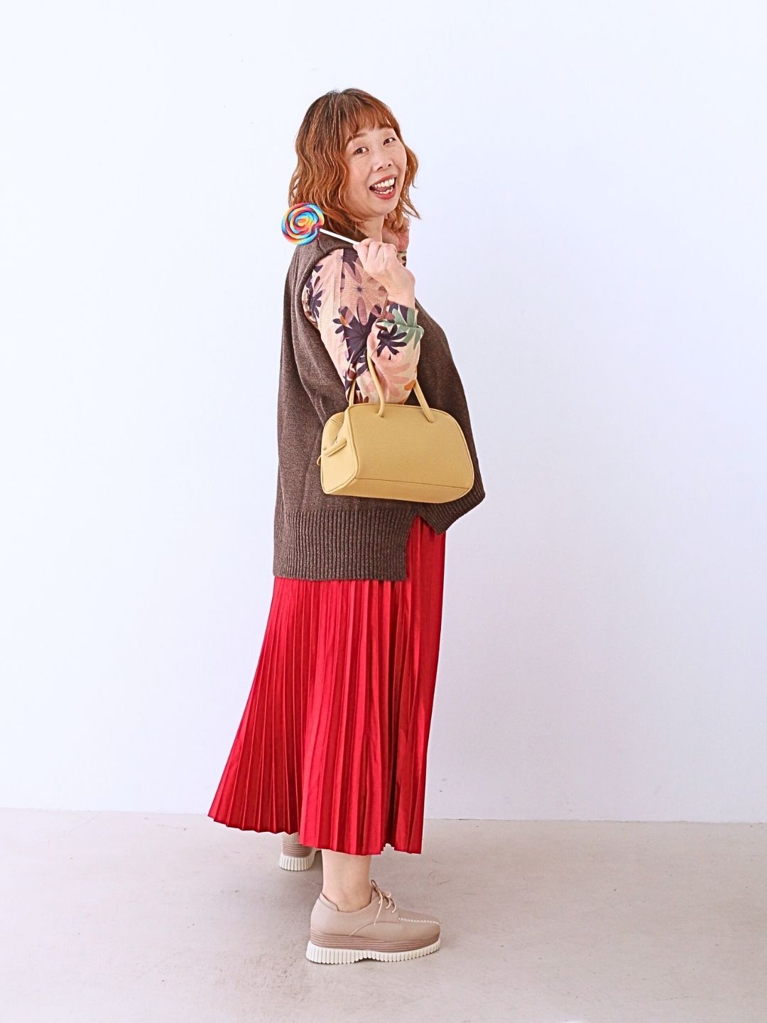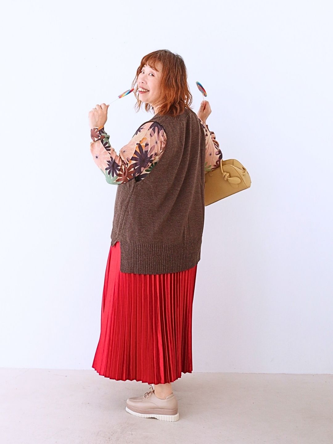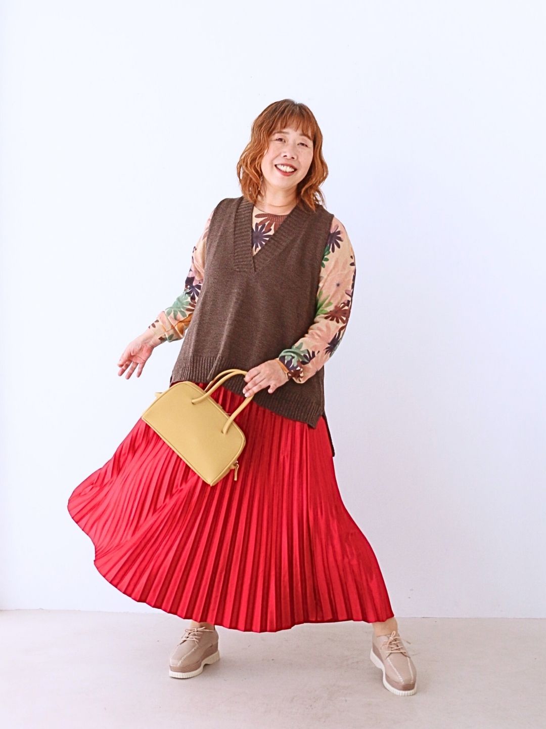 トレンド色の1つであるレッドのプリーツスカートが主役。インナーには個性的な花柄をあえて取り入れ、ファッションを楽しむ姿勢を大胆に表現しました。花柄にブラウンのVネックベストを重ね、視線をVラインに集中、上半身にシャープな縦長効果を。マスタードイエローのバッグとブラウンのシューズで全体のトーンを統一し、季節感のある大人カジュアルに仕上げました。