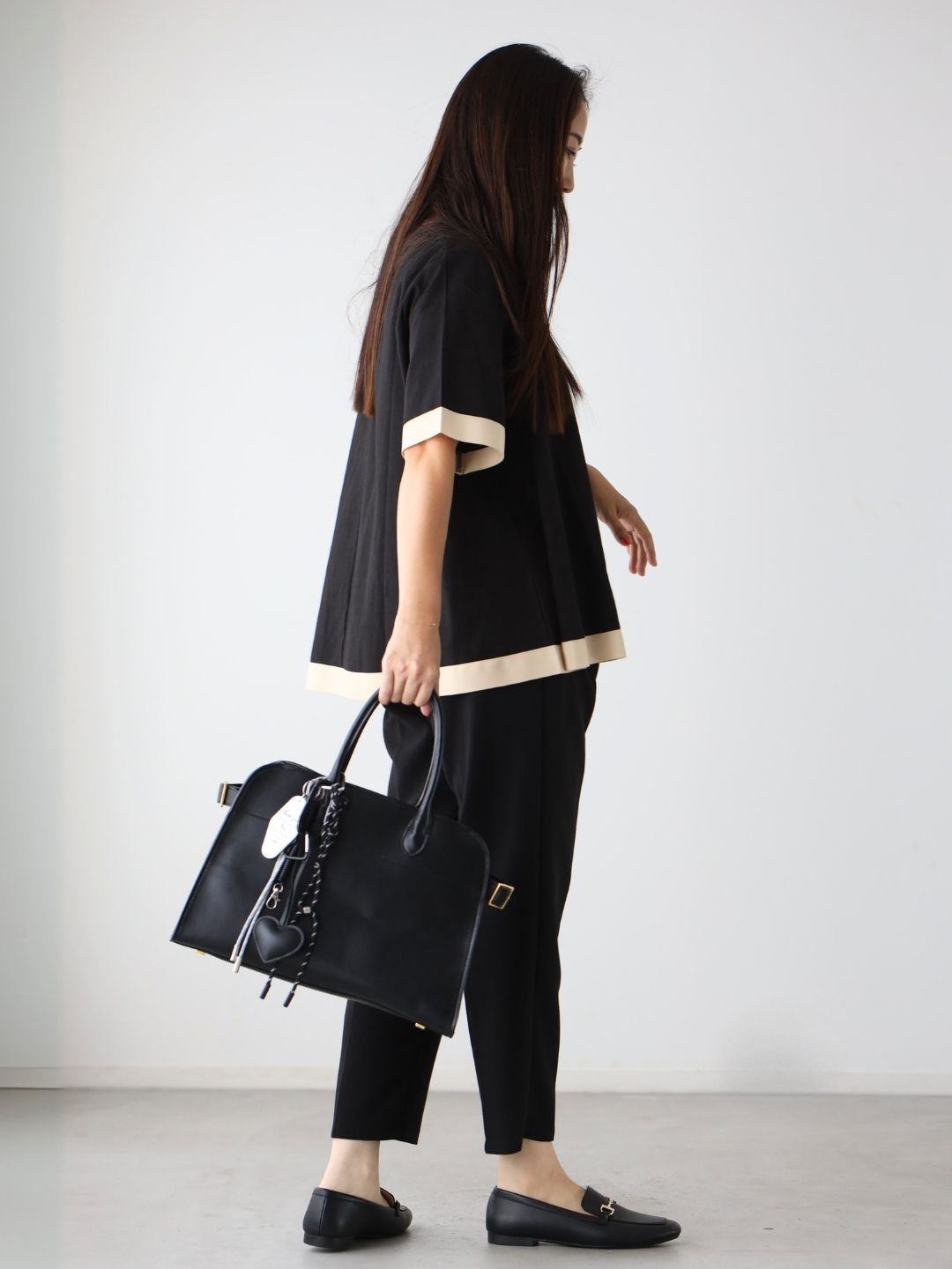バイカラートップスのライン効果で「メリハリと抜け感」が生まれ、すっきりと洗練された印象に。