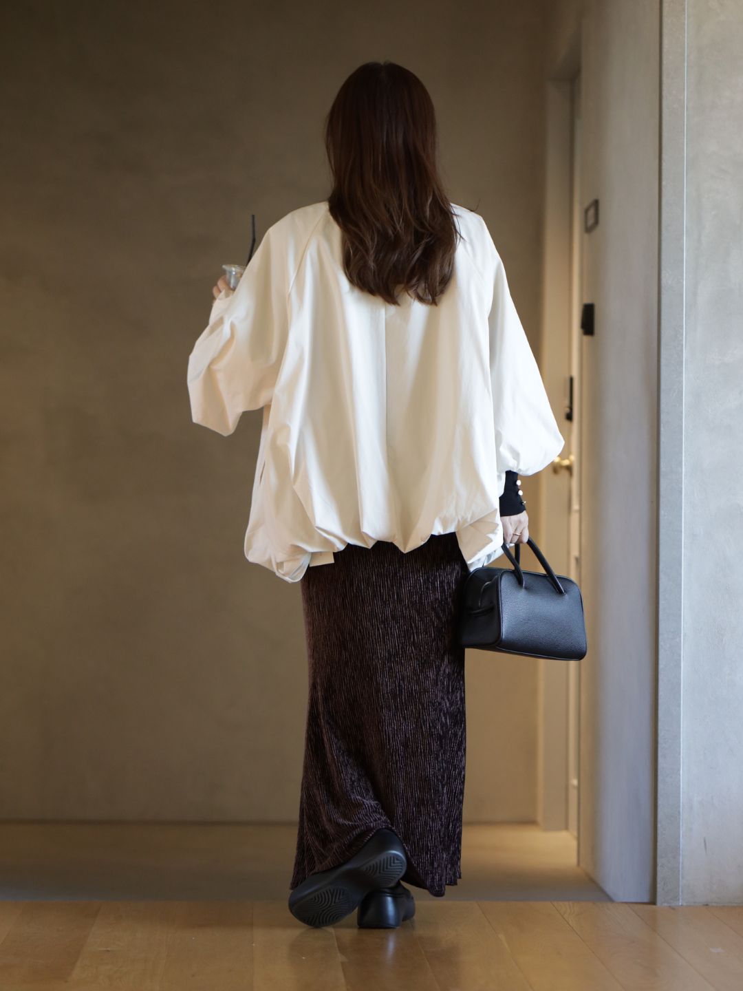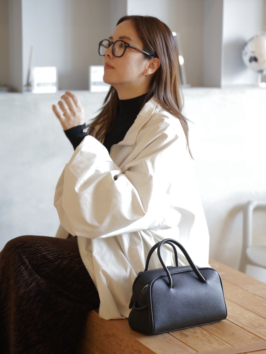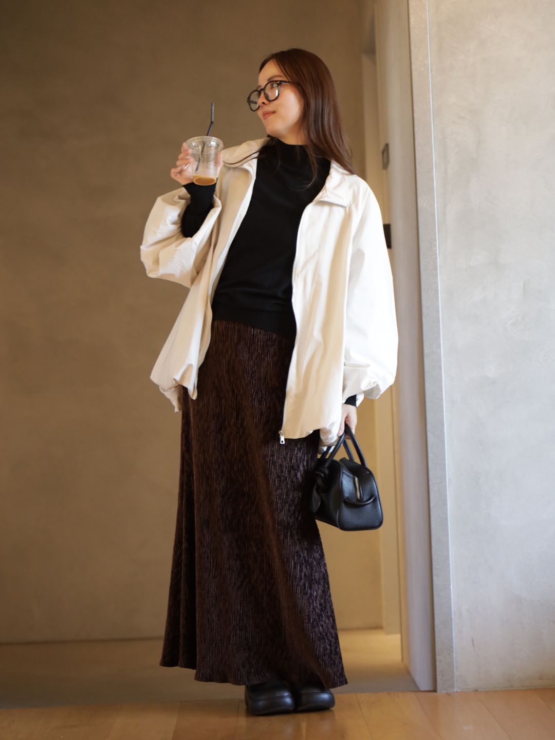 オーバーサイズの白アウターと落ち感のあるブラウンスカートが織りなす、大人の抜け感コーデ。