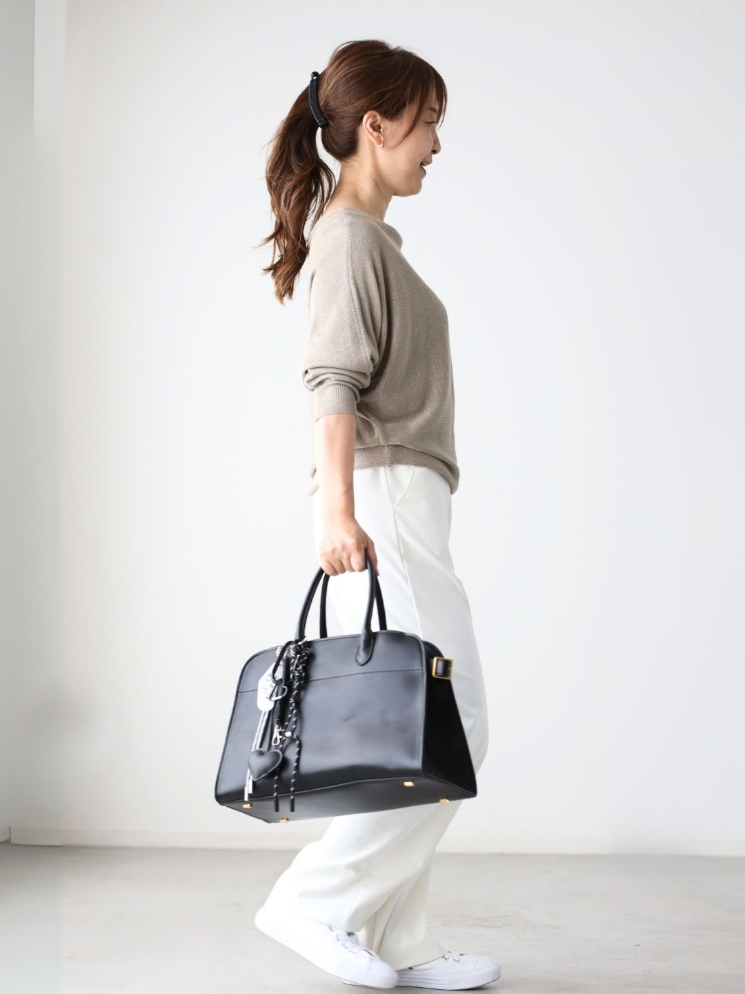 チャーム付きの大きめバッグでコーデにアクセントを。