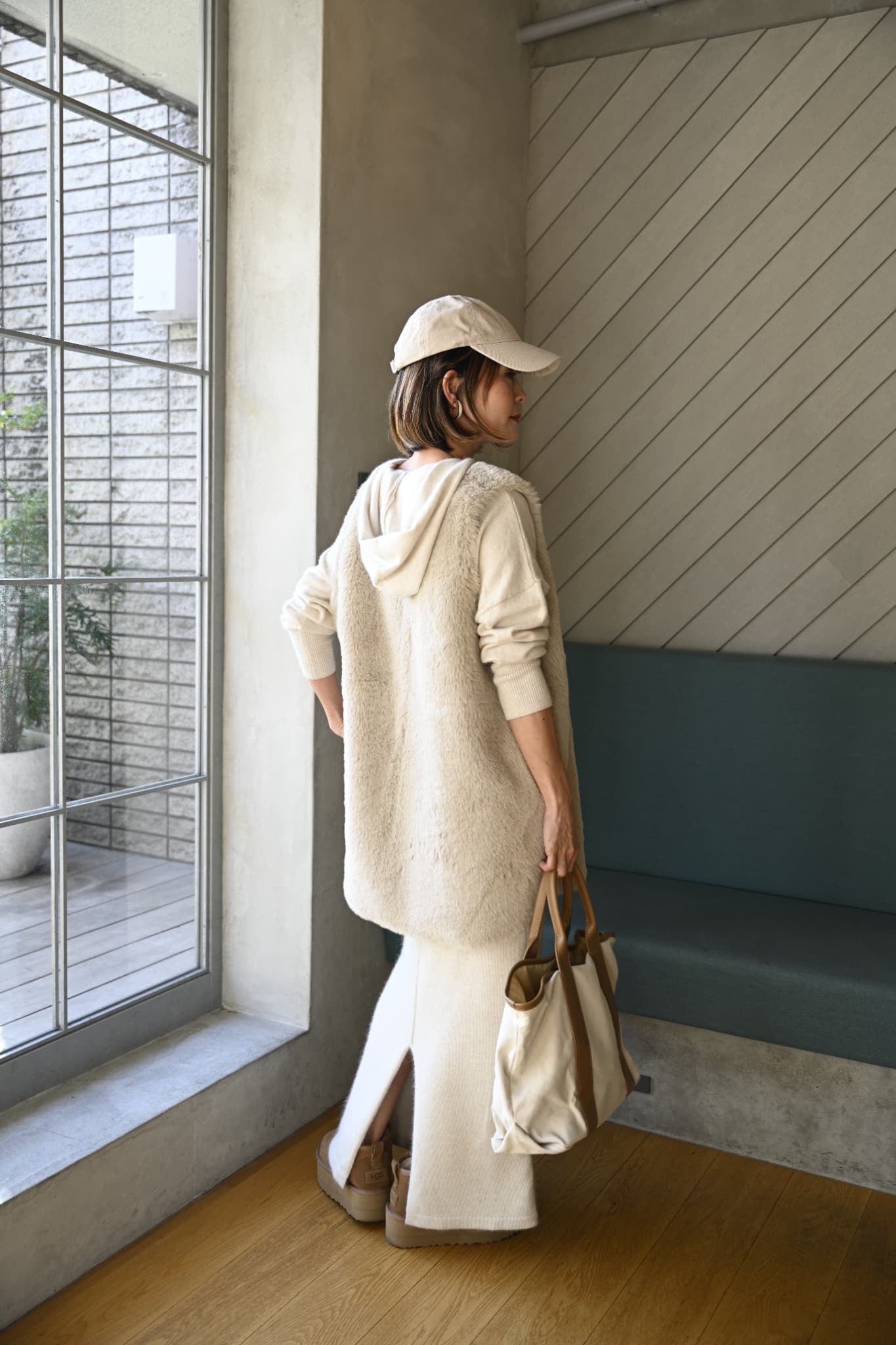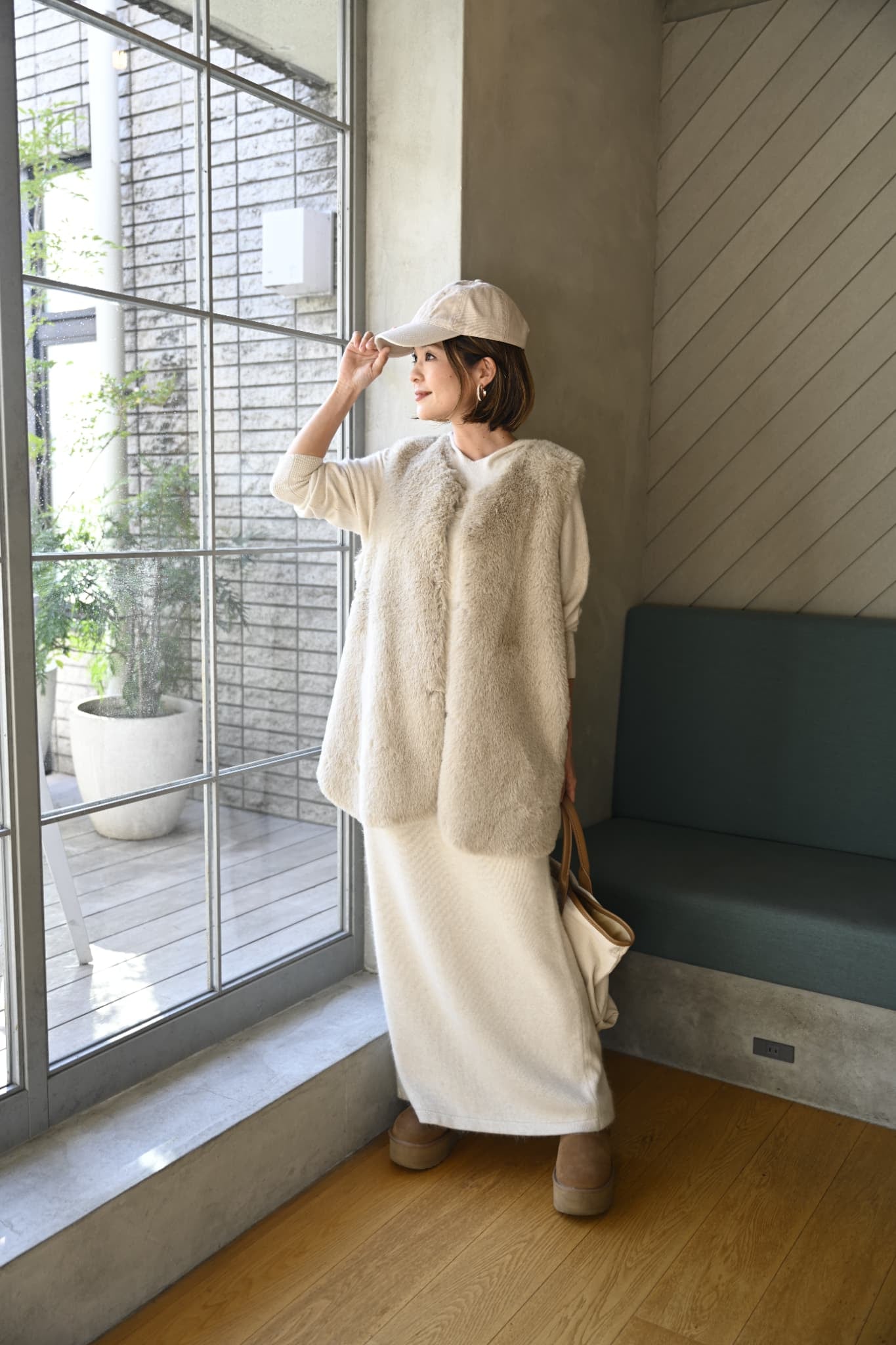 ニットセットアップにファーベストを重ねた、やわらかなアイボリーワントーンコーデ。