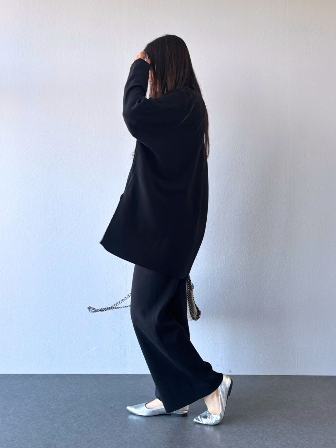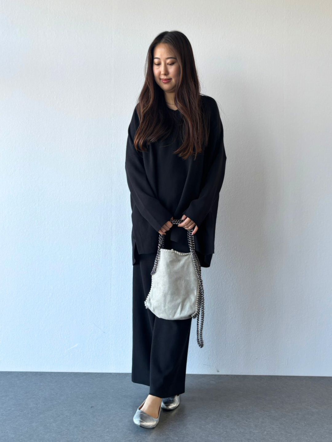 全身ブラックに、シルバーのバッグとフラットシューズがアクセントとなり、洗練度をアップ。
