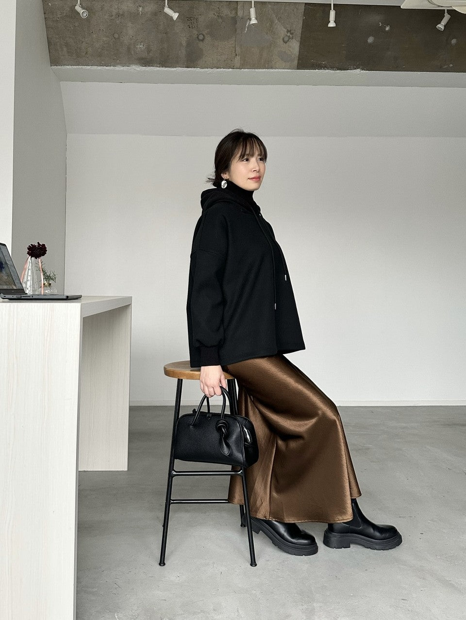 カジュアルなフーディーに艶感のあるスカートを合わせて、女性らしさを意識したコーディネートに♪