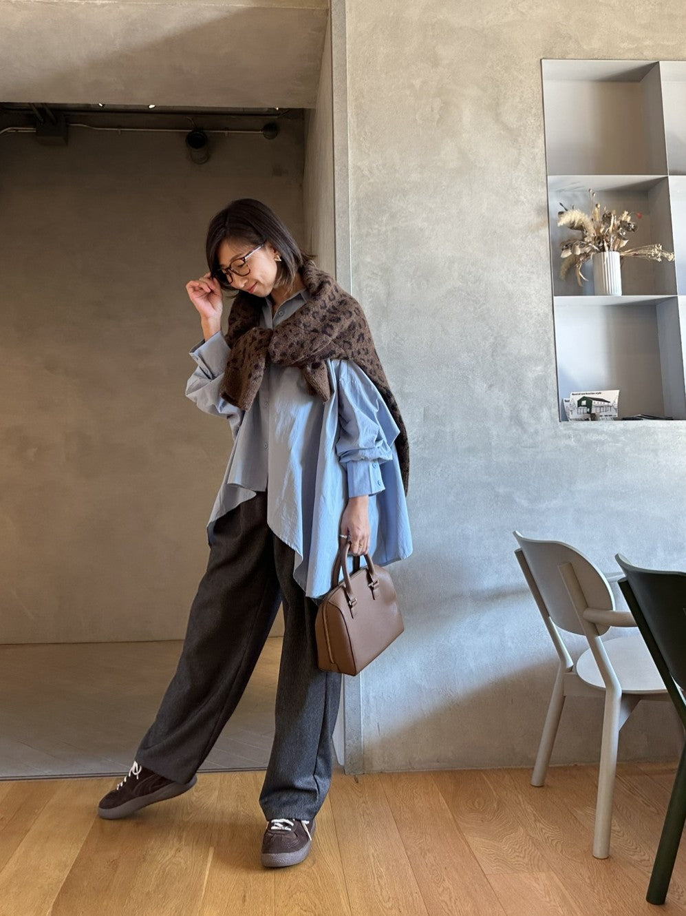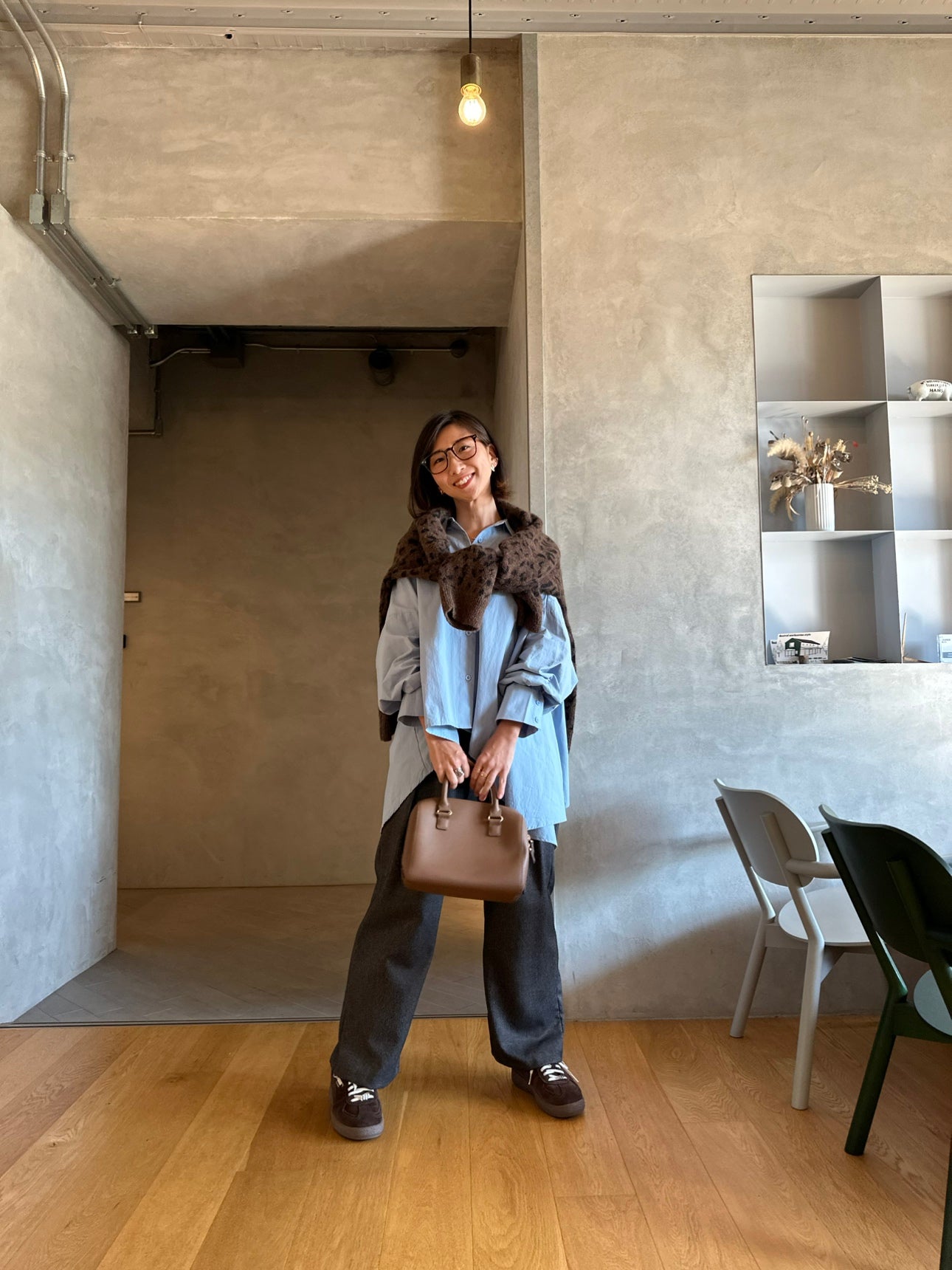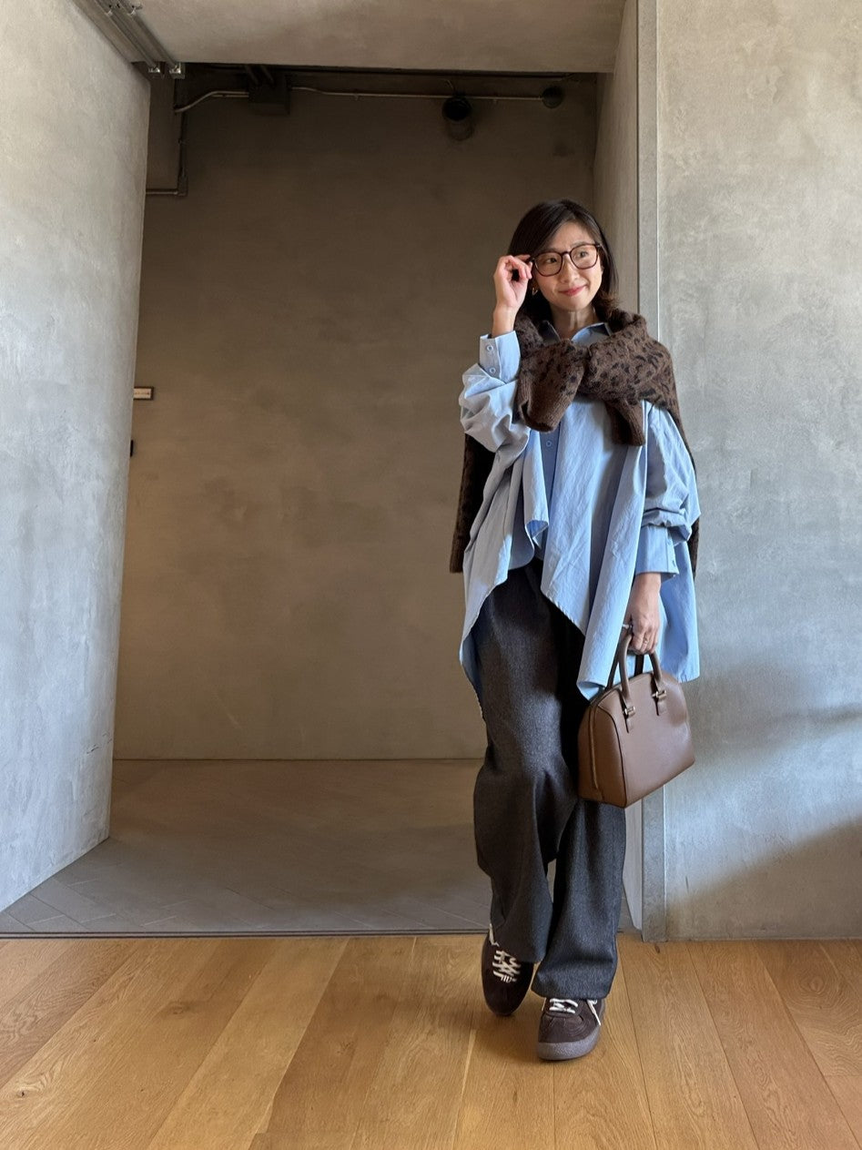 今年はブルー×ブラウンの組み合わせが気になっていたので、さっそく合わせてみました。カラーはブラウン・ブルーのみでまとめてシンプルに。ヒョウ柄ニットやメガネなどの小物で、遊び心もプラスした大人の秋カジュアルスタイル。