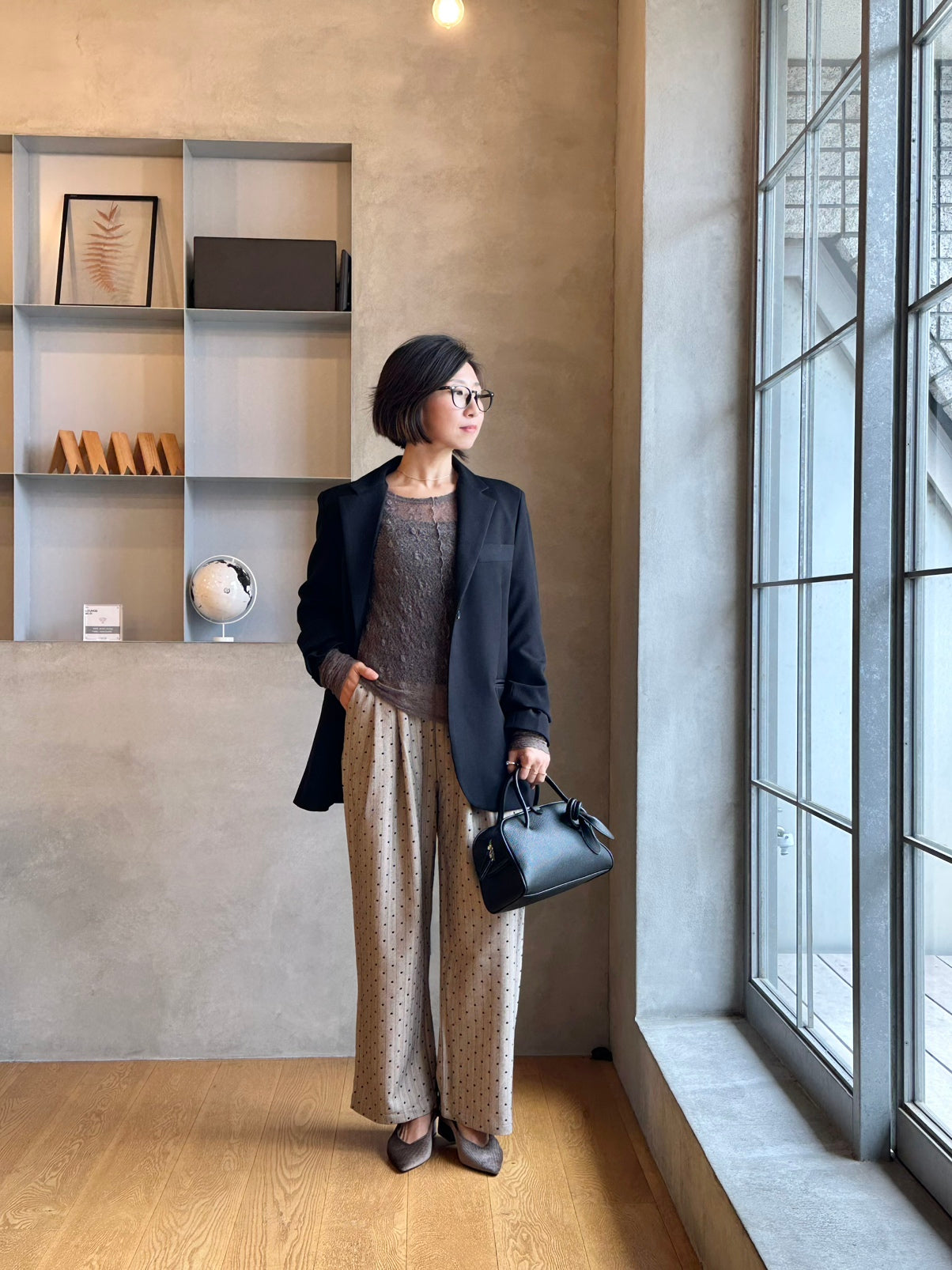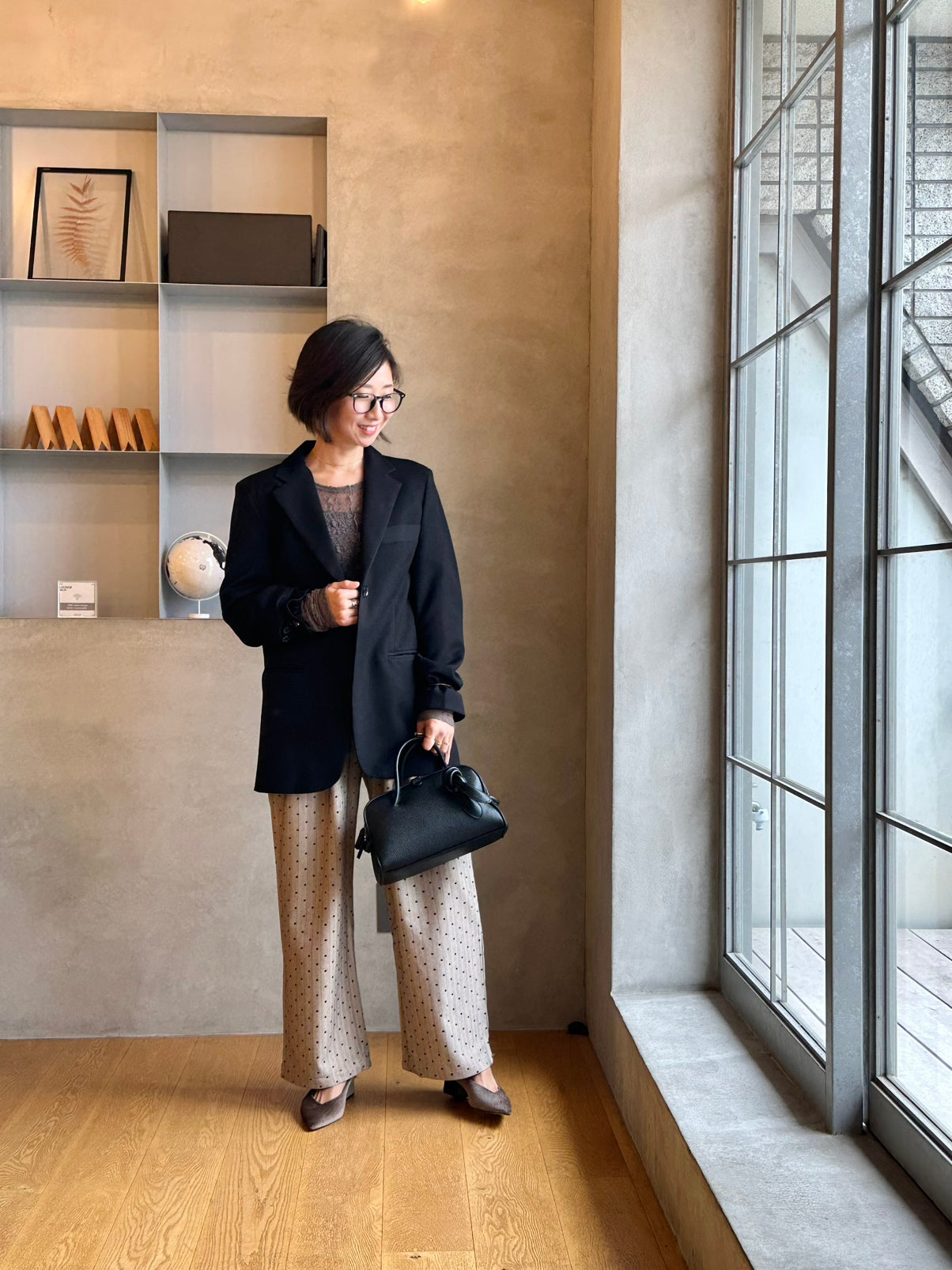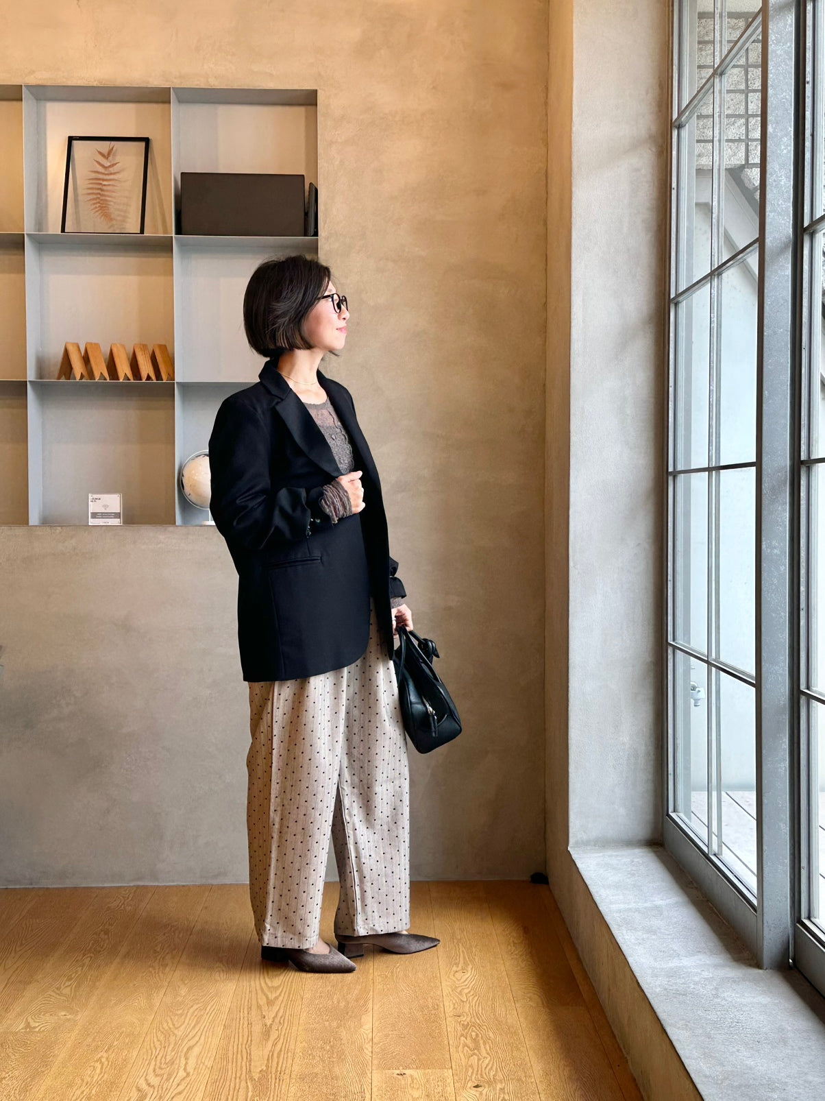 いつものメガネを合わせて、私らしさも忘れない大人レディなコーデにしてみました。
