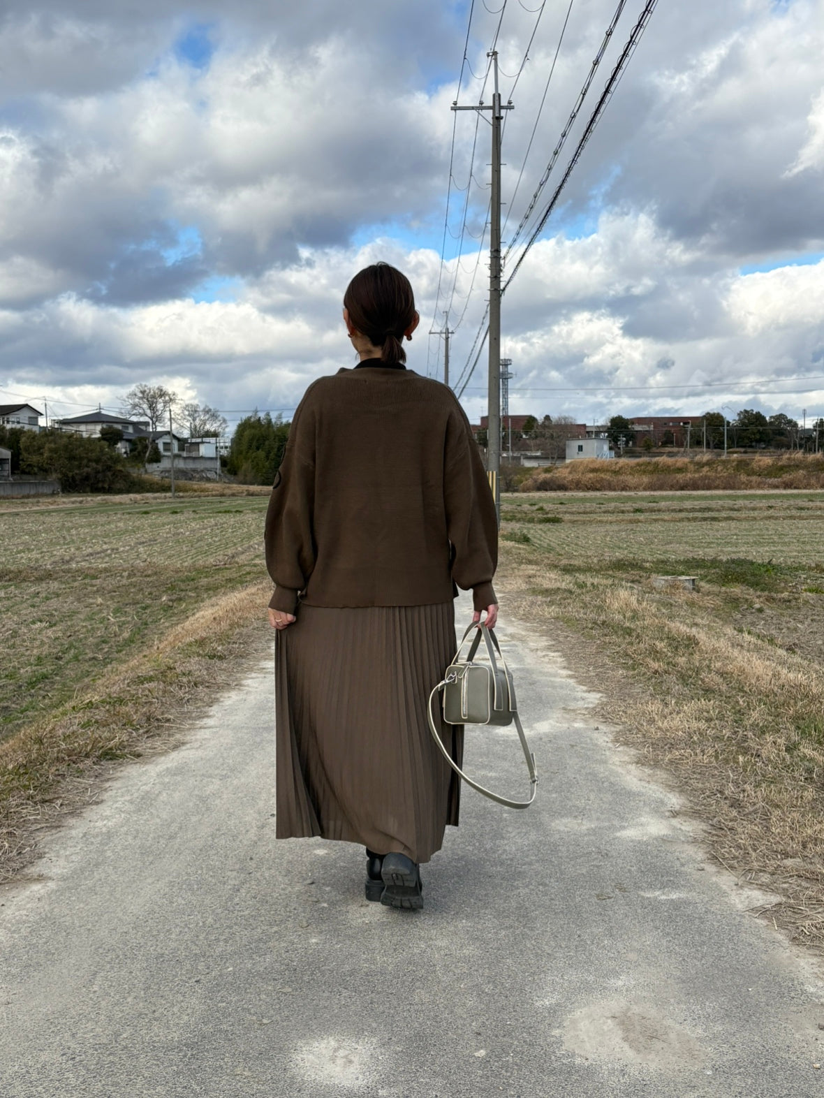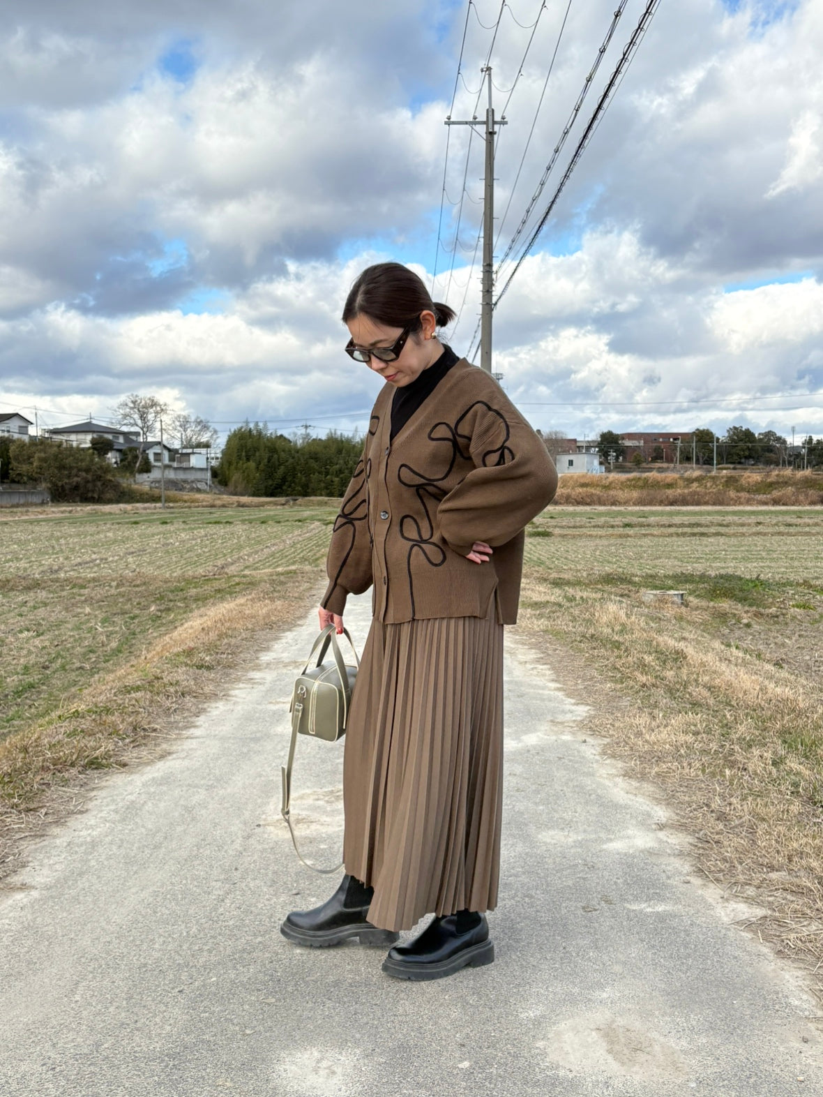 カーキのカーディガンに、モカカラーのプリーツスカートを合わせた深みのある配色。