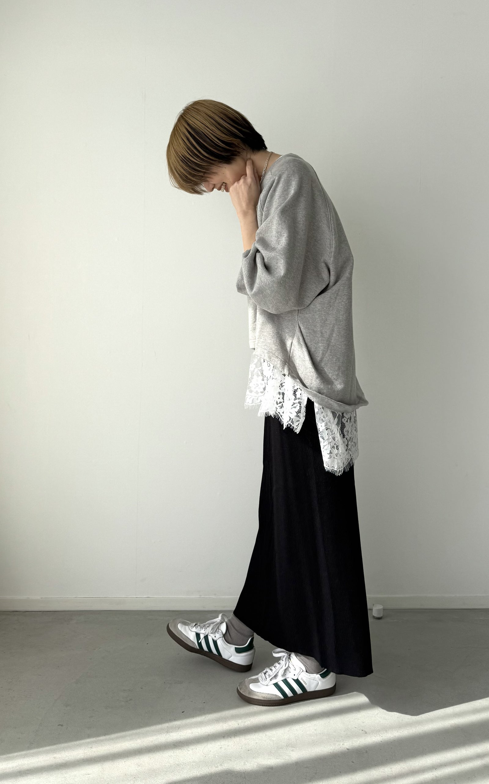 トレンドのレースキャミソールを使った大人のスウェットコーデ。スウェットにレースを合わせて程よくリラックス感のある大人のキレカジコーデに♩春におすすめのコーディネートです。
