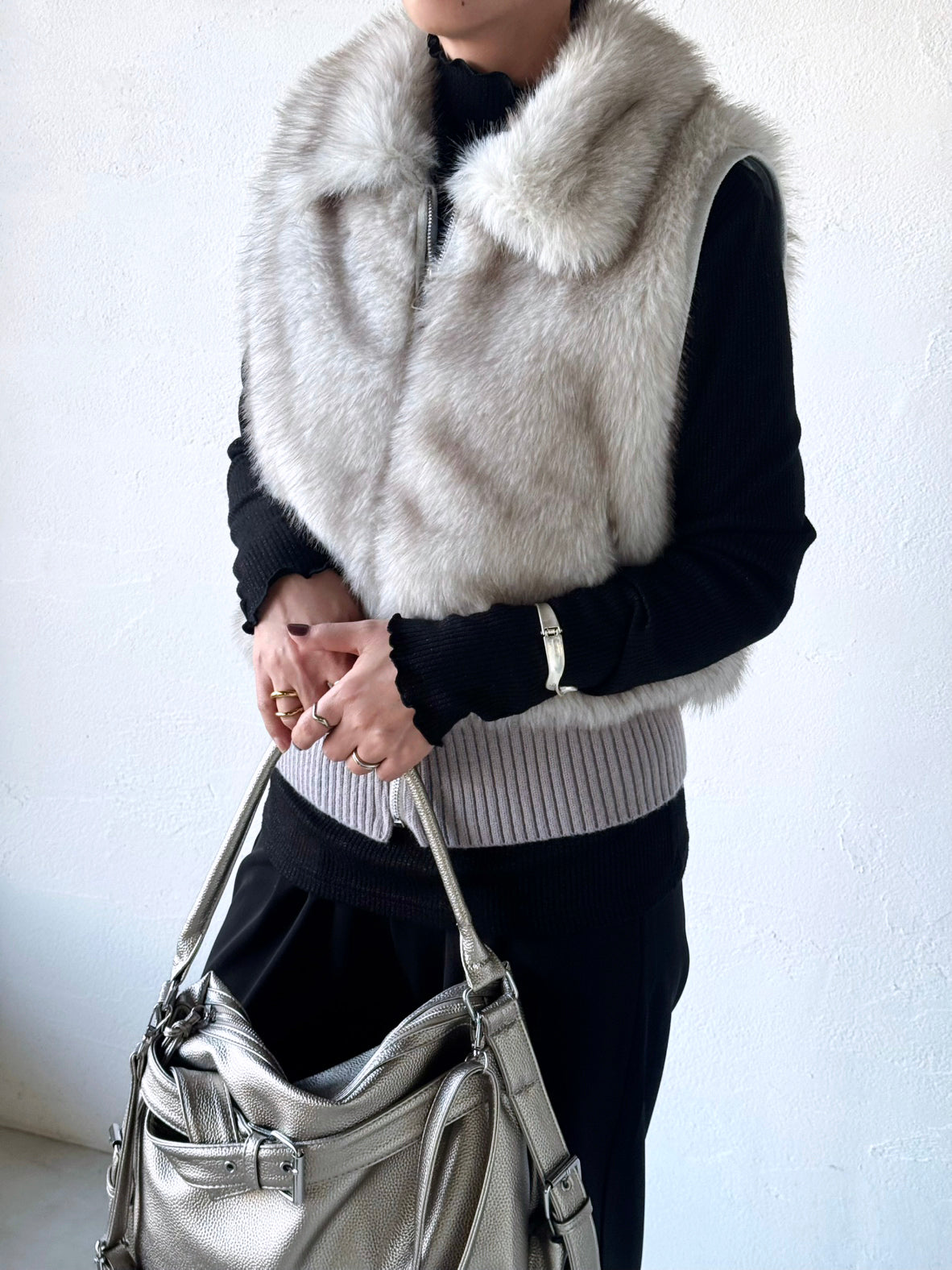 白いファーベストに黒のハイネックを重ね、シンプルながらも凛とした大人のムードに。