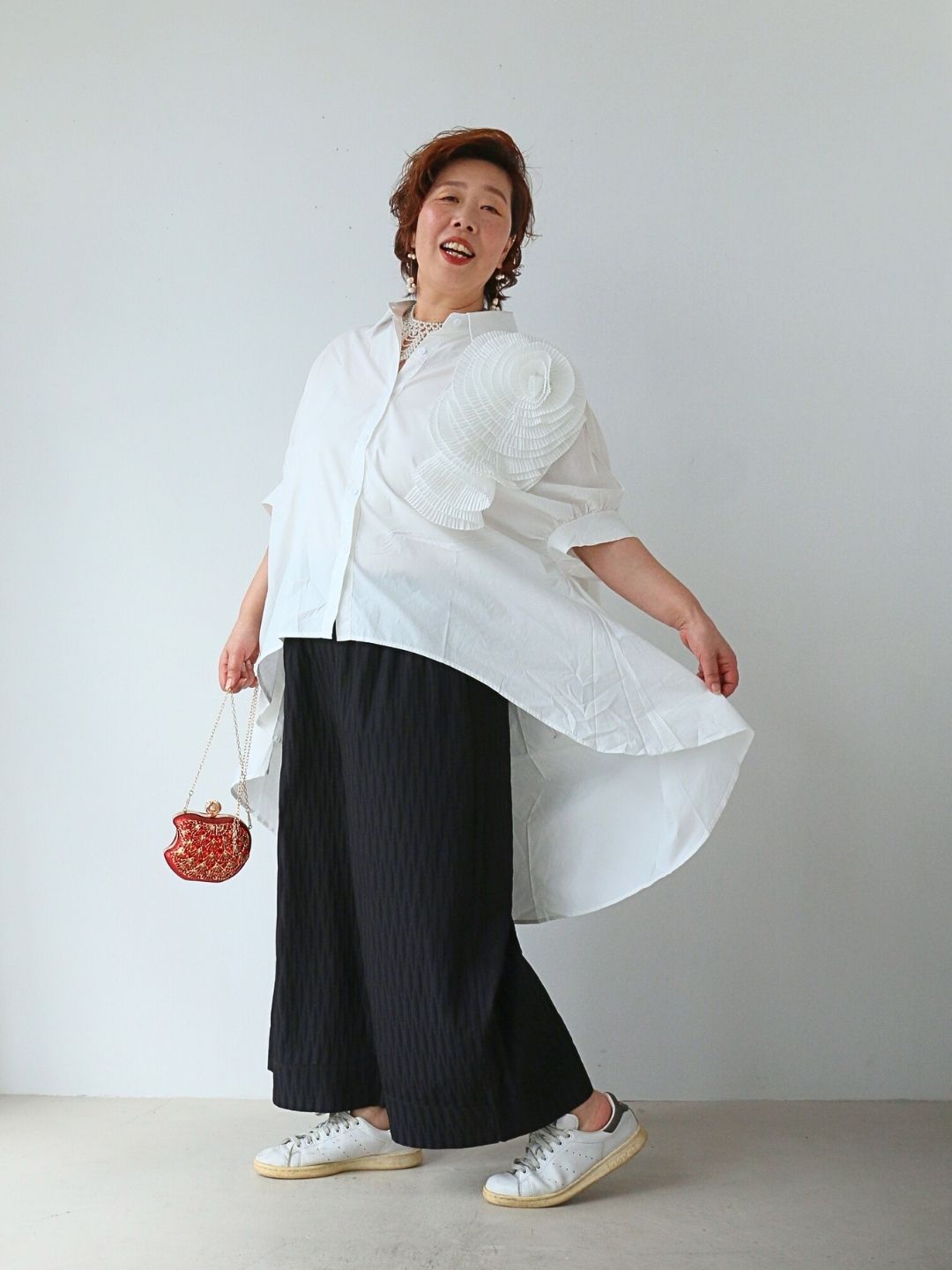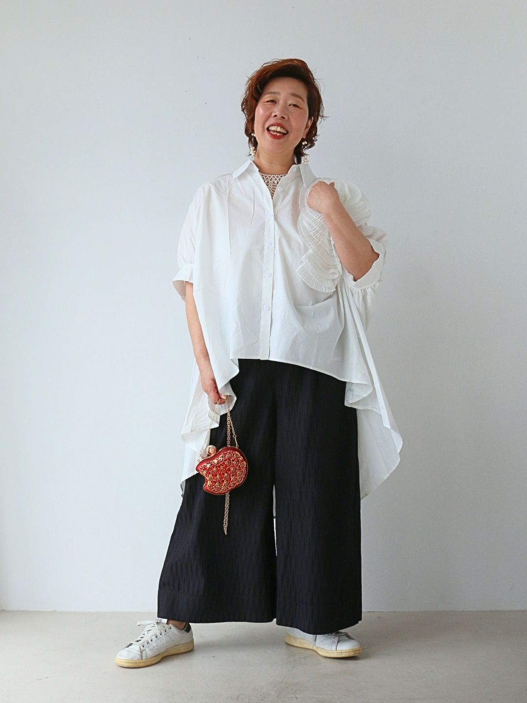 赤のミニバッグがアクセントになり、スニーカーで抜け感も演出。