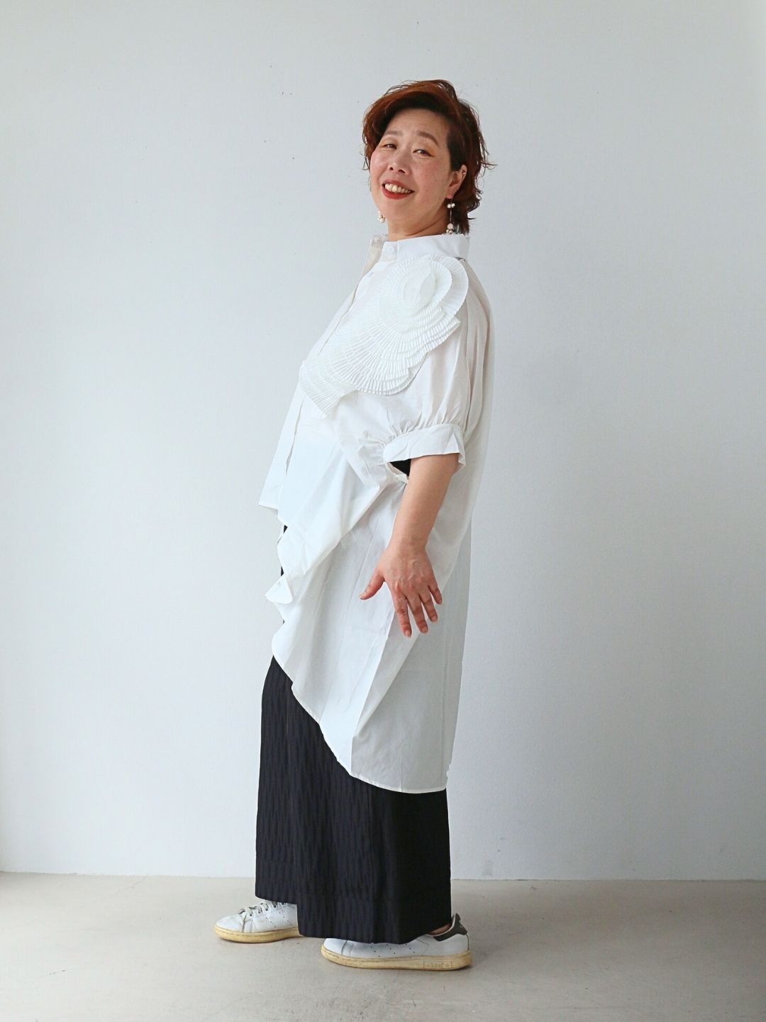 立体フリルの白ブラウスが主役で華やかさ抜群!