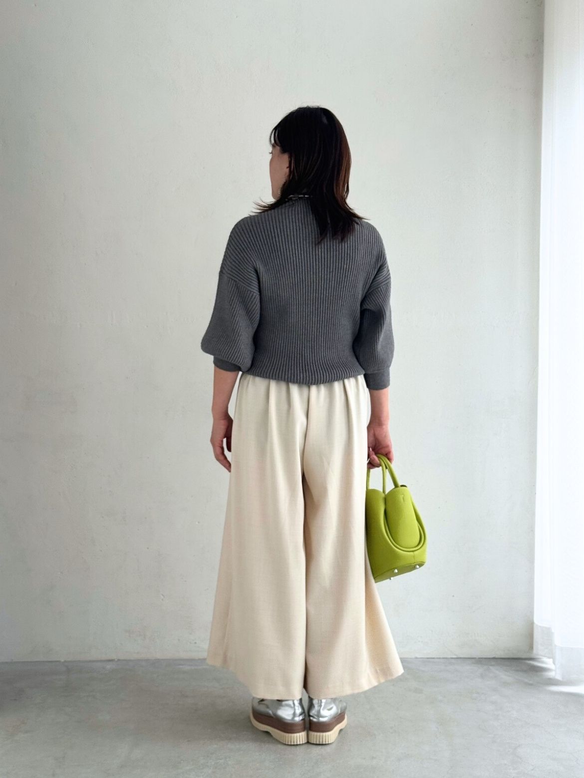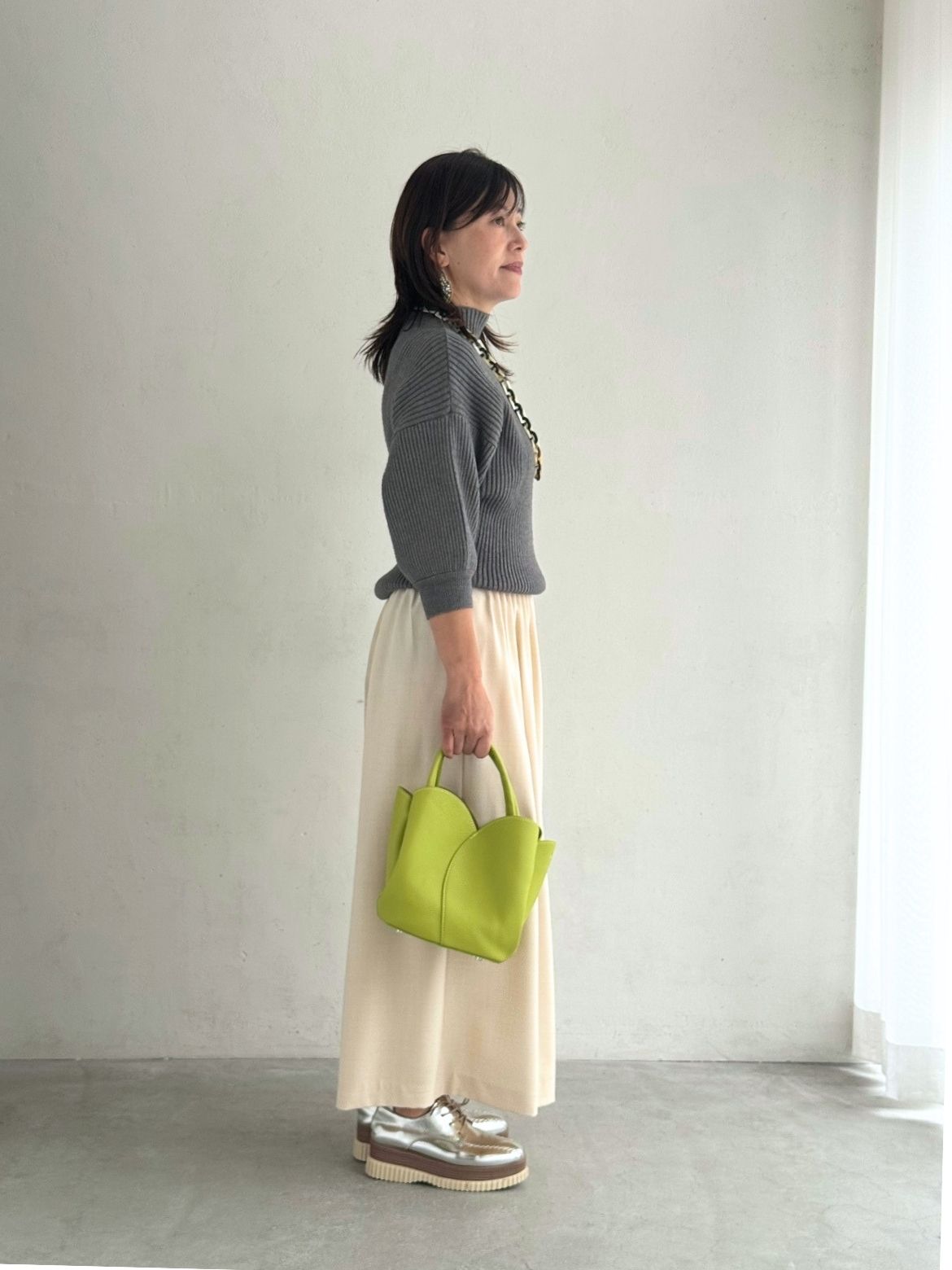 グレーの袖ふんわりニットで優しい印象を演出し、アイボリーのワイドパンツで抜け感とゆったりシルエットをプラス。シルバーカラーの厚底シューズでさりげないモード感を添え、黄緑色のバッグをアクセントにすることで、落ち着きのある大人カジュアルスタイルに遊び心を加えています。