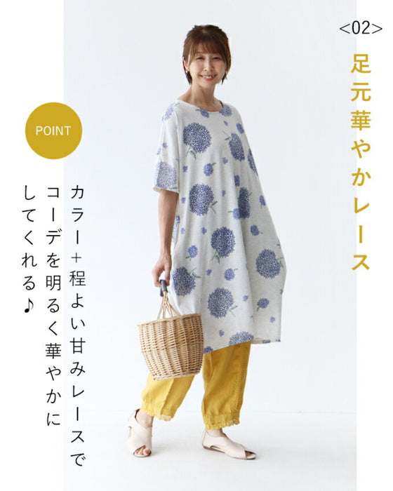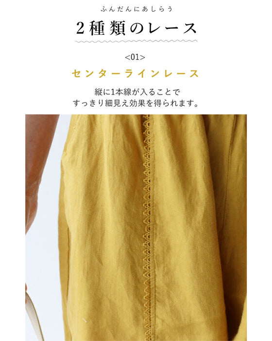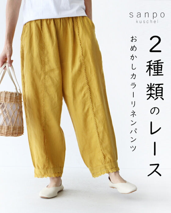 パンツ 裾レース 体型カバー【2種類のレースおめかしカラーリネンパンツ】ウエストゴム 涼しい 麻 イエロー 黄色 綺麗 かわいい 素敵 楽パン 快適 お出かけ 女子会 レディース カジュアル かわいい 個性的 どこにもない ゆったり 30代 40代 50代 60代 sanpo【b13130ps】