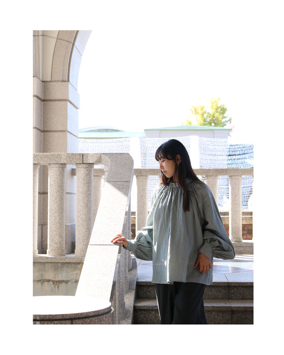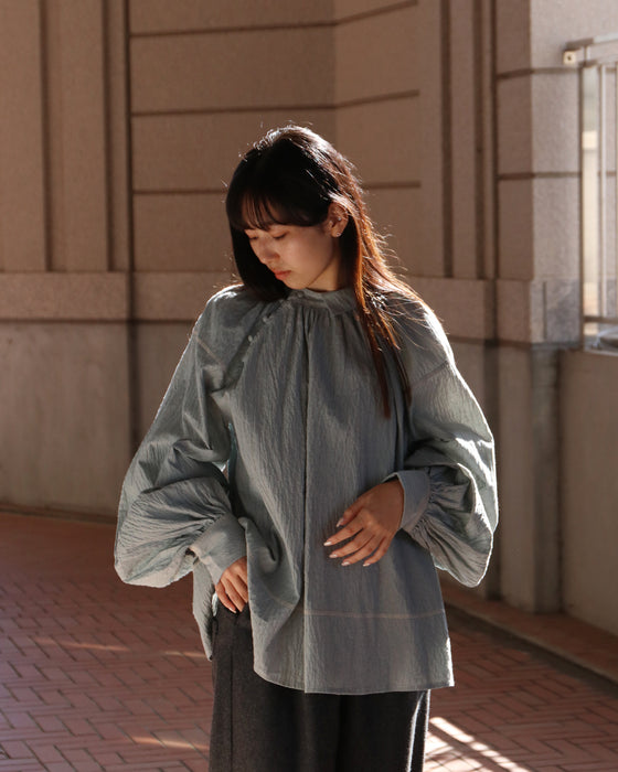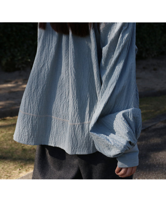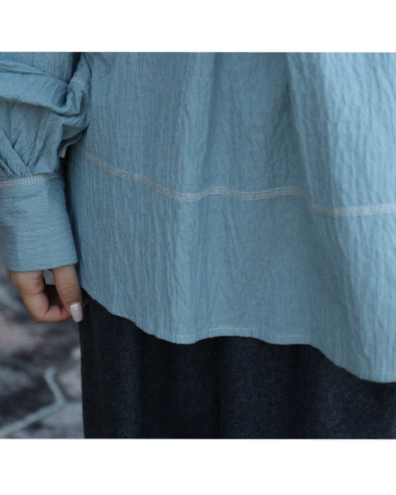 くるみボタンが上品な拘りの多いデザインブラウス。