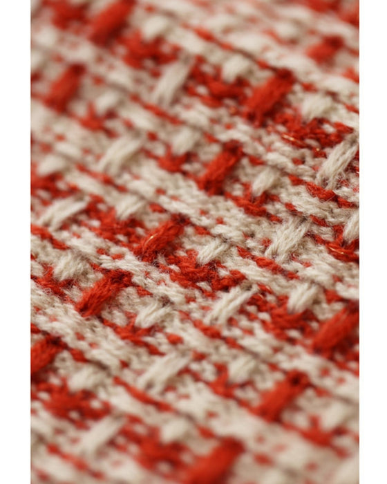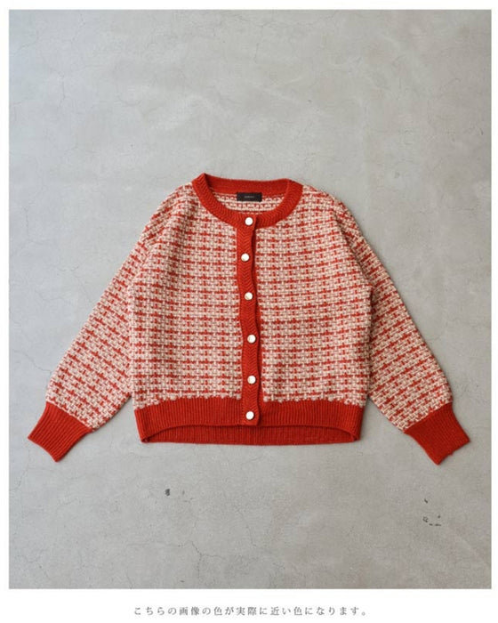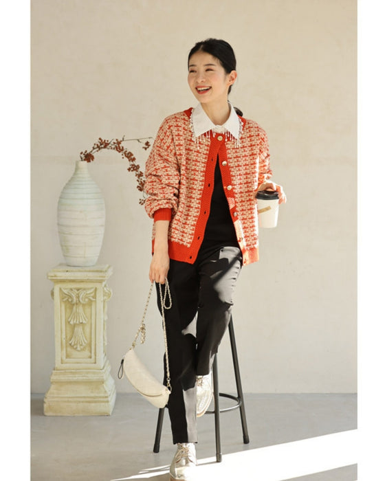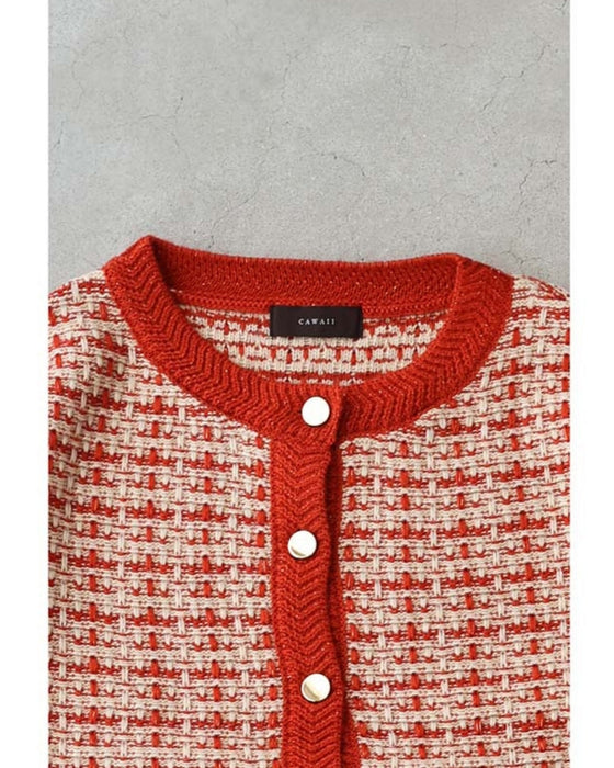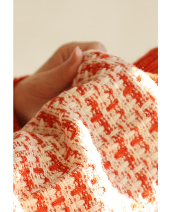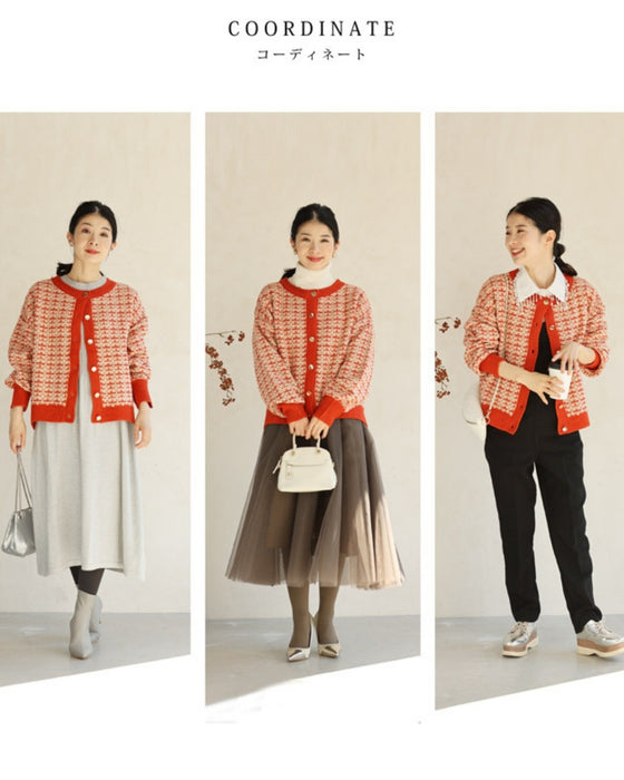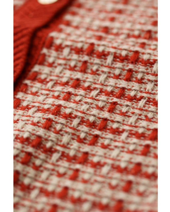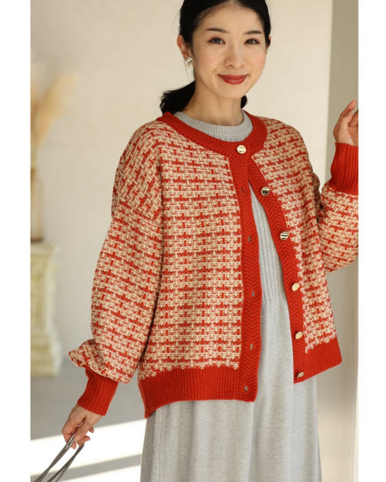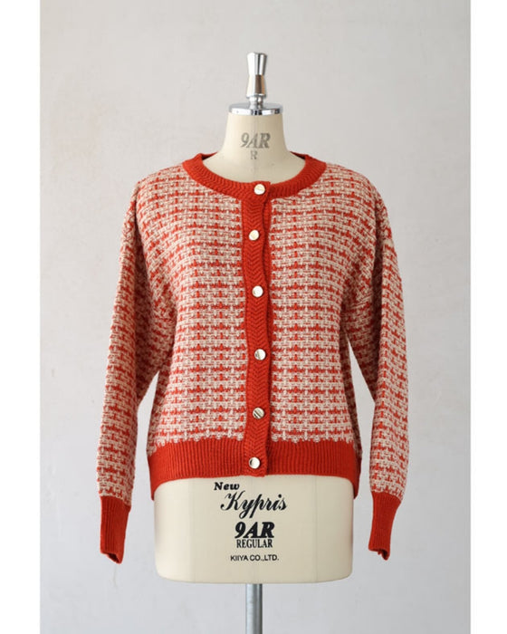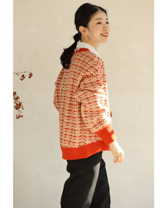 温かみあるみかん色のツイード風チェックニットカーディガン
