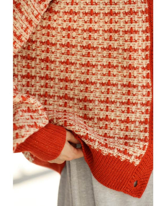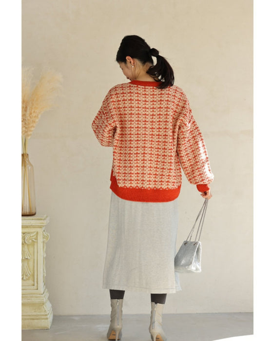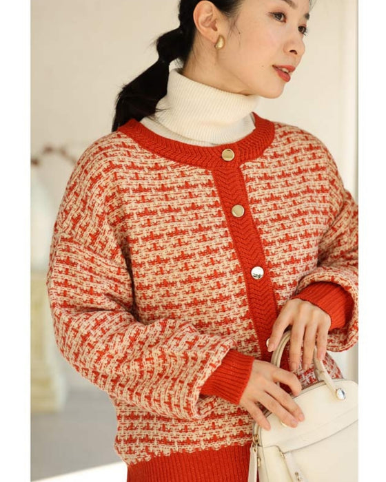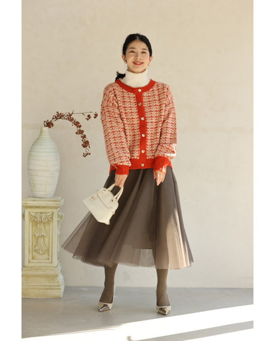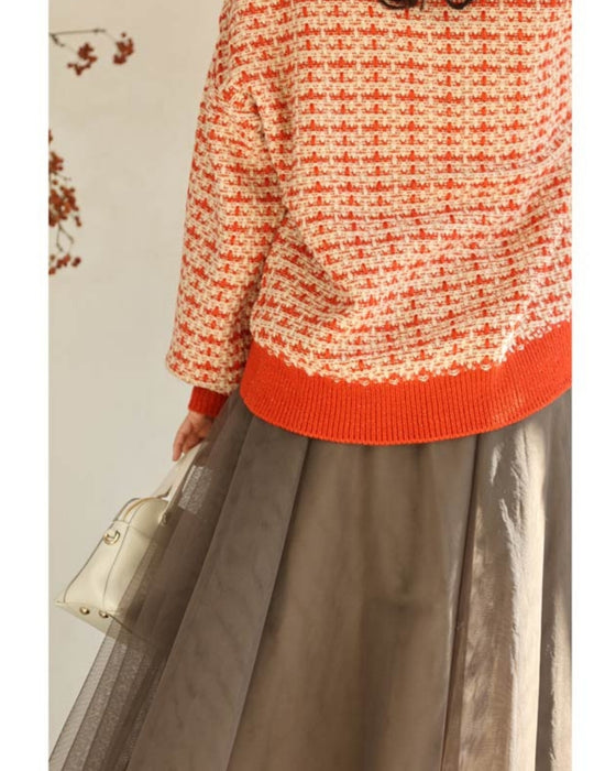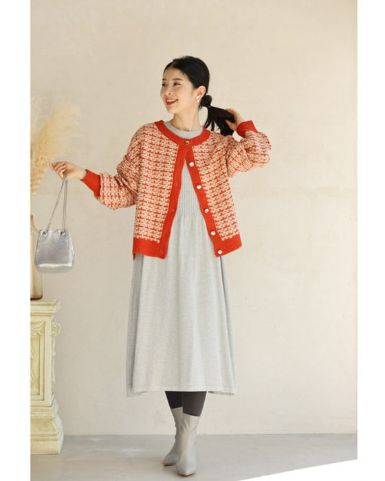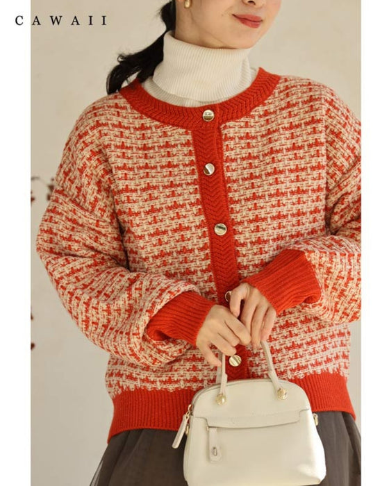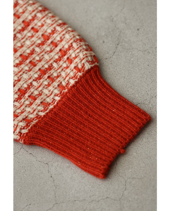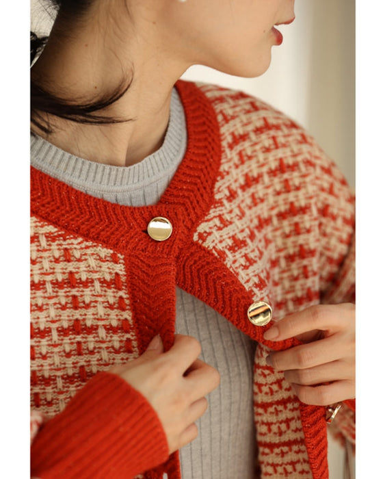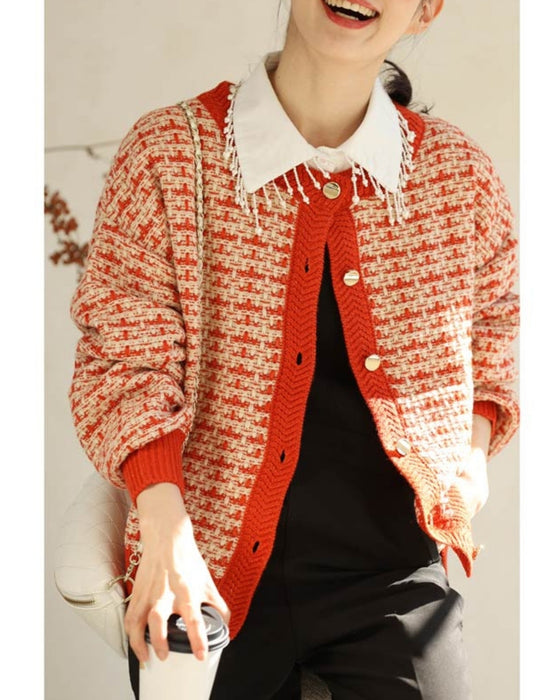 温かみあるみかん色のツイード風チェックニットカーディガン