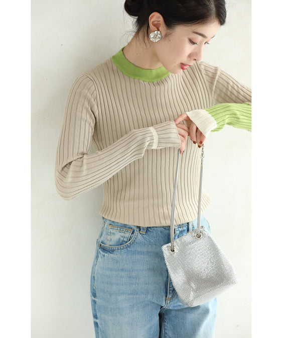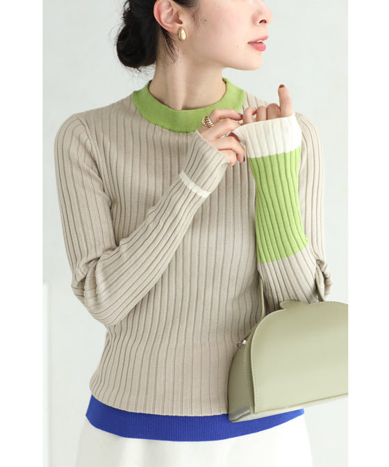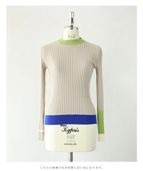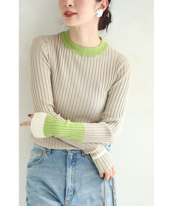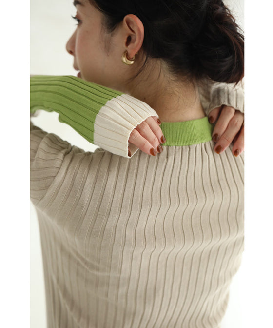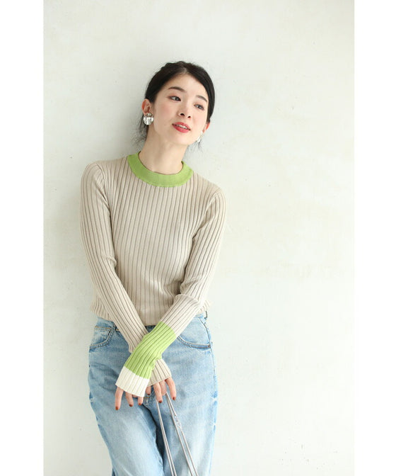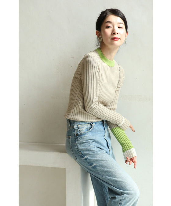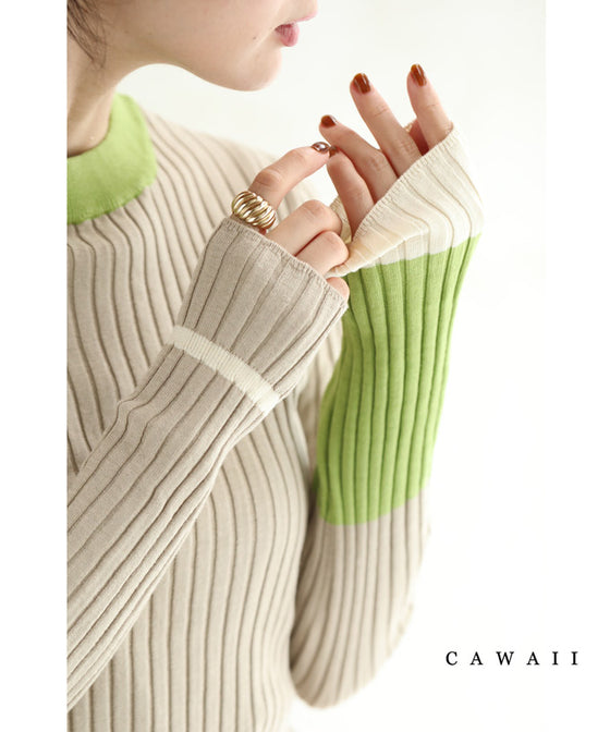 アシンメトリーなカラーリング袖のリブニットカットソートップス