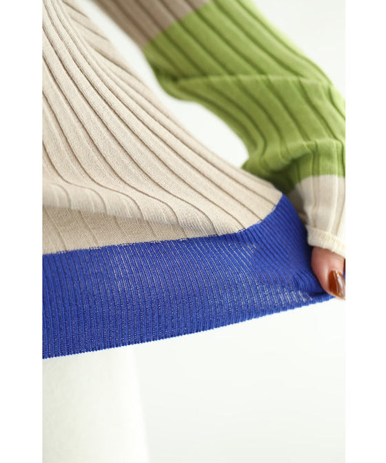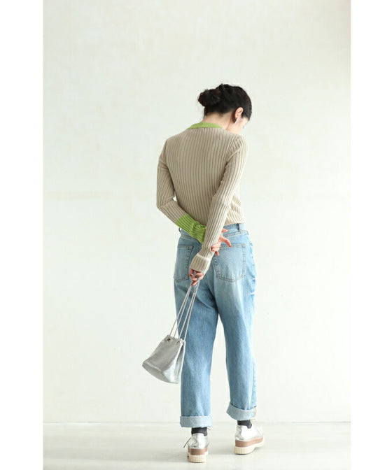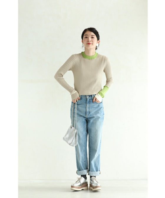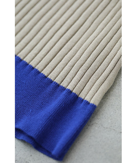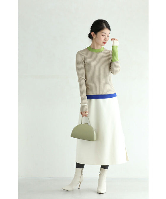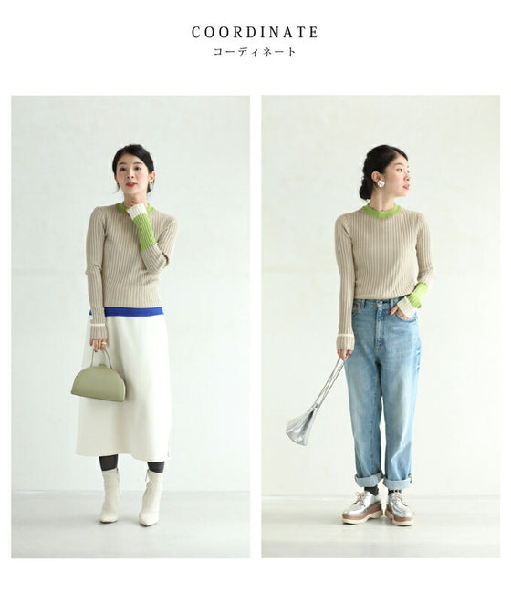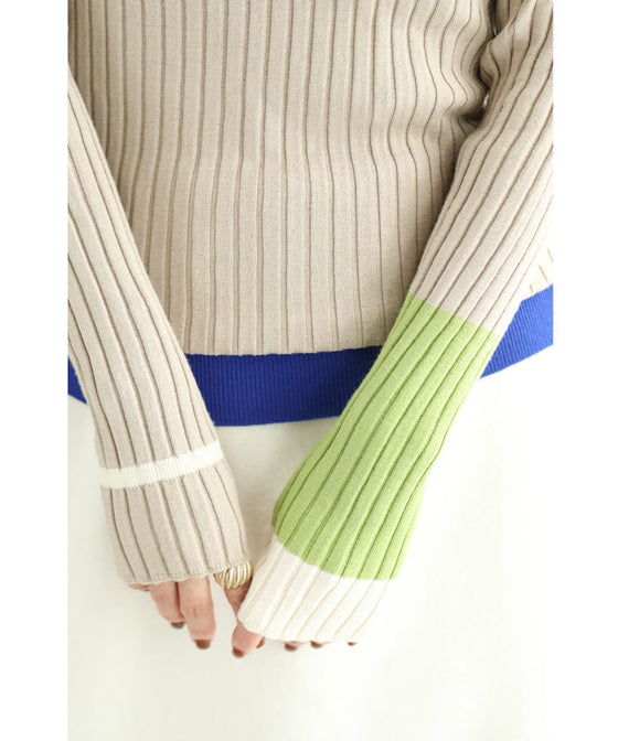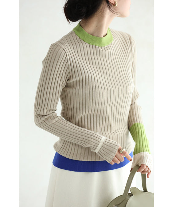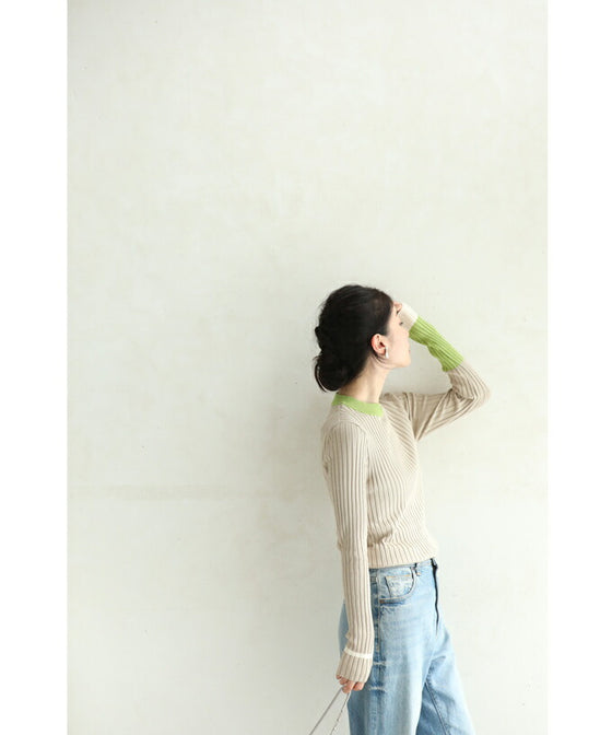 アシンメトリーなカラーリング袖のリブニットカットソートップス