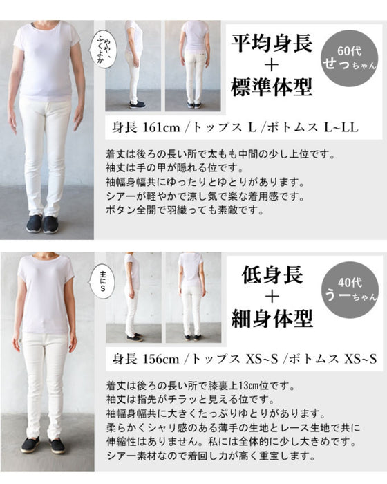 透け感の上品なシアー素材。スルっとした滑らかな肌触りの光沢感のある上品素材で透け感があるので見た目の印象も涼し気。