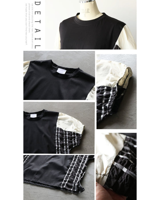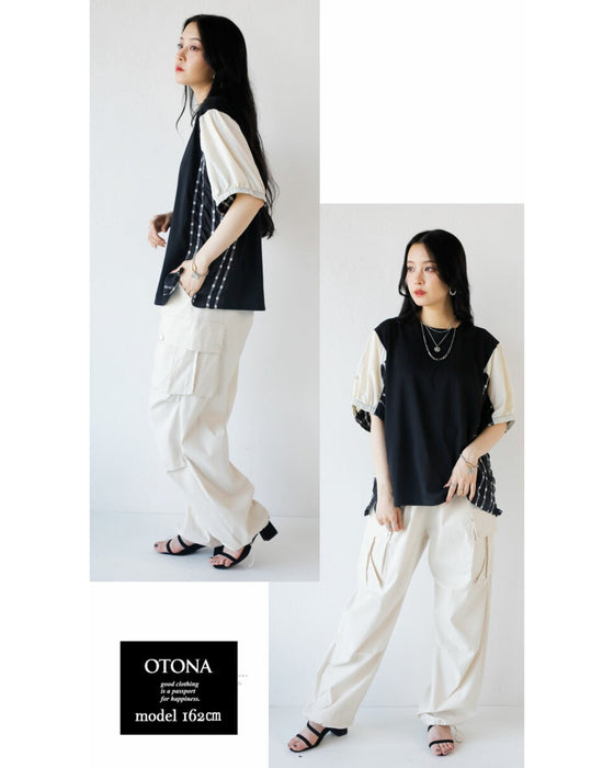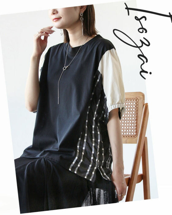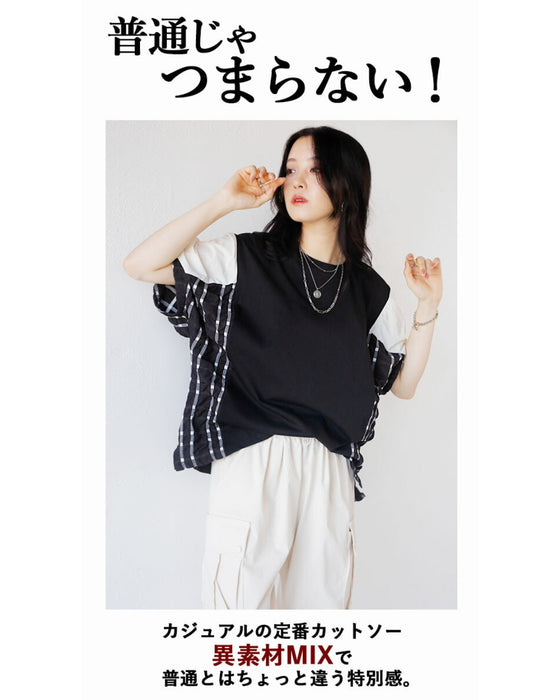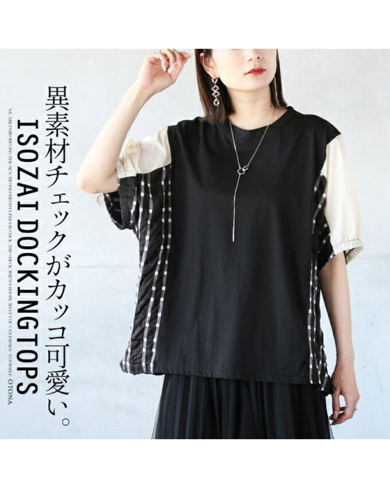 異素材チェックがカッコ可愛い異素材ドッキングトップス
