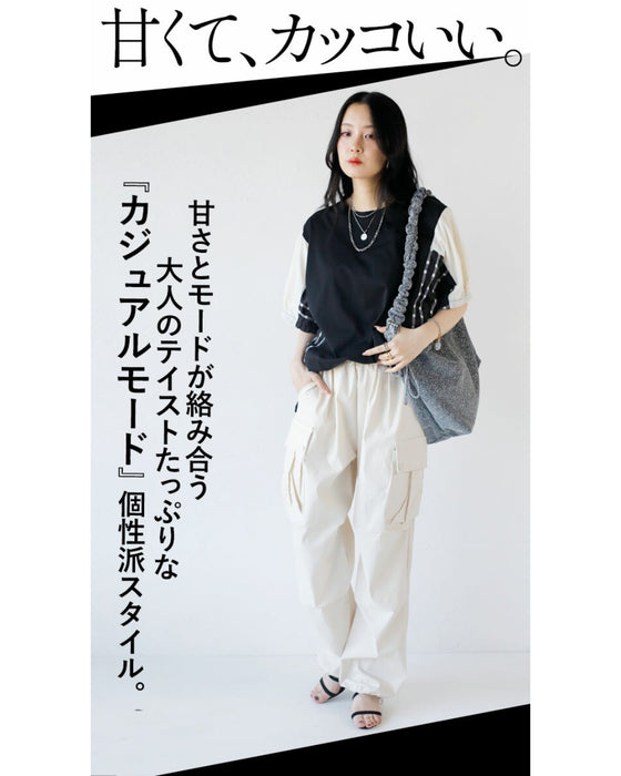 どこにも締め付け感のない袖幅身幅共に程よくゆとりがあり動きも楽でデイリーに使いやすい。異なる素材のかけ合わせが何ともお洒落で着るだけで甘辛モードに仕上げてくれる!