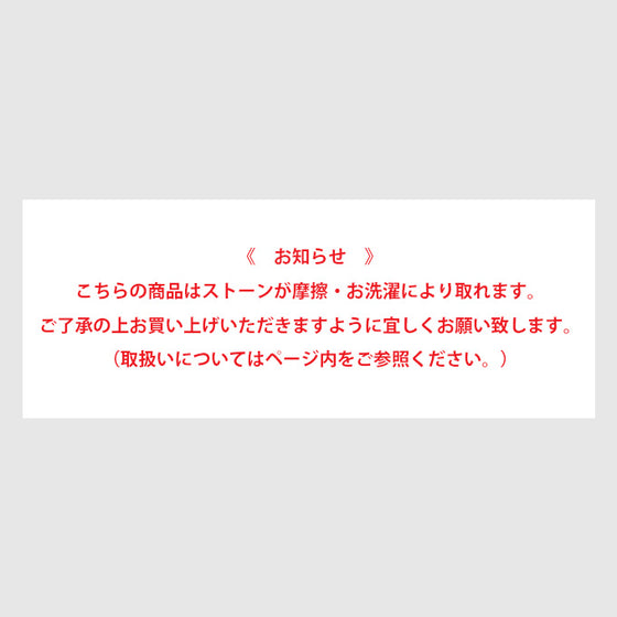 こちらの商品はストーンが摩擦やお洗濯により取れます。ご了承の上お買い上げいただきますよう宜しくお願い致します。