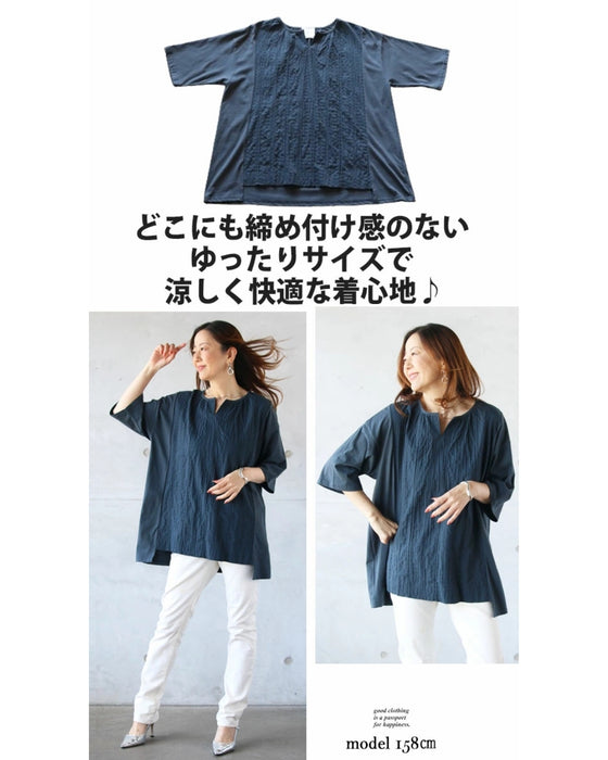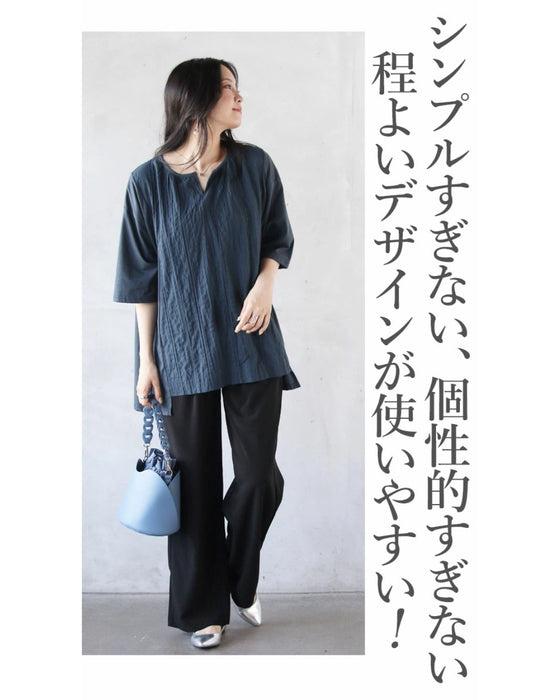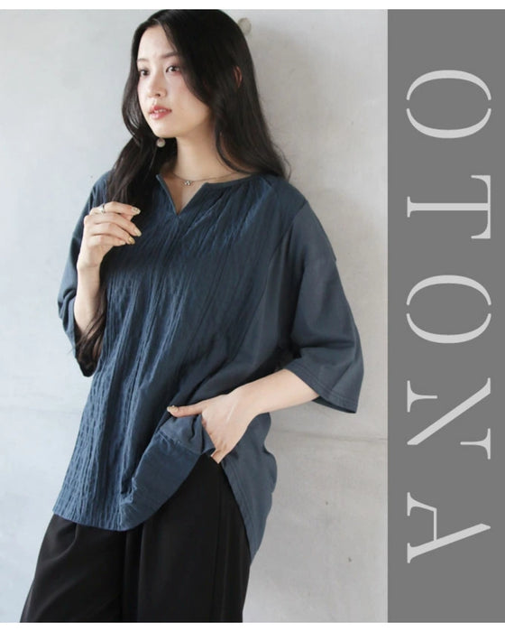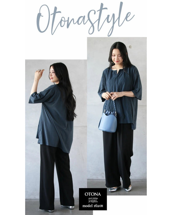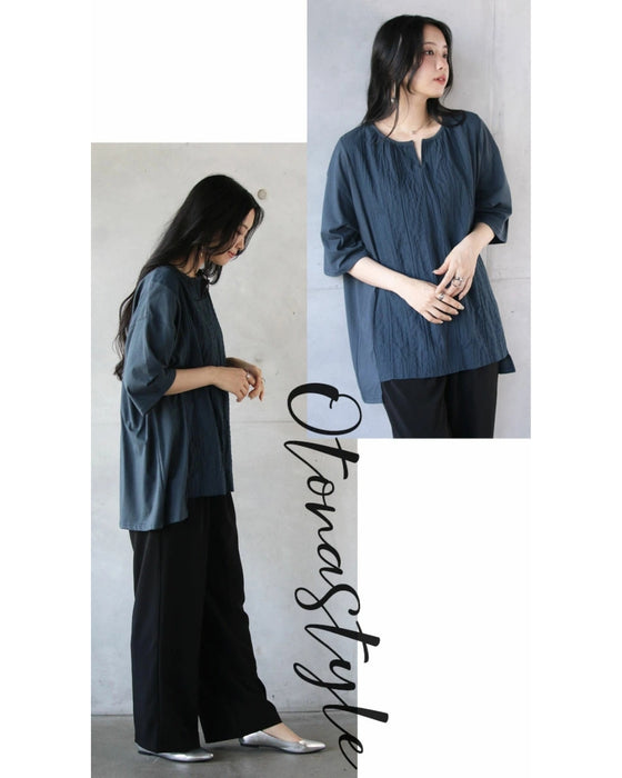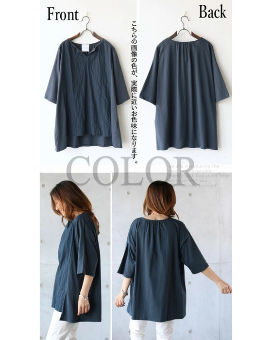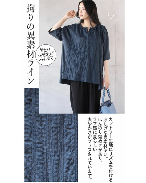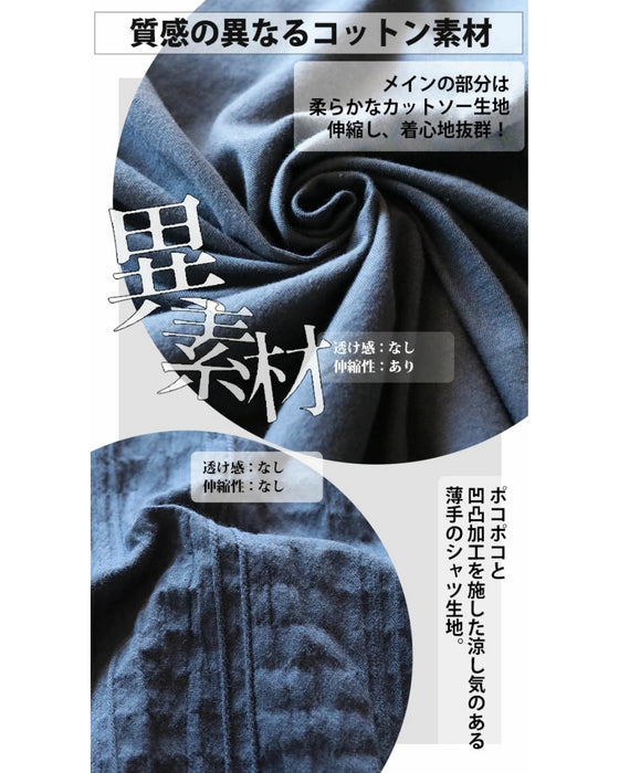 柔らかなカットソー生地と、ポコポコとした凹凸加工を施した涼し気のある薄手のシャツ生地の、異なる綿素材。汗ばむ季節にも着心地抜群!